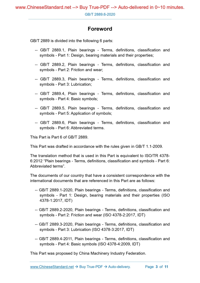 Similar standardsGB/T 2889.6-2020: Plain bearings - Terms, definitions, classification and symbols - Part 6: Abbreviated terms---This is an excerpt. Full copy of true-PDF in English version (including equations, symbols, images, flow-chart, tables, and figures etc.), auto-downloaded/delivered in 9 seconds, can be purchased online: https://www.ChineseStandard.net/PDF.aspx/GBT2889.6-2020 Plain bearings - Terms, definitions, classification and symbols - Part 6.Abbreviated terms ICS 21.100.10 J12 National Standards of People's Republic of China Plain bearing terms, definitions, classifications and symbols Part 6.Abbreviations 2020-06-02 released 2020-12-01 implementation State Administration for Market Regulation Issued by the National Standardization Management Committee PrefaceGB/T 2889 is divided into the following 6 parts. ---GB/T 2889.1 Sliding bearing terms, definitions, classifications and symbols Part 1.Structure, bearing material and its performance; ---GB/T 2889.2 Sliding bearing terms, definitions, classifications and symbols Part 2.Friction and wear; ---GB/T 2889.3 Sliding bearing terms, definitions, classifications and symbols Part 3.Lubrication; ---GB/T 2889.4 Sliding Bearing Terms, Definitions and Classification Part 4.Basic Symbols; ---GB/T 2889.5 Plain bearing terms, definitions, classifications and symbols Part 5.Application of symbols; ---GB/T 2889.6 Sliding Bearing Terms, Definitions, Classification and Symbols Part 6.Abbreviations. This part is Part 6 of GB/T 2889. This section was drafted in accordance with the rules given in GB/T 1.1-2009. The translation method used in this part is equivalent to the adoption of ISO /T R4378-6.2012 "Terminals, Definitions, Classification and Symbols of Sliding Bearings Part 6 Points. Abbreviations. The Chinese documents that have a consistent correspondence with the international documents cited in this section are as follows. ---GB/T 2889.1-2020 Sliding bearing terms, definitions, classifications and symbols Part 1.Structure, bearing materials and properties Yes (ISO 4378-1.2017, IDT) ---GB/T 2889.2-2020 Plain bearing terms, definitions, classifications and symbols Part 2.Friction and wear (ISO 4378-2.2017, IDT) ---GB/T 2889.3-2020 sliding bearing terms, definitions, classifications and symbols Part 3.Lubrication (ISO 4378-3. 2017, IDT) ---GB/T 2889.4-2011 Sliding bearing terms, definitions and classification Part 4.Basic symbols (ISO 4378-4.2009, IDT) This part was proposed by China Machinery Industry Federation. This part is under the jurisdiction of the National Sliding Bearing Standardization Technical Committee (SAC/TC236). Responsible for drafting this section. China National Machinery Productivity Promotion Center, Shanghai Jiaotong University. Participating in the drafting of this section. Luoyang Shaft Research Technology Co., Ltd., Xi'an Jiaotong University, Lin'an Dongfang Sliding Bearing Co., Ltd. Feibolin New Materials Co., Ltd. This part is explained by the National Standardization Technical Committee of Sliding Bearings.introductionDue to the large number of parameter symbols and terminologies named in multiple ways in the field of sliding bearings, the interpretation of standards and technical documents It is easy to cause misunderstanding in the process. This situation has caused the continuous increase of supplementary definitions and further aggravated the possibility of misunderstanding. This part of GB/T 2889 aims to describe a unified abbreviation symbol system. Plain bearing terms, definitions, classifications and symbols Part 6.Abbreviations1 ScopeThis part of GB/T 2889 provides common abbreviations and their original terms related to sliding bearings.2 Normative referencesThe following documents are indispensable for the application of this document. For dated reference documents, only the dated version applies to this article Pieces. For undated references, the latest version (including all amendments) applies to this document. ISO 4378-1 Plain bearing terms, definitions, classifications and symbols Part 1.Structure, bearing material and its performance ISO 4378-2 Plain bearing terms, definitions, classifications and symbols Part 2.Friction and wear ISO 4378-3 Plain bearing terms, definitions, classifications and symbols Part 3.Lubrication ISO 4378-4 Plain Bearing Terms, Definitions, Classification and Symbols Part 4.Basic Symbols ISO 4378-5 Plain bearing terms, definitions, classifications and symbols Part 5.Application of symbols3 AbbreviationsThe terms, definitions and symbols defined by ISO 4378-1, ISO 4378-2, ISO 4378-3, ISO 4378-4, ISO 4378-5 apply to this file. Each abbreviation is an abbreviation of a term or phrase related to sliding bearing. Usually (but not all) take one of the words or phrases One or a group of letters. The following acronyms do not list all relevant acronyms. If necessary, it may be expanded. Abbreviations in Roman alphabet order Sequence arrangement. AAS. Atomic Absorption Spectrometry AE. audio emission inspection AES. Auger Electron Spectroscopy ATF. Automatic transmission fluid AW. Anti-wear performance BEM. boundary element method BS. Backscatter CCS. Cold start simulator CFD. Computational Fluid Dynamics CIP. compact interpolation curve method CA. Average midline CMA. Cylindrical lens analyzer CRT. Cathode Ray Tube CRV. spool resistance value CVD. chemical vapor deposition DDP. zinc dialkyl dithiophosphate DL. Direct lubrication DLC. Diamond-like Carbon DSC. Differential Scanning Calorimetry DTGA. Differential Thermogravimetric Analysis EDX, EDXA. Energy dispersive X-ray analysis EDTA. ethylenediaminetetraacetic acid EELS. electron energy loss spectroscopy EHD, EHL. Elastohydrodynamic lubrication EM. Electron probe EP. Ultimate pressure EPMA. Electron Probe Microscopic Analysis FDM. Finite Difference Method FEM. Finite Element Method FFM. Friction Force Microscope FIM. Electric Field Ion Microscopy FL. oil immersion lubrication FMEA. Failure Mode and Impact Analysis FTA. Fa