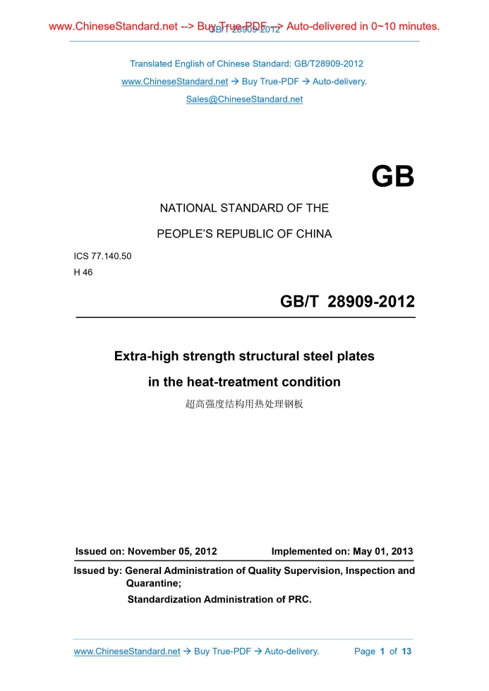 GB/T 28909-2012: Extra-high strength structural steel plates in the heat-treatment condition Delivery: 9 seconds. True-PDF full-copy in English & invoice will be downloaded + auto-delivered via email. See step-by-step procedure Status: Valid