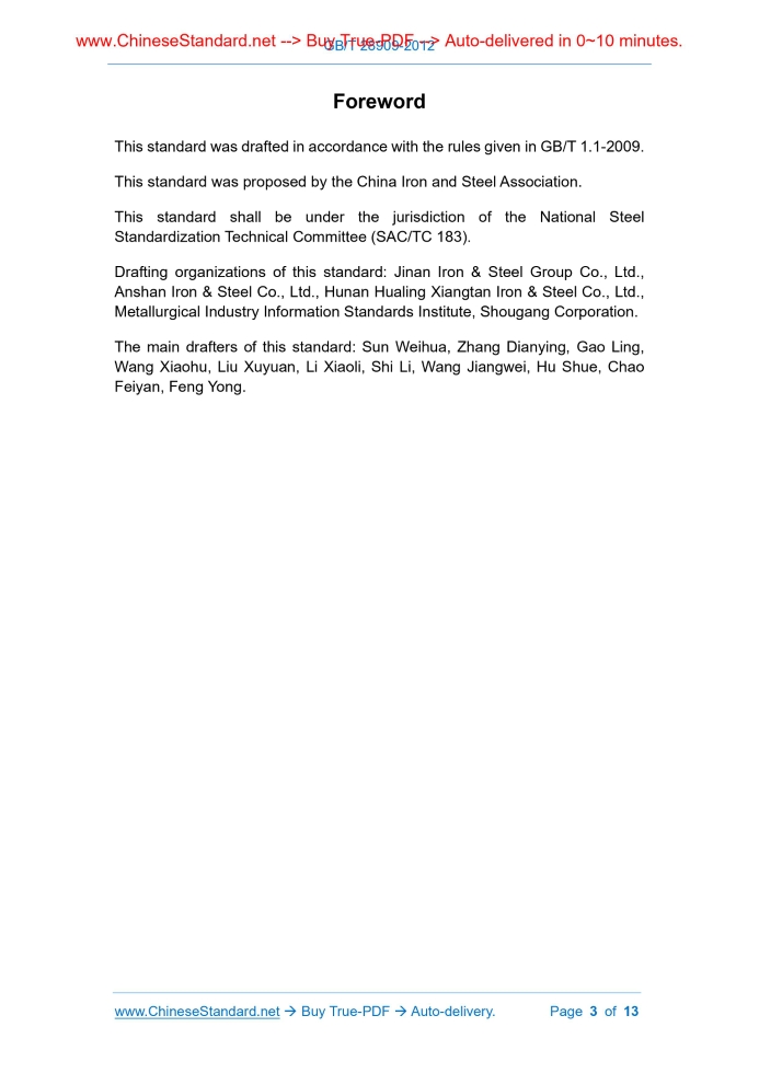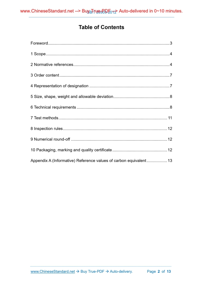 Similar standardsGB/T 28909-2012: Extra-high strength structural steel plates in the heat-treatment condition---This is an excerpt. Full copy of true-PDF in English version (including equations, symbols, images, flow-chart, tables, and figures etc.), auto-downloaded/delivered in 9 seconds, can be purchased online: https://www.ChineseStandard.net/PDF.aspx/GBT28909-2012GB NATIONAL STANDARD OF THE PEOPLE’S REPUBLIC OF CHINA ICS 77.140.50 H 46 Extra-high strength structural steel plates in the heat-treatment condition Issued on. NOVEMBER 05, 2012 Implemented on. MAY 01, 2013 Issued by. General Administration of Quality Supervision, Inspection and Quarantine; Standardization Administration of PRC. Table of ContentsForeword... 3 1 Scope... 4 2 Normative references... 4 3 Order content... 7 4 Representation of designation... 7 5 Size, shape, weight and allowable deviation... 8 6 Technical requirements... 8 7 Test methods... 11 8 Inspection rules... 12 9 Numerical round-off... 12 10 Packaging, marking and quality certificate... 12 Appendix A (Informative) Reference values of carbon equivalent... 13ForewordThis standard was drafted in accordance with the rules given in GB/T 1.1-2009. This standard was proposed by the China Iron and Steel Association. This standard shall be under the jurisdiction of the National Steel Standardization Technical Committee (SAC/TC 183). Drafting organizations of this standard. Jinan Iron & Steel Group Co., Ltd., Anshan Iron & Steel Co., Ltd., Hunan Hualing Xiangtan Iron & Steel Co., Ltd., Metallurgical Industry Information Standards Institute, Shougang Corporation. The main drafters of this standard. Sun Weihua, Zhang Dianying, Gao Ling, Wang Xiaohu, Liu Xuyuan, Li Xiaoli, Shi Li, Wang Jiangwei, Hu Shue, Chao Feiyan, Feng Yong. Extra-high strength structural steel plates in the heat-treatment condition1 ScopeThis standard specifies the ordering content, designation indication method, size, shape, weight and allowable deviation, technical requirements, test methods, inspection rules, packaging, marking and quality certificate of extra- high strength structural steel plates in the heat-treatment condition. This standard is applicable to steel plates with a thickness of not more than 50 mm for construction machinery such as mines, buildings and agriculture.2 Normative referencesThe following documents are essential to the application of this document. For the dated documents, only the versions with the dates indicated are applicable to this document; for the undated documents, only the latest version (including all the amendments) are applicable to this standard. GB/T 222 Permissible tolerances for chemical composition of steel products GB/T 223.3 Methods for chemical analysis of steels and alloys - Determination of phosphorus content by diantipyryl methane phosphomolybdate gravimetric method GB/T 223.9 Iron steel and alloy - Determination of aluminum content - Chrom azurol S photometric method GB/T 223.11 Iron, steel and alloy - Determination of chromium content - Visual titration or potentiometric titration method GB/T 223.12 Methods for chemical analysis of iron, steel and alloy - The sodium carbonate separation-diphenyl carbazide photometric method for the determination of chromium content GB/T 223.13 Methods for chemical analysis of iron, steel and alloy - The ammonium ferrous sulfate titration method for the determination of vanadium content GB/T 223.14 Methods for chemical analysis of iron, steel and alloy - The N- Benzoy-N-Phenylhydroxylamine extraction photometric method for the determination of vanadium content GB/T 223.17 Methods for chemical analysis of steels and alloy - The diantipyrylmethane photometric method for the determination of titanium content3 Order contentThe purchaser shall provide at least the following information when ordering.4 Representation of designationThe steel designation consists of three parts. the Chinese pinyin letters representing the yield strength, the lower limit value of the specified yield strength, the quality grade symbol. For example. Q1200D, wherein.5 Size, shape, weight and allowable deviation5.1 Unevenness 5.1.1 The unevenness of the steel plate shall comply with the requirements of Class N in Table 1.Through negotiation between the supplier and the purchaser and as indicated in the contract, the unevenness may also be in accordance with the provisions of the Class S in Table 1. 5.1.3 When the waveform spacing (the distance between the ruler and the contact point of the steel plate) is 300 mm ~ 1000 mm, for the Class N unevenness, the maximum allowable value of the unevenness is 1.5% of the waveform spacing, and does not exceed the value specified in Table 1; for the Class S unevenness, the maximum allowable value of the unevenness is 1% of the waveform spacing, and does not exceed the value specified in Table 1. 5.3 Through negotiation between the supplier and the purchaser, it may also supply the steel plates of other sizes, shapes, weights and allowable deviations.6 Technical requirements6.1 Designation and chemical composition 6.1.1 The designation and chemical composition of the steel (melting analysis) 6.1.1.4 According to the user’s requirements, through negotiation between the supplier and the purchaser, it may specify the carbon equivalent of each designation. The carbon equivalent is calculated according to formula (1) (Appendix A lists the reference value of carbon equivalent). 6.1.2 The allowable deviation of the chemical composition of the finished steel plate shall comply with the provisions of GB/T 222. 6.2 Smelting method The steel is smelted by a converter or an electric furnace, refined outside the furnace. 6.4 Mechanical properties 6.4.1 The mechanical properties of the steel plate shall comply with the requirements of Table 3. 6.5 Surface quality 6.5.1 The surface of steel plates shall be free from cracks, air bubbles, crusting, folding, inclusions, or other defects. The steel plate shall not be