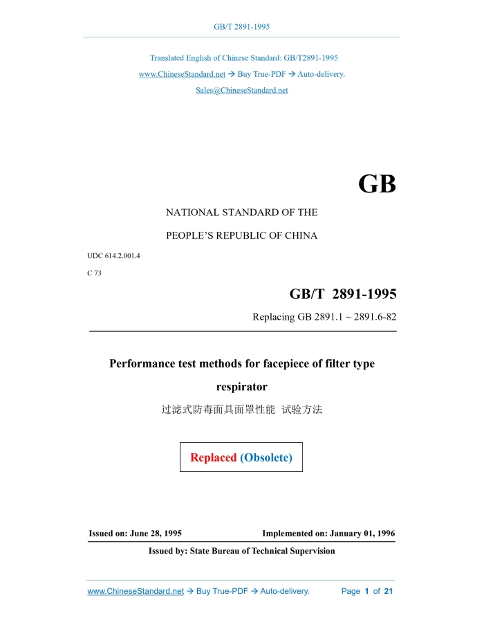 GB/T 2891-1995: Performance test methods for facepiece of filfer type respirator Delivery: 9 seconds. True-PDF full-copy in English & invoice will be downloaded + auto-delivered via email. See step-by-step procedure Status: Obsolete GB/T 2891: Historical versions