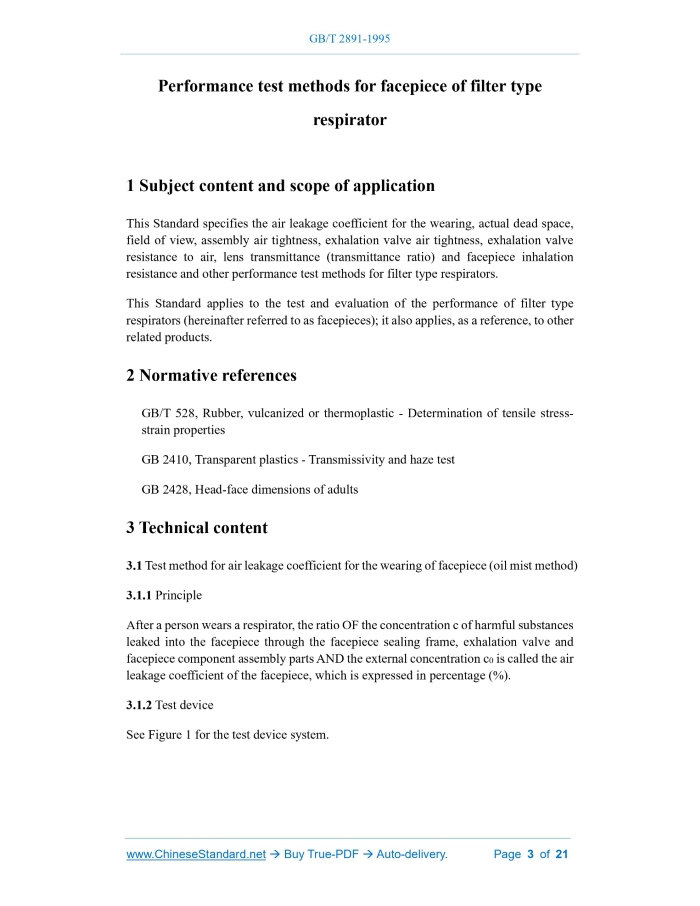 GB/T 2891-1995: Performance test methods for facepiece of filfer type respirator---This is an excerpt. Full copy of true-PDF in English version (including equations, symbols, images, flow-chart, tables, and figures etc.), auto-downloaded/delivered in 9 seconds, can be purchased online: https://www.ChineseStandard.net/PDF.aspx/GBT2891-1995GB NATIONAL STANDARD OF THE PEOPLE’S REPUBLIC OF CHINA UDC 614.2.001.4 C 73 Replacing GB 2891.1 ~ 2891.6-82 Performance test methods for facepiece of filter type respirator Issued on. JUNE 28, 1995 Implemented on. JANUARY 01, 1996 Issued by. State Bureau of Technical Supervision Replaced (Obsolete) Table of Contents1 Subject content and scope of application... 3 2 Normative references... 3 3 Technical content... 3 Additional information... 21 Performance test methods for facepiece of filter type respirator1 Subject content and scope of applicationThis Standard specifies the air leakage coefficient for the wearing, actual dead space, field of view, assembly air tightness, exhalation valve air tightness, exhalation valve resistance to air, lens transmittance (transmittance ratio) and facepiece inhalation resistance and other performance test methods for filter type respirators. This Standard applies to the test and evaluation of the performance of filter type respirators (hereinafter referred to as facepieces); it also applies, as a reference, to other related products.2 Normative referencesGB/T 528, Rubber, vulcanized or thermoplastic - Determination of tensile stress- strain properties GB 2410, Transparent plastics - Transmissivity and haze test GB 2428, Head-face dimensions of adults3 Technical content3.1 Test method for air leakage coefficient for the wearing of facepiece (oil mist method) 3.1.1 Principle After a person wears a respirator, the ratio OF the concentration c of harmful substances leaked into the facepiece through the facepiece sealing frame, exhalation valve and facepiece component assembly parts AND the external concentration c0 is called the air leakage coefficient of the facepiece, which is expressed in percentage (%). 3.1.3 Test conditions 3.1.3.1 According to the fit range of each facepiece, select 10 persons whose head and face size meet the fitting test. Subjects shall be clean-shaven. 3.1.4 Test procedures 3.1.4.1 Preparation 3.1.5 Test result 3.1.5.1 Calculate the air leakage coefficient kx of the nth subject in any state of static, dynamic or speaking according to Formula (1) and Formula (2). 3.2 Test method for the actual dead space of the facepiece 3.2.1 Principle Correctly wear the facepiece under test on the standard head-face; use the mechanical lung to perform simulated breathing according to the specified conditions, so that the exhaled gas is CO2 gas with a high concentration of a, part of which is trapped in the actual dead space and “respiratory dead space”, and diluted by the air inhaled through the canister during inhaling (assuming that its CO2 concentration is c), becoming a gas with a concentration of b, and enters the mechanical lung. 3.2.3 Device 3.6.4 Test result The resistance to air flow for each exhalation valve sample is. 3.6.5 Test report According to 3.1.6. 3.7 Test method for mask inhalation resistance 3.7.1 Test device 3.7.1.1 See Figure 7 for the mask inhalation resistance test device. Figure 7 – Diagram of the test device for mask inhalation resistance 3.7.1.6 Air pump. the suction flow rate shall not be lower than 30 L/min. 3.7.3 Test procedures 3.7.3.1 Check that each connecting part of the test device shall be airtight. 3.7.3.2 Make the flowmeter and micromanometer work normally. 3.7.3.3 Start the air pump; adjust the screw clamp so that the air flow is 30 ± 0.6 L/min; measure the system resistance P1. 3.7.3.4 Wear the facepiece according to the requirements of 3.7.2.2; adjust the suction flow to 30 ± 0.6 L/min; measure the resistance P2. 3.10 Test method for hot air aging of the exhalation valve 3.10.1 Principle Measure the air tightness of the exhalation valve block of qualified air-tightness after aging for a certain period of time under the action of hot air at normal pressure and specified temperature. 3.10.2 Test device The hot air aging box shall meet the following requirements. 3.10.4 Test procedures 3.10.4.1 Adjust the temperature in the aging box to 100 ± 2 °C. After the temperature is stable, place the test sample on the valve seat and seal it in the aging box in a free state. The distance between the samples is not less than 5 mm; the distance between the sample and the box wall is not less than 50 mm. 3.11.3 Test procedures 3.11.3.1 Clamp the lower part of the Y-shaped tube of the facepiece that has been assembled and placed for 24 hours into the main clamp of the tensile machine. The direction of the clamp shall be perpendicular to the Y-shaped tube. 3.11.3.2 Clamp the lower end of the air duct into the lower fixture so that the lower fixture is about 20 ~ 30 mm away from the Y-shaped nozzle. Turn on the tensile machine, and stop the test when the reading on the load dial is greater than the specified value. 3.11.4 Test result Read the bonding strength value from the load dial respectively; it is qualified when the reading is greater than the specified value. 3.11.5 Test report According to 3.1.6. ......Source: Above contents are excerpted from the full-copy PDF -- translated/reviewed by: www.ChineseStandard.net / Wayne Zheng et al. Tips & Frequently Asked Questions:Question 1: How long will the true-PDF of English version of GB/T 2891-1995 be delivered?Answer: The full copy PDF of English version of GB/T 2891-1995 can be downloaded in 9 seconds, and it will also be emailed to you in 9 seconds (double mechanisms to ensure the delivery reliably), with PDF-invoice.Question 2: Can I share the purchased PDF of GB/T 2891-1995_English with my colleagues?Answer: Yes. The purchased PDF of GB/T 2891-1995_English will be deemed to be sold to your employer/organization who actually p