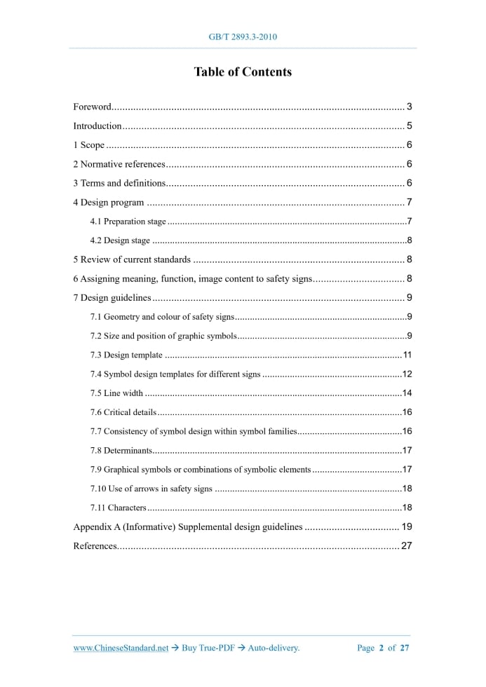 Similar standardsGB/T 2893.3-2010: Graphical symbols -- Safety colours and safety signs -- Part 3: Design principles for graphical symbols used in safety signs---This is an excerpt. Full copy of true-PDF in English version (including equations, symbols, images, flow-chart, tables, and figures etc.), auto-downloaded/delivered in 9 seconds, can be purchased online: https://www.ChineseStandard.net/PDF.aspx/GBT2893.3-2010 NATIONAL STANDARD OF THE PEOPLE’S REPUBLIC OF CHINA ICS 01.080.10 A 22 Graphical symbols - Safety colors and safety signs - Part 3: Design principles for graphical symbols for use in safety signs (ISO 3864-3:2006, MOD) ISSUED ON: JANUARY 10, 2011 IMPLEMENTED ON: JULY 01, 2011 Issued by: General Administration of Quality Supervision, Inspection and Quarantine of PRC; Standardization Administration of PRC. Table of ContentsForeword ... 3 Introduction ... 5 1 Scope ... 6 2 Normative references ... 6 3 Terms and definitions... 6 4 Design program ... 7 4.1 Preparation stage ... 7 4.2 Design stage ... 8 5 Review of current standards ... 8 6 Assigning meaning, function, image content to safety signs ... 8 7 Design guidelines ... 9 7.1 Geometry and colour of safety signs ... 9 7.2 Size and position of graphic symbols ... 9 7.3 Design template ... 11 7.4 Symbol design templates for different signs ... 12 7.5 Line width ... 14 7.6 Critical details ... 16 7.7 Consistency of symbol design within symbol families ... 16 7.8 Determinants ... 17 7.9 Graphical symbols or combinations of symbolic elements ... 17 7.10 Use of arrows in safety signs ... 18 7.11 Characters ... 18 Appendix A (Informative) Supplemental design guidelines ... 19 References ... 27 Graphical symbols - Safety colors and safety signs - Part 3: Design principles for graphical symbols for use in safety signs Important note: Although the colors in the printed version of this Part of GB/T 2893 meet (within tolerance according to visual inspection) the requirements of GB/T 2893.1, the printed version is not used for color matching. For requirements on color matching, please refer to GB/T 2893.1, for the stipulations of chromaticity attributes and photometric attributes of safety colors and the reference values of safety colors, in the color system.1 ScopeThis Part of GB/T 2893 gives the design principles, criteria, guidelines for graphic symbols for safety signs. This Part applies to the design of graphic symbols in the safety signs, which are specified in GB/T 2893.1. It also applies to the design of the elements of safety signs, in the product safety labels, which are specified in GB/T 2893.2.2 Normative referencesThe following documents are essential for the application of this document. For dated references, only the dated version applies to this document. For undated references, the latest edition (including all amendments) applies to this document. GB/T 2893.1-2004 Graphical symbols - Safety colors and safety signs - Part 1: Design principles for safety signs in workplaces and public areas (ISO 3864-1:2002, MOD) GB/T 2893.2 Graphical symbols - Safety colors and safety signs - Part 2: Design principles for product safety labels (GB/T 2893.2-2008, ISO 3864-2:2004, MOD) GB/T 15565 (all parts) Graphical symbols - Terms3 Terms and definitionsThe terms and definitions, which are established in GB/T 15565, apply to this document. For convenience, some terms in GB/T 15565 are repeated below. 3.1 Critical detail Symbolic details, which are essential to the understanding of graphic symbols OR the completeness of graphic symbols. [GB/T 15565.1-2008, Definition 3.11] 3.2 Determinant A symbol element, that is attached to a general symbol or other graphic symbol, to provide some certainty or additional information. It cannot be used alone. [GB/T 15565.1-2008, Definition 3.7]4 Design program4.1 Preparation stage Before designing graphic symbols for safety signs, it shall: a) Describe the information to be expressed by the graphic symbols, in detail and without error; b) Confirm whether it is necessary to design new graphic symbols for safety signs (that is, confirm that no suitable graphic symbols currently exist) (see Chapter 5); c) Clarify the safety information to be conveyed by the safety sign, which is formed by the graphic symbol; d) First determine the characteristics of the target group, including the general skills and ability of the target group, to understand the safety information, which is conveyed by the specific safety sign; then design the graphic symbol for this target group; e) Assign meaning and function to safety signs, in accordance with the provisions of Chapter 6; f) Determine the type of signs, which are required for the safety sign, according to the provisions of 7.1. 4.2 Design stage 4.2.1 Consideration should be given to whether the designed graphic symbol can also be used in other types of safety signs, as well as the resulting impact on the design of the symbol (for example, the influence of adding a negative straight bar to the graphic symbol originally designed for the instruction sign, on the design of the symbol; the influence on the design of the symbol, when the graphic symbol is used in the restricted space of the triangle of the warning sign, etc.). 4.2.2 The design of graphic symbols shall comply with the design criteria, which is specified in Chapter 7. 4.2.3 It should use the design guidelines, which are given in Appendix A.5 Review of current standards5.1 The designer shall determine: a) Whether the graphic symbols to be designed have been included in the safety signs, which are stipulated in the current national standards for safety signs, AND other current national standards for graphic symbols; b) Whether it is possible to modify or combine graphic symbols, which have similar meanings, to form graphic symbols in the new safety sign; c) Whether there are standardized determinants, which are suitable for use with the pictorial symbols for the new safety sign (see 7.8). 5.2 If a specific gra