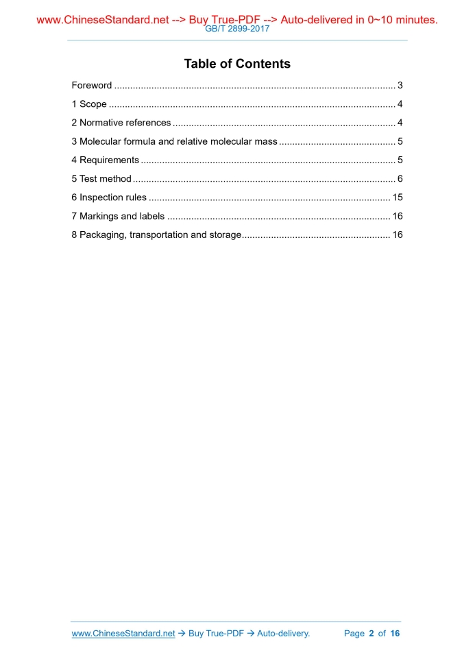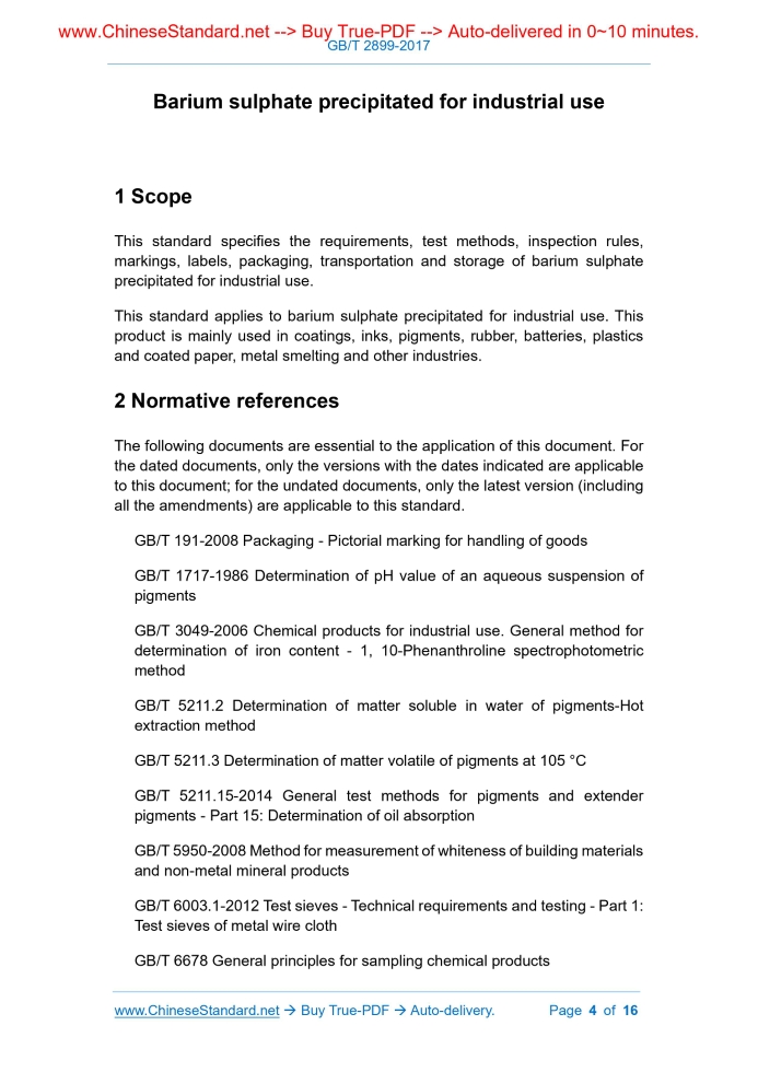 GB/T 2899-2017: Barium sulphate precipitated for industrial use---This is an excerpt. Full copy of true-PDF in English version (including equations, symbols, images, flow-chart, tables, and figures etc.), auto-downloaded/delivered in 9 seconds, can be purchased online: https://www.ChineseStandard.net/PDF.aspx/GBT2899-2017NATIONAL STANDARD OF THE PEOPLE’S REPUBLIC OF CHINA ICS 71.060.50 G 12 Replacing GB/T 2899-2008 Barium sulphate precipitated for industrial use Issued on. NOVEMBER 01, 2017 Implemented on. MAY 01, 2018 Issued by. General Administration of Quality Supervision, Inspection and Quarantine; Standardization Administration of PRC. Table of ContentsForeword... 3 1 Scope... 4 2 Normative references... 4 3 Molecular formula and relative molecular mass... 5 4 Requirements... 5 5 Test method... 6 6 Inspection rules... 15 7 Markings and labels... 16 8 Packaging, transportation and storage... 16ForewordThis standard was drafted in accordance with the rules given in GB/T 1.1-2009. This standard replaces GB/T 2899-2008 "Barium sulphate precipitated for industrial use". Compared with GB/T 2899-2008, the main technical changes except for editorial changes are as follows. - ADD the index and test method of sulfide content (see 4.2 and 5.11); - ADJUST the requirements of barium sulfate, volatiles at 105 °C, iron, whiteness, fineness index (see 4.2; 4.2 of the 2008 edition); - MODIFY the particle size distribution to the median particle size and ADJUST the index requirements (see 4.2; 4.2 of the 2008 edition). This standard was proposed by the China Petroleum and Chemical Industry Federation. This standard shall be under the jurisdiction of the National Chemical Standardization Technical Committee Inorganic Chemical Sub-Committee (SAC/TC 63/SC 1). Drafting organizations of this standard. Zhejiang Shuizhiyin Environmental Protection Technology Co., Ltd., Hefei Qingqing Water Treatment Co., Ltd., Shenzhou Jiaxin Chemical Co., Ltd., Weifang Dayao New Materials Co., Ltd., Nanfeng Chemical Group Co., Ltd. Barium Salt Branch, Shaanxi Fuhua Chemical Co., Ltd., Shandong Huayan New Materials Co., Ltd., Qingdao Red Star Chemical Group Co., Ltd., Hejin Hongji Powder Material Co., Ltd., Hebei Yudong Paint Co., Ltd., CNOOC Tianjin Chemical Research and Design Institute Co., Ltd. The main drafters of this standard. Yu Minghua, Liu Xianlin, Ren Kuo, Wang Qiang, Zhang Tiezhu, Bai Junsheng, Gao Tongzhen, Jia Daofeng, Qiao Zhenjie, Wang Lizhu, Chen Aibing, Sun Yuezong, Chang Guangxi, Wang Xiaonan, Li Xia. This standard replaces the standard previously issued as follows. - GB/T 2899-1982, GB/T 2899-1996, GB/T 2899-2008. Barium sulphate precipitated for industrial use1 ScopeThis standard specifies the requirements, test methods, inspection rules, markings, labels, packaging, transportation and storage of barium sulphate precipitated for industrial use. This standard applies to barium sulphate precipitated for industrial use. This product is mainly used in coatings, inks, pigments, rubber, batteries, plastics and coated paper, metal smelting and other industries.2 Normative referencesThe following documents are essential to the application of this document. For the dated documents, only the versions with the dates indicated are applicable to this document; for the undated documents, only the latest version (including all the amendments) are applicable to this standard. GB/T 191-2008 Packaging - Pictorial marking for handling of goods GB/T 1717-1986 Determination of pH value of an aqueous suspension of pigments GB/T 3049-2006 Chemical products for industrial use. General method for determination of iron content - 1, 10-Phenanthroline spectrophotometric method GB/T 5211.2 Determination of matter soluble in water of pigments-Hot extraction method GB/T 5211.3 Determination of matter volatile of pigments at 105 °C GB/T 5211.15-2014 General test methods for pigments and extender pigments - Part 15.Determination of oil absorption3 Molecular formula and relative molecular mass Molecular formula. BaSO4.Relative molecular mass. 233.34 (according to 2016 international relative atomic mass).4 Requirements4.1 Appearance. White powder.5 Test methodWarning - Persons using this standard shall have practical experience in formal laboratory work. This standard does not point out all possible safety issues. 5.1 General provisions The reagents and water used in this standard refer to, unless otherwise specified, analytically pure reagents and grade-3 water as specified in GB/T 6682-2008.The standard titration solutions, preparations and products used in the test are prepared according to the provisions of HG/T 3696.1-2011 and HG/T 3696.3 unless otherwise specified. 5.3 Determination of barium sulfate content 5.3.1 Principle The specimen and the mixture of sodium carbonate and potassium carbonate are melted at high temperature. The barium sulfate is converted into barium carbonate. The barium carbonate is dissolved by hydrochloric acid solution to produce barium chloride; then determined by the barium sulfate gravimetric method. 5.3.2 Reagents or materials 5.3.4 Test procedure Weigh about 1 g of the specimen which had been dried according to 5.4, accurate to 0.0002 g. Place it in a platinum crucible into which 4 g of molten mixture has been added. Mix it uniformly. Then cover another 4 g of molten mixture above it and close the lid. Place the platinum crucible in a high- temperature electric furnace. Melt it at 800 °C ± 20 °C for 40 min. Take it out to cool it down. 5.4 Determination of volatile matter at 105 °C Operate according to GB/T 5211.3.The calculation result is represented in two decimal places. 5.5 Determination of water soluble content Weigh about 10 g of specimen, accurate to 0.01 g. Operate according to GB/T 5211.2.The calculation result is represented in two decimal places. 5.6 Determination of iron content 5.6.1 Principle Same as Chapter 3 of GB/T 3049-2006. 5.6.2 Reagents or materials 5.6.3 Instrument and equ