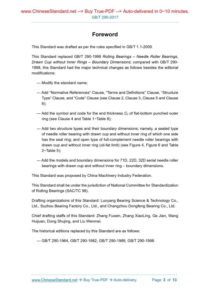 GB/T 290-2017: Rolling Bearings - Needle Roller Bearings with Drawn Cup and without Inner Ring - Boundary Dimension---This is an excerpt. Full copy of true-PDF in English version (including equations, symbols, images, flow-chart, tables, and figures etc.), auto-downloaded/delivered in 9 seconds, can be purchased online: https://www.ChineseStandard.net/PDF.aspx/GBT290-2017 GB NATIONAL STANDARD OF THE PEOPLE’S REPUBLIC OF CHINA ICS 21.100.20 J 11 Replacing GB/T 290-1998 Rolling Bearings – Needle Roller Bearings with Drawn Cup and without Inner Ring – Boundary Dimension Issued on: NOVEMBER 01, 2017 Implemented on: MAY 01, 2018 Issued by. General Administration of Quality Supervision, Inspection and Quarantine; Standardization Administration of PRC. Table of ContentsForeword ... 3 1 Scope ... 4 2 Normative References ... 4 3 Terms and Definitions ... 4 4 Symbols ... 4 5 Structure Type ... 5 6 Codes ... 6 7 Mark Example ... 6 8 Boundary Dimension ... 7ForewordThis Standard was drafted as per the rules specified in GB/T 1.1-2009. This Standard replaced GB/T 290-1998 Rolling Bearings – Needle Roller Bearings, Drawn Cup without Inner Rings – Boundary Dimensions; compared with GB/T 290- 1998, this Standard had the major technical changes as follows besides the editorial modifications. --- Modify the standard name; --- Add “Normative References” Clause, “Terms and Definitions” Clause, “Structure Type” Clause, and “Code” Clause (see Clause 2, Clause 3, Clause 5 and Clause 6); --- Add the symbol and code for the end thickness C2 of flat-bottom punched outer ring (see Clause 4 and Table 1~Table 8); --- Add two structure types and their boundary dimensions; namely, a sealed type of needle roller bearing with drawn cup and without inner ring of which one side has the seal ring; and open type of full-complement needle roller bearings with drawn cup and without inner ring (oil-fat limit) (see Figure 4, Figure 6 and Table 2~Table 5); --- Add the models and boundary dimensions for 71D, 22D, 32D serial needle roller bearings with drawn cup and without inner ring – boundary dimensions. This Standard was proposed by China Machinery Industry Federation. This Standard shall be under the jurisdiction of National Committee for Standardization of Rolling Bearings (SAC/TC 98). Drafting organizations of this Standard. Luoyang Bearing Science & Technology Co., Ltd., Suzhou Bearing Factory Co., Ltd., and Changzhou Dongfeng Bearing Co., Ltd. Chief drafting staffs of this Standard. Zhang Fuwen, Zhang XiaoLing, Ge Jian, Wang Huijuan, Dong Shujing, and Liu Wenmei. The historical editions replaced by this Standard are as follows. --- GB/T 290-1964, GB/T 290-1982, GB/T 290-1989, GB/T 290-1998. Rolling Bearings – Needle Roller Bearings with Drawn Cup and without Inner Ring – Boundary Dimension1 ScopeThis Standard specifies the boundary dimension for the needle roller bearings with drawn cup and without inner ring (hereinafter referred to as needle roller bearings). This Standard is applicable to the design and type-selection of bearings.2 Normative ReferencesThe following documents are essential to the application of this document. For the dated documents, only the versions with the dates indicated are applicable to this document; for the undated documents, only the latest version (including all the amendments) are applicable to this document. GB/T 272 Rolling Bearings – Identification Code GB/T 6930 Rolling Bearings – Vocabulary GB/T 7811 Rolling Bearings – Symbols for Quantities3 Terms and DefinitionsThe terms and definitions stipulated in GB/T 6930 are applicable to this document.4 SymbolsThe following symbols and those stipulated in GB/T 7811 are applicable to this document. Unless otherwise is specified, the symbols shown in Figure 1~ Figure 9 and the values shown in Table 1 ~ Table 8 are all nominal dimensions. C. width of punched outer ring C1. thickness of end on the forming bottom of the sealed type of punched outer ring ......Source: Above contents are excerpted from the full-copy PDF -- translated/reviewed by: www.ChineseStandard.net / Wayne Zheng et al. Tips & Frequently Asked Questions:Question 1: How long will the true-PDF of English version of GB/T 290-2017 be delivered?Answer: The full copy PDF of English version of GB/T 290-2017 can be downloaded in 9 seconds, and it will also be emailed to you in 9 seconds (double mechanisms to ensure the delivery reliably), with PDF-invoice.Question 2: Can I share the purchased PDF of GB/T 290-2017_English with my colleagues?Answer: Yes. The purchased PDF of GB/T 290-2017_English will be deemed to be sold to your employer/organization who actually paid for it, including your colleagues and your employer's intranet.Question 3: Does the price include tax/VAT?Answer: Yes. Our tax invoice, downloaded/delivered in 9 seconds, includes all tax/VAT and complies with 100+ countries' tax regulations (tax exempted in 100+ countries) -- See Avoidance of Double Taxation Agreements (DTAs): List of DTAs signed between Singapore and 100+ countriesQuestion 4: Do you accept my currency other than USD?Answer: Yes. www.ChineseStandard.us -- GB/T 290-2017 -- Click this link and select your country/currency to pay, the exact amount in your currency will be printed on the invoice. Full PDF will also be downloaded/emailed in 9 seconds.Question 5: Should I purchase the latest version GB/T 290-2017?Answer: Yes. Unless special scenarios such as technical constraints or academic study, you should always prioritize to purchase the latest version GB/T 290-2017 even if the enforcement date is in future. Complying with the latest version means that, by default, it also complies with all the earlier versions, technically.How to buy and download a true PDF of English version of GB/T 290-2017?A step-by-step guide to download PDF of GB/T 290-2017_EnglishStep 1: Visit website https://www.ChineseStandard.net (Pay in USD), or https://www.ChineseStandard.us (Pay in any curre