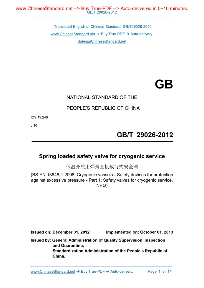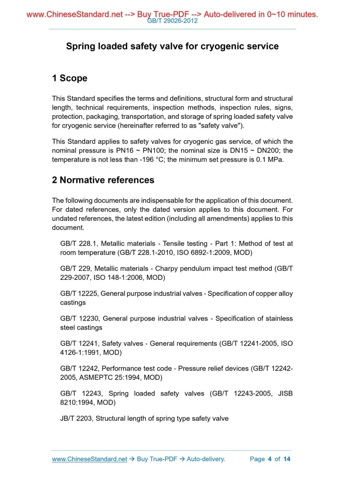 Similar standardsGB/T 29026-2012: Spring loaded safety valve for cryogenic service---This is an excerpt. Full copy of true-PDF in English version (including equations, symbols, images, flow-chart, tables, and figures etc.), auto-downloaded/delivered in 9 seconds, can be purchased online: https://www.ChineseStandard.net/PDF.aspx/GBT29026-2012NATIONAL STANDARD OF THE PEOPLE’S REPUBLIC OF CHINA ICS 13.240 J 16 Spring loaded safety valve for cryogenic service (BS EN 13648-1.2008, Cryogenic vessels - Safety devices for protection against excessive pressure - Part 1.Safety valves for cryogenic service, NEQ) Issued on. DECEMBER 31, 2012 Implemented on. OCTOBER 01, 2013 Issued by. General Administration of Quality Supervision, Inspection and Quarantine; Standardization Administration of the People’s Republic of China. Table of ContentsForeword... 3 1 Scope... 4 2 Normative references... 4 3 Terms and definitions... 5 4 Structural form and structural length... 5 5 Technical requirements... 6 6 Test method... 9 7 Inspection rules... 11 8 Signs, protection, packaging, transportation and storage... 13ForewordThis Standard was drafted in accordance with the rules given in GB/T 1.1-2009. This Standard, with the use of the redrafting method, is compiled with reference to BS EN 13648-1.2008, Cryogenic vessels - Safety devices for protection against excessive pressure - Part 1.Safety valves for cryogenic service. It is not equivalent to BS EN 13648-1.2008. This Standard was proposed by China Machinery Industry Federation. This Standard shall be under the jurisdiction of National Technical Committee 503 on Safety Devices for Protection against Excessive Pressure of Standardization Administration of China (SAC/TC 503). The drafting organizations of this Standard. Beijing Aerospace Petrochemical Technology and Equipment Company. Organizations that participate in the drafting of this Standard. Yuming Valve Group Co., Ltd., Hangzhou Hangyang Tooling Valve Co., Ltd., National Engineering Research Center for Special Pump and Valve, Yongyi Valve Group Co., Ltd., Wujiang Dongwu Machine Co., Ltd., The Boiler & Pressure Vessel Safety Inspection Institute of Henan Province. The drafters of this Standard. Zhang Yukun, Yang Ying, Zhang Jiandong, Hu Yun, Gan Aigen, Ze Xiaofeng, Dang Lingui. Spring loaded safety valve for cryogenic service1 ScopeThis Standard specifies the terms and definitions, structural form and structural length, technical requirements, inspection methods, inspection rules, signs, protection, packaging, transportation, and storage of spring loaded safety valve for cryogenic service (hereinafter referred to as "safety valve"). This Standard applies to safety valves for cryogenic gas service, of which the nominal pressure is PN16 ~ PN100; the nominal size is DN15 ~ DN200; the temperature is not less than -196 °C; the minimum set pressure is 0.1 MPa.2 Normative referencesThe following documents are indispensable for the application of this document. For dated references, only the dated version applies to this document. For undated references, the latest edition (including all amendments) applies to this document. GB/T 228.1, Metallic materials - Tensile testing - Part 1.Method of test at room temperature (GB/T 228.1-2010, ISO 6892-1.2009, MOD) GB/T 229, Metallic materials - Charpy pendulum impact test method (GB/T 229-2007, ISO 148-1.2006, MOD) GB/T 12225, General purpose industrial valves - Specification of copper alloy castings GB/T 12230, General purpose industrial valves - Specification of stainless steel castings3 Terms and definitionsTerms and definitions determined by GB/T 12241 are applicable to this document.4 Structural form and structural length4.1 Structural form The typical structural form of the safety valve is shown in Figure 1. Notes. 4.2 Structural length The structural length of the safety valve is in accordance with the provisions of JB/T 2203.5 Technical requirements5.1 General requirements In addition to meeting the requirements of this Standard, safety valves shall also meet the requirements of GB/T 12241 and GB/T 12243.If these standards differ from the requirements of this Standard, this Standard shall prevail. 5.2 Structure and design 5.3 Materials 5.3.1 General The materials that are used for the safety valve shall be selected according to the operating temperature and material properties, and shall meet the following requirements. 5.3.2 Metallic materials 5.3.2.1 Cryogenic steel castings are in accordance with JB/T 7248; copper alloy castings are in accordance with GB/T 12225; austenitic stainless steel castings are in accordance with GB/T 12230.The visual quality of steel castings is in accordance with the provisions of JB/T 7927. 5.3.2.2 The cryogenic impact value shall meet the requirements of JB/T 7248. 5.3.3 Non-metallic materials 5.3.3.1 Non-metallic materials shall meet the minimum operating temperature requirements, be able to pass normal and low temperature tests, and have compatibility with oxygen. 5.4 Non-destructive testing Non-destructive testing shall be in accordance with the provisions of JB/T 7248 and meet the corresponding requirements. 5.5 Degreasing Before assembly, all parts shall be cleaned, and degreased if necessary. 5.6 Performance 5.6.4 Mechanical characteristics The mechanical characteristics of the safety valve shall meet the requirements of GB/T 12243. 5.6.5 Displacement The displacement calculation of the safety valve is in accordance with GB/T 12241. 5.6.6 Cryogenic tightness The cryogenic leakage rate of the safety valve shall not be greater than the specifications in Table 1.6 Test method6.1 Normal temperature test The normal temperature test items are in accordance with the requirements of Table 2; the normal temperature test methods shall meet the requirements of GB/T 12241, GB/T 12242 and GB/T 12243. 6.2 Materials For the materials of the pressure-containing parts, the analysis of the chemical composition is in accordance with the rele