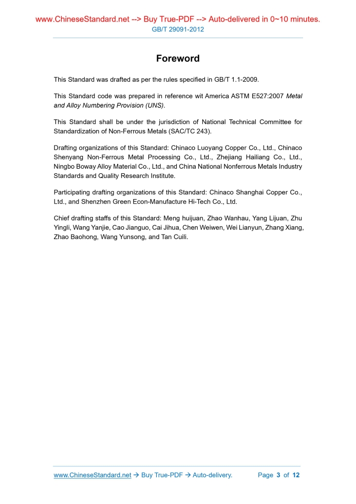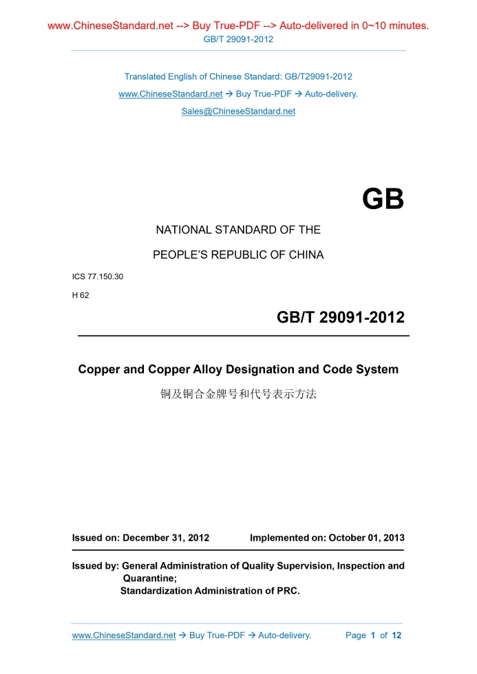 Similar standardsGB/T 29091-2012: Copper and Copper Alloy Designation and Code System---This is an excerpt. Full copy of true-PDF in English version (including equations, symbols, images, flow-chart, tables, and figures etc.), auto-downloaded/delivered in 9 seconds, can be purchased online: https://www.ChineseStandard.net/PDF.aspx/GBT29091-2012GB NATIONAL STANDARD OF THE PEOPLE’S REPUBLIC OF CHINA ICS 77.150.30 H 62 Copper and Copper Alloy Designation and Code System Issued on: DECEMBER 31, 2012 Implemented on: OCTOBER 01, 2013 Issued by. General Administration of Quality Supervision, Inspection and Quarantine; Standardization Administration of PRC. Table of ContentsForeword ... 3 1 Scope ... 4 2 Normative References ... 4 3 Terms ... 4 4 Naming Method of the Grade ... 5 5 Arrangement Principles of Codes ... 10ForewordThis Standard was drafted as per the rules specified in GB/T 1.1-2009. This Standard code was prepared in reference wit America ASTM E527.2007 Metal and Alloy Numbering Provision (UNS). This Standard shall be under the jurisdiction of National Technical Committee for Standardization of Non-Ferrous Metals (SAC/TC 243). Drafting organizations of this Standard. Chinaco Luoyang Copper Co., Ltd., Chinaco Shenyang Non-Ferrous Metal Processing Co., Ltd., Zhejiang Hailiang Co., Ltd., Ningbo Boway Alloy Material Co., Ltd., and China National Nonferrous Metals Industry Standards and Quality Research Institute. Participating drafting organizations of this Standard. Chinaco Shanghai Copper Co., Ltd., and Shenzhen Green Econ-Manufacture Hi-Tech Co., Ltd. Chief drafting staffs of this Standard. Meng huijuan, Zhao Wanhau, Yang Lijuan, Zhu Yingli, Wang Yanjie, Cao Jianguo, Cai Jihua, Chen Weiwen, Wei Lianyun, Zhang Xiang, Zhao Baohong, Wang Yunsong, and Tan Cuili. Copper and Copper Alloy Designation and Code System1 ScopeThis Standard specifies the designation of grade and code for copper and copper alloy. This Standard is applicable to the processing, casting and recycling products of copper and copper alloy.2 Normative ReferencesThe following documents are essential to the application of this document. For the dated documents, only the versions with the dates indicated are applicable to this document; for the undated documents, only the latest version (including all the amendments) are applicable to this document. GB/T 11086 Copper and Copper Alloy – Terms and Definitions3 TermsThe following terms and definitions and those stipulated in GB/T 11086 are applicable to this document. 3.1 High copper alloys The processing of high copper alloys refers to using copper as the base metal, then add one or more microelements, so that obtain certain alloys with the expected properties. Generally, if the copper content is in the range of 96.0% ~< 99.3%. it shall be used for cold or hot rolling processing. The casting of high copper alloys refers to using copper as the base metal; generally, if the copper content is greater than 94%, it shall be used for casting processing. In order to obtain particular properties, such kind of alloys can be added silver. 3.2 Recycling copper and copper alloys The qualified copper and copper alloy products directly made of materials containing waste copper. 4.3 Naming method for the grades of recycling copper and copper alloy Based on the naming method for the grades of recycling copper and copper alloy, the most front end of the grade shall be crowned with the first capital letter of “recycling”, namely, the letter “R”.5 Arrangement Principles of CodesThe codes for copper and copper alloy consist of the first capital letter “T” in the Chinese Pinyin of “copper” or the first capital letter “C” in English word of “copper” and five Arabic numerals. The code number range for processing copper and copper alloy is “10000~79999”; while the code number range for casting copper and copper alloy is “80000~99999”. In the same category, it shall be sequenced as per the copper content from high to low; if the copper content is equal, it shall be sequenced as per the first main additive element content from high to low. 5.1 Arrangement methods for codes of processing copper and copper alloy The code arrangement for processing copper and copper alloy can refer to the provisions of Table 1. ......Source: Above contents are excerpted from the full-copy PDF -- translated/reviewed by: www.ChineseStandard.net / Wayne Zheng et al. Tips & Frequently Asked Questions:Question 1: How long will the true-PDF of English version of GB/T 29091-2012 be delivered?Answer: The full copy PDF of English version of GB/T 29091-2012 can be downloaded in 9 seconds, and it will also be emailed to you in 9 seconds (double mechanisms to ensure the delivery reliably), with PDF-invoice.Question 2: Can I share the purchased PDF of GB/T 29091-2012_English with my colleagues?Answer: Yes. The purchased PDF of GB/T 29091-2012_English will be deemed to be sold to your employer/organization who actually paid for it, including your colleagues and your employer's intranet.Question 3: Does the price include tax/VAT?Answer: Yes. Our tax invoice, downloaded/delivered in 9 seconds, includes all tax/VAT and complies with 100+ countries' tax regulations (tax exempted in 100+ countries) -- See Avoidance of Double Taxation Agreements (DTAs): List of DTAs signed between Singapore and 100+ countriesQuestion 4: Do you accept my currency other than USD?Answer: Yes. www.ChineseStandard.us -- GB/T 29091-2012 -- Click this link and select your country/currency to pay, the exact amount in your currency will be printed on the invoice. Full PDF will also be downloaded/emailed in 9 seconds.How to buy and download a true PDF of English version of GB/T 29091-2012?A step-by-step guide to download PDF of GB/T 29091-2012_EnglishStep 1: Visit website https://www.ChineseStandard.net (Pay in USD), or https://www.ChineseStandard.us (Pay in any currencies such as Euro, KRW, JPY, AUD).Step 2: Search keyword "GB/T 