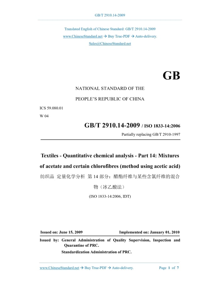 GB/T 2910.14-2009: Textiles -- Quantitative chemical analysis -- Part 14: Mixtures of acetate and certain chlorofibre (method using acetic acid) Delivery: 9 seconds. True-PDF full-copy in English & invoice will be downloaded + auto-delivered via email. See step-by-step procedure Status: Valid