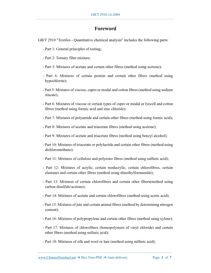 Similar standardsGB/T 2910.14-2009: Textiles -- Quantitative chemical analysis -- Part 14: Mixtures of acetate and certain chlorofibre (method using acetic acid)---This is an excerpt. Full copy of true-PDF in English version (including equations, symbols, images, flow-chart, tables, and figures etc.), auto-downloaded/delivered in 9 seconds, can be purchased online: https://www.ChineseStandard.net/PDF.aspx/GBT2910.14-2009 GB NATIONAL STANDARD OF THE PEOPLE’S REPUBLIC OF CHINA ICS 59.080.01 W 04 GB/T 2910.14-2009 / ISO 1833-14:2006 Partially replacing GB/T 2910-1997 Textiles - Quantitative chemical analysis - Part 14: Mixtures of acetate and certain chlorofibres (method using acetic acid) (ISO 1833-14:2006, IDT) ISSUED ON: JUNE 15, 2009 IMPLEMENTED ON: JANUARY 01, 2010 Issued by: General Administration of Quality Supervision, Inspection and Quarantine of PRC. Standardization Administration of PRC. Table of ContentsForeword ... 3 1 Scope ... 6 2 Normative references ... 6 3 Principles ... 6 4 Reagents ... 6 5 Equipment ... 7 6 Test steps ... 7 7 Calculation and presentation of results ... 7 8 Precision ... 7ForewordGB/T 2910 "Textiles - Quantitative chemical analysis" includes the following parts: - Part 1: General principles of testing; - Part 2: Ternary fiber mixture; - Part 3: Mixtures of acetate and certain other fibres (method using acetone); - Part 4: Mixtures of certain protein and certain other fibers (method using hypochlorite); - Part 5: Mixtures of viscose, cupro or modal and cotton fibres (method using sodium zincate); - Part 6: Mixtures of viscose or certain types of cupro or modal or lyocell and cotton fibres (method using formic acid and zinc chloride); - Part 7: Mixtures of polyamide and certain other fibres (method using formic acid); - Part 8: Mixtures of acetate and triacetate fibres (method using acetone); - Part 9: Mixtures of acetate and triacetate fibres (method using benzyl alcohol); - Part 10: Mixtures of triacetate or polylactide and certain other fibres (method using dichloromethane); - Part 11: Mixtures of cellulose and polyester fibres (method using sulfuric acid); - Part 12: Mixtures of acrylic, certain modacrylic, certain chlorofibres, certain elastanes and certain other fibres (method using dimethylformamide); - Part 13: Mixtures of certain chlorofibers and certain other fibers(method using carbon disulfide/acetone); - Part 14: Mixtures of acetate and certain chlorofibres (method using acetic acid); - Part 15: Mixtures of jute and certain animal fibres (method by determining nitrogen content); - Part 16: Mixtures of polypropylene and certain other fibres (method using xylene); - Part 17: Mixtures of chlorofibers (homopolymers of vinyl chloride) and certain other fibers (method using sulfuric acid); - Part 18: Mixtures of silk and wool or hair (method using sulfuric acid); Textiles - Quantitative chemical analysis - Part 14: Mixtures of acetate and certain chlorofibres (method using acetic acid)1 ScopeThis Part of GB/T 2910 specifies the method for the determination of acetate fiber content in a binary mixture, which is composed of acetate fiber, after removal of non- fibrous matter and certain chlorine-containing fibers or post-chlorinated chlorine- containing fibers, by the glacial acetic acid method.2 Normative referencesThe provisions in following documents become the provisions of this Part through reference in this Part of GB/T 2910. For the dated references, the subsequent amendments (excluding corrections) or revisions do not apply to this Part; however, parties who reach an agreement based on this Part are encouraged to study if the latest versions of these documents are applicable. For undated references, the latest edition of the referenced document applies. GB/T 2910.1 Textiles - Quantitative chemical analysis - Part 1: General principles of testing (GB/T 2910.1-2009, ISO 1833-1:2006, IDT)3 PrinciplesUse glacial acetic acid reagent, to dissolve acetate fiber from the mixture of known dry mass. Collect the residue. Wash, dry, weigh it. Use the corrected mass, to calculate its dry mass fraction in the mixture. The mass fraction of acetate fiber is obtained from the difference.4 ReagentsUse the reagents, which are specified in GB/T 2910.1 and 4.1 of this Part. 4.1 Glacial acetic acid, which has a distillation range of 117 °C ~ 119 °C. Safety warning: The reagent is poisonous, so perfect protection measures shall be taken when using it. ......Source: Above contents are excerpted from the full-copy PDF -- translated/reviewed by: www.ChineseStandard.net / Wayne Zheng et al. Tips & Frequently Asked Questions:Question 1: How long will the true-PDF of English version of GB/T 2910.14-2009 be delivered?Answer: The full copy PDF of English version of GB/T 2910.14-2009 can be downloaded in 9 seconds, and it will also be emailed to you in 9 seconds (double mechanisms to ensure the delivery reliably), with PDF-invoice.Question 2: Can I share the purchased PDF of GB/T 2910.14-2009_English with my colleagues?Answer: Yes. The purchased PDF of GB/T 2910.14-2009_English will be deemed to be sold to your employer/organization who actually paid for it, including your colleagues and your employer's intranet.Question 3: Does the price include tax/VAT?Answer: Yes. Our tax invoice, downloaded/delivered in 9 seconds, includes all tax/VAT and complies with 100+ countries' tax regulations (tax exempted in 100+ countries) -- See Avoidance of Double Taxation Agreements (DTAs): List of DTAs signed between Singapore and 100+ countriesQuestion 4: Do you accept my currency other than USD?Answer: Yes. www.ChineseStandard.us -- GB/T 2910.14-2009 -- Click this link and select your country/currency to pay, the exact amount in your currency will be printed on the invoice. Full PDF will also be downloaded/emailed in 9 seconds.How to buy and download a true PDF of English version of GB/T 2910.14-2009?A step-by-step guide to download PDF of GB/T 2910.14-2009_EnglishStep 1: Visit website