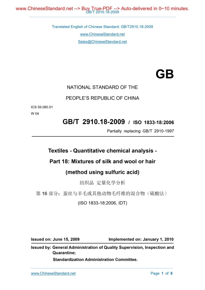 GB/T 2910.18-2009: Textiles -- Quantitative chemical analysis -- Part 18: Mixtures of silk and wool or hair (method using sulfuric acid) Delivery: 9 seconds. True-PDF full-copy in English & invoice will be downloaded + auto-delivered via email. See step-by-step procedure Status: Valid