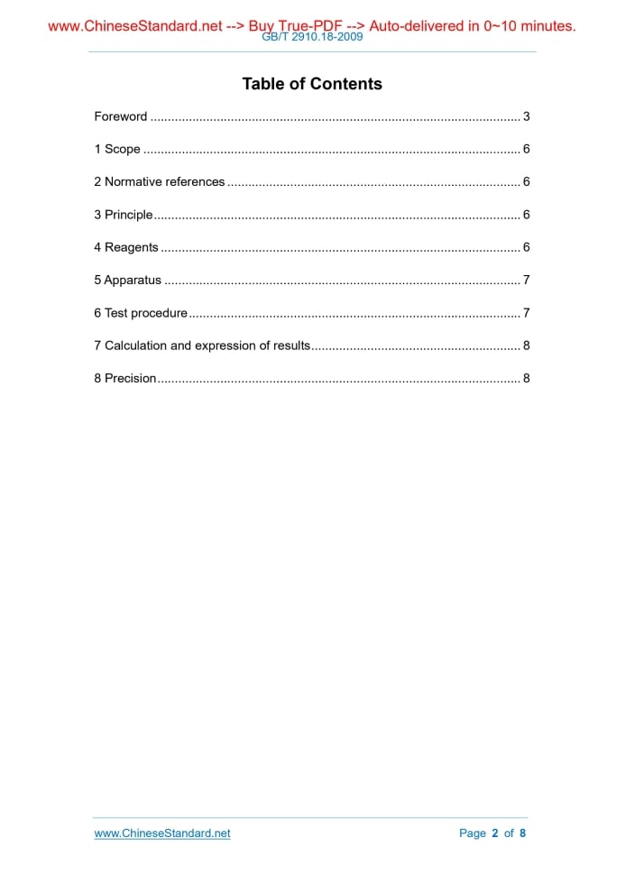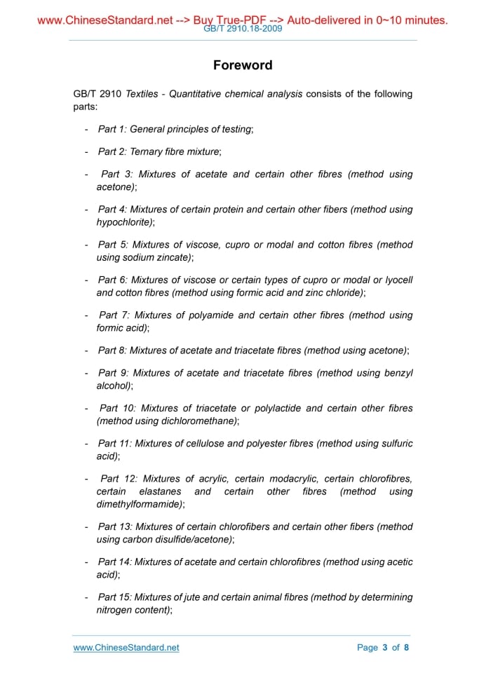 Similar standardsGB/T 2910.18-2009: Textiles -- Quantitative chemical analysis -- Part 18: Mixtures of silk and wool or hair (method using sulfuric acid)---This is an excerpt. Full copy of true-PDF in English version (including equations, symbols, images, flow-chart, tables, and figures etc.), auto-downloaded/delivered in 9 seconds, can be purchased online: https://www.ChineseStandard.net/PDF.aspx/GBT2910.18-2009 Textiles.Quantitative chemical analysis.Part 18. Mixtures of silk and wool or hair (method using sulfuric acid) ICS 59.008.01 W04 National Standards of People's Republic of China GB/T 2910.18-2009/ISO 1833-18..2006 Partially replaced GB/T 2910-1997 Quantitative chemical analysis of textiles Part 18. Silk and wool or other animal hair Fiber mixture (sulfuric acid method) (ISO 1833-18..2006, IDT) Released in.2009-06-15 2010--01-01 implementation General Administration of Quality Supervision, Inspection and Quarantine of the People's Republic of China Published by China National Standardization Administration ForewordGB/T 2910 "Quantitative Chemical Analysis of Textiles" includes the following parts. --- Part 1. General rules for testing; --- Part 2. Three-component fiber mixture; --- Part 3. Mixture of acetate fiber and some other fibers (acetone method); --- Part 4. a mixture of certain protein fibers and certain other fibers (hypochlorite method); --- Part 5. Viscose fiber, some copper ammonia fiber or modal fiber and cotton mixture (sodium zinc method); --- Part 6. Viscose fiber, some copper ammonia fiber, modal fiber or lyocell fiber and cotton mixture Zinc method); --- Part 7. Mixture of polyamide fiber and some other fibers (formic acid method); --- Part 8. Mixture of acetate fiber and triacetate fiber (acetone method); --- Part 9. mixture of acetate fiber and triacetate fiber (benzyl alcohol method); --- Part 10. Triacetate fiber or a mixture of polylactic acid fiber and some other fibers (dichloromethane method); --- Part 11. mixture of cellulose fibers and polyester fibers (sulfuric acid method); --- Part 12. Polyacrylonitrile fibers, some modified polyacrylonitrile fibers, some chlorine-containing fibers or some elastic fibers and some other Mixture of fibers (dimethylformamide method); --- Part 13. a mixture of certain chlorine-containing fibers and certain other fibers (carbon disulfide/acetone method); --- Part 14. mixture of acetate fiber and some chlorine-containing fibers (glacial acetic acid method); --- Part 15. Mixture of jute and some animal hair fibers (nitrogen content method); --- Part 16. Mixture of polypropylene fiber and some other fibers (xylene method); --- Part 17. Blends of chlorinated fibers (vinyl chloride homopolymer) with certain other fibers (sulfuric acid method); --- Part 18. mixture of silk and wool or other animal hair fibers (sulfuric acid method); --- Part 19. Mixture of cellulose fiber and asbestos (heating method); --- Part 20. Mixtures of polyurethane elastic fibers and certain other fibers (dimethylacetamide method); --- Part 21. Chlorinated fibers, some modified polyacrylonitrile fibers, some elastic fibers, acetate fibers, triacetate fibers and some other Mixture of other fibers (cyclohexanone method); --- Part 22. Viscose fiber, some copper ammonia fiber, modal fiber or lyocell fiber and flax, ramie mixture (formic acid / Zinc chloride method); --- Part 23. mixture of polyethylene fibers and polypropylene fibers (cyclohexanone method); --- Part 24. Mixtures of polyester fibers with certain other fibers (phenol/tetrachloroethane method); --- Part 101. a mixture of soy protein composite fiber and some other fibers. This part is the 18th part of GB/T 2910. GB/T 2910-1997 is replaced by the following standards. GB/T 29.10.1, GB/T 29.10.3, GB/T 29110, GB/T 29110, GB/T 29110, GB/T 29110.8, GB/T 29110, GB/T 2910.10, GB/T 2910.11, GB/T 29110.12, GB/T 2910.13, GB/T 2910.14, GB/T 2910.15, GB/T 2910.16, GB/T 2910.17, GB/T 29110.18, GB/T 2910.19 and GB/T 2910.22. This part is equivalent to ISO 18333.18..2006 "Quantitative chemical analysis of textiles. Part 18. Silk and wool or other animals Wool fiber mixture (sulfuric acid method). Compared with ISO 1833.18..2006, this section has the following editorial changes. --- In the normative reference documents, Chinese standards have replaced international standards; GB/T 2910.18-2009/ISO 1833-18..2006 --- Removed the foreword of international standards. This section replaces Chapter 19 of GB/T 2910-1997 "Quantitative chemical analysis method for textile two-component fiber blended products". Compared with Chapter 19 of GB/T 2910-1997, this section has no technical differences. This section is proposed by China Textile Industry Association. This section is under the jurisdiction of the Basic Standards Branch of the National Technical Committee for Textile Standardization (SAC/TC209/SC1). This section is mainly drafted by. National Textile Products Quality Supervision and Testing Center, Shenzhen Testing Center of China Academy of Textile Sciences. The main drafters of this section. Wang Ying, Li Chun, Wang Qian, An Li. The previous releases of GB/T 2910 are. --- GB/T 2910-1982; --- GB/T 2910-1997. GB/T 2910.18-2009/ISO 1833-18..2006 Quantitative chemical analysis of textiles Part 18. Silk and wool or other animal hair Fiber mixture (sulfuric acid method)1 ScopeThis part of GB/T 2910 specifies the determination of silk and wool or other animal hair fibers after the removal of non-fibrous substances by the sulfuric acid method. Method of fiber content in a two-component mixture.2 Normative referencesThe clauses in the following documents become the clauses of this section through the reference in this part of GB/T 2910. All quotes with date Documents, all subsequent amendments (excluding errata) or revisions are not applicable to this section, however, it is encouraged to achieve The parties to the agreement investigate whether the latest versions of these documents are available. For undated reference