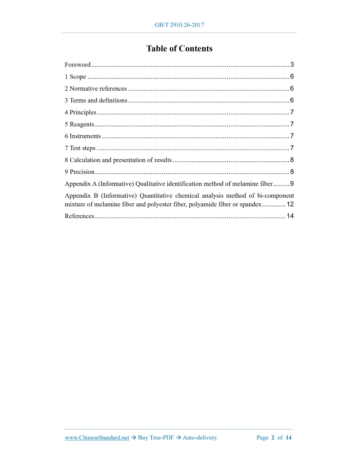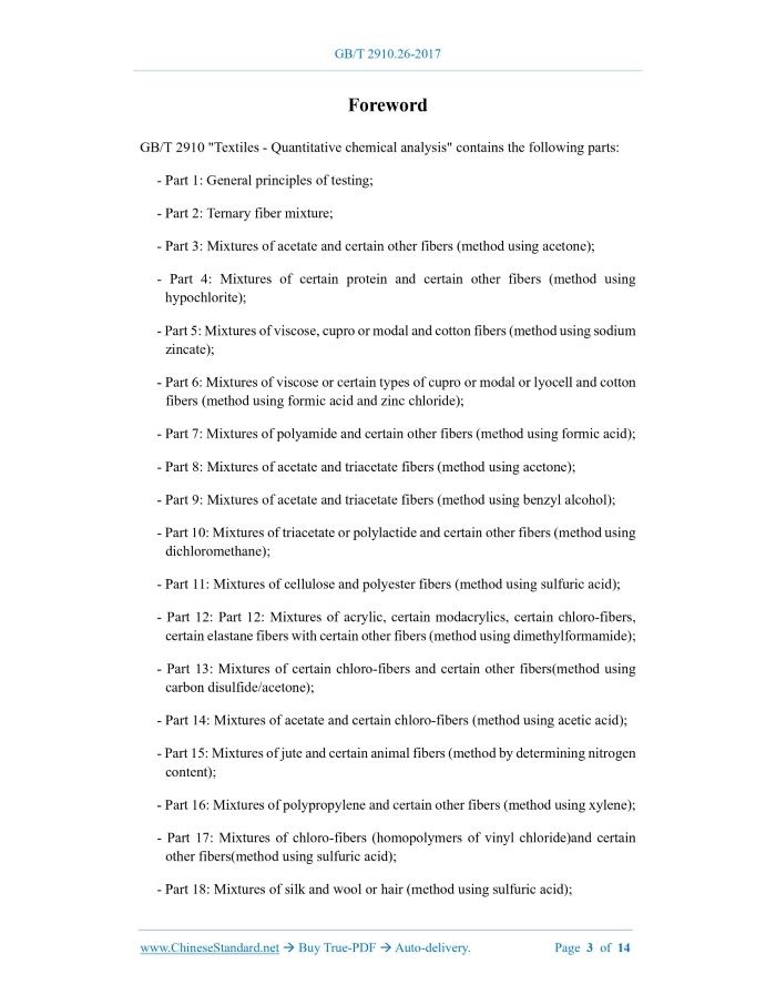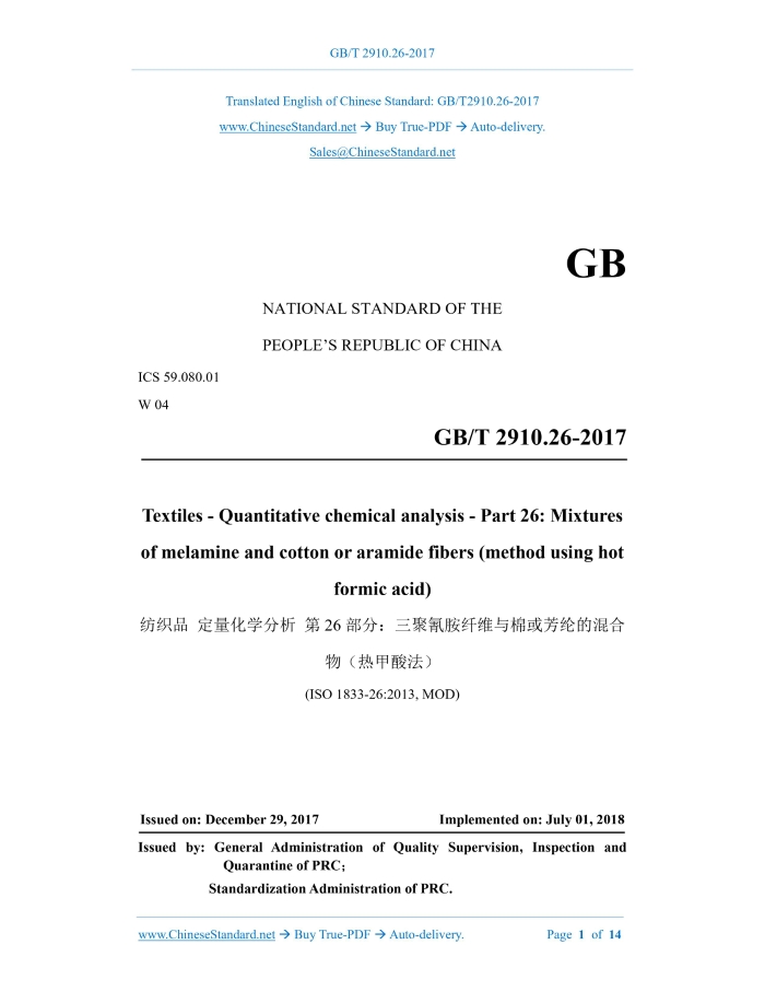 Similar standardsGB/T 2910.26-2017: Textiles -- Qualitative chemical analysis -- Part 26: Mixtures of melamine and cotton or aramide fibers (method using hot formic acid)---This is an excerpt. Full copy of true-PDF in English version (including equations, symbols, images, flow-chart, tables, and figures etc.), auto-downloaded/delivered in 9 seconds, can be purchased online: https://www.ChineseStandard.net/PDF.aspx/GBT2910.26-2017 GB NATIONAL STANDARD OF THE PEOPLE’S REPUBLIC OF CHINA ICS 59.080.01 W 04 Textiles - Quantitative chemical analysis - Part 26: Mixtures of melamine and cotton or aramide fibers (method using hot formic acid) (ISO 1833-26:2013, MOD) ISSUED ON: DECEMBER 29, 2017 IMPLEMENTED ON: JULY 01, 2018 Issued by: General Administration of Quality Supervision, Inspection and Quarantine of PRC; Standardization Administration of PRC. Table of ContentsForeword ... 3 1 Scope ... 6 2 Normative references ... 6 3 Terms and definitions ... 6 4 Principles ... 7 5 Reagents ... 7 6 Instruments ... 7 7 Test steps ... 7 8 Calculation and presentation of results ... 8 9 Precision ... 8 Appendix A (Informative) Qualitative identification method of melamine fiber ... 9 Appendix B (Informative) Quantitative chemical analysis method of bi-component mixture of melamine fiber and polyester fiber, polyamide fiber or spandex ... 12 References ... 14ForewordGB/T 2910 "Textiles - Quantitative chemical analysis" contains the following parts: - Part 1: General principles of testing; - Part 2: Ternary fiber mixture; - Part 3: Mixtures of acetate and certain other fibers (method using acetone); - Part 4: Mixtures of certain protein and certain other fibers (method using hypochlorite); - Part 5: Mixtures of viscose, cupro or modal and cotton fibers (method using sodium zincate); - Part 6: Mixtures of viscose or certain types of cupro or modal or lyocell and cotton fibers (method using formic acid and zinc chloride); - Part 7: Mixtures of polyamide and certain other fibers (method using formic acid); - Part 8: Mixtures of acetate and triacetate fibers (method using acetone); - Part 9: Mixtures of acetate and triacetate fibers (method using benzyl alcohol); - Part 10: Mixtures of triacetate or polylactide and certain other fibers (method using dichloromethane); - Part 11: Mixtures of cellulose and polyester fibers (method using sulfuric acid); - Part 12: Part 12: Mixtures of acrylic, certain modacrylics, certain chloro-fibers, certain elastane fibers with certain other fibers (method using dimethylformamide); - Part 13: Mixtures of certain chloro-fibers and certain other fibers(method using carbon disulfide/acetone); - Part 14: Mixtures of acetate and certain chloro-fibers (method using acetic acid); - Part 15: Mixtures of jute and certain animal fibers (method by determining nitrogen content); - Part 16: Mixtures of polypropylene and certain other fibers (method using xylene); - Part 17: Mixtures of chloro-fibers (homopolymers of vinyl chloride)and certain other fibers(method using sulfuric acid); - Part 18: Mixtures of silk and wool or hair (method using sulfuric acid); Textiles - Quantitative chemical analysis - Part 26: Mixtures of melamine and cotton or aramide fibers (method using hot formic acid) Caution - The substances or methods used in this section may be harmful to human health and the environment if used improperly. This Part only involves technical applicability-related content, at any stage the user is responsible for taking appropriate health and safety and environmental measures.1 ScopeThis Part of GB/T 2910 specifies the method for determining the content of melamine fiber in a bi-component mixture of melamine fiber and cotton or aramid, after removal of non-fibrous matter, by the hot formic acid method. This Part applies to the mixture of melamine fiber and cotton or aramid. Note: Appendix A gives the qualitative identification method of melamine fiber. Appendix B gives the quantitative chemical analysis method of the bi-component mixture of melamine fiber and polyester fiber, polyamide fiber or spandex.2 Normative referencesThe following documents are essential to the application of this document. For the dated documents, only the versions with the dates indicated are applicable to this document; for the undated documents, only the latest version (including all the amendments) is applicable to this standard. GB/T 2910.1 Textiles - Quantitative chemical analysis - Part 1: General principles of testing (GB/T 2910.1-2009, ISO 1833-1:2006, IDT)3 Terms and definitionsThe following terms and definitions apply to this document. 3.1 Melamine fiber Fibers formed from cross-linked macromolecules, which are composed of at least 85% (mass fraction) melamine derivatives.4 PrinciplesUse 90% (mass fraction) hot formic acid solution, to dissolve and remove the melamine fiber from the mixture of known dry mass. Collect the residue. Wash, dry and weigh it. Use the corrected mass, to calculate its dry mass percentage of the mixture. The mass percentage of melamine fiber is obtained from the difference.5 Reagents5.1 General Use the reagents, which are specified in GB/T 2910.1 and 5.2 and 5.3 of this Part. 5.2 90% (mass fraction) formic acid solution (density ρ = 1.204 g/mL at 20 °C) Use water, to dilute 890 mL of 98% ~ 100% (mass fraction) formic acid (density ρ = 1.220 g/mL at 20 °C), to 1 L. Safety warning: This reagent is harmful to the human body, so perfect protective measures shall be taken when using it. 5.3 Diluted ammonia solution Use water to dilute 80 mL of ammonia water (density ρ = 0.880 g/mL at 20 °C), to 1 L.6 Instruments6.1 General Use the instruments, which are specified in GB/T2910.1 and 6.2 and 6.3 of this Part. 6.2 Conical flask with stopper The capacity is not less than 200 mL. 6.3 Oscillating water bath, or other heating equipment It can perform reciprocating or circular oscillation, at a frequency of 160 times per minute; meanwhile it can maintain the temperature at (90 ± 2
