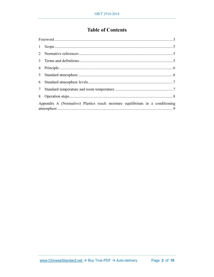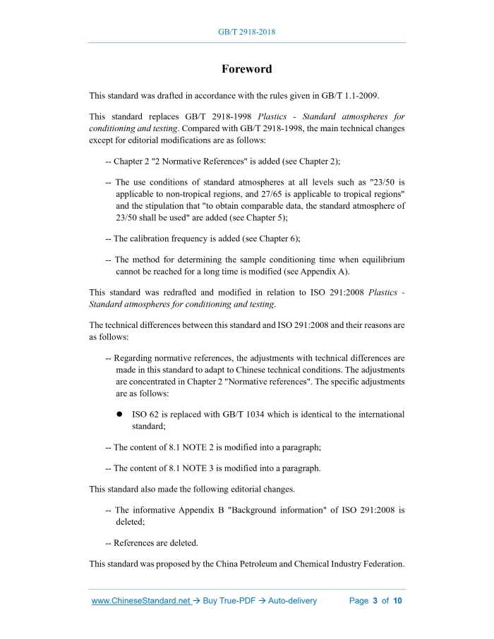 Similar standardsGB/T 2918-2018: Plastics -- Standard atmospheres for conditioning and testing---This is an excerpt. Full copy of true-PDF in English version (including equations, symbols, images, flow-chart, tables, and figures etc.), auto-downloaded/delivered in 9 seconds, can be purchased online: https://www.ChineseStandard.net/PDF.aspx/GBT2918-2018GB NATIONAL STANDARD OF THE PEOPLE'S REPUBLIC OF CHINA ICS 83.080.01 G 31 Replacing GB/T 2918-1998 Plastics - Standard atmospheres for conditioning and testing (ISO 291:2008, MOD) ISSUED ON: DECEMBER 28, 2018 IMPLEMENTED ON: NOVEMBER 1, 2019 Issued by: State Administration for Market Regulation; Standardization Administration of PRC. Table of ContentsForeword ... 3 1 Scope ... 5 2 Normative references ... 5 3 Terms and definitions ... 5 4 Principle ... 6 5 Standard atmosphere ... 6 6 Standard atmosphere levels ... 7 7 Standard temperature and room temperature ... 7 8 Operation steps ... 8 Appendix A (Normative) Plastics reach moisture equilibrium in a conditioning atmosphere ... 9ForewordThis standard was drafted in accordance with the rules given in GB/T 1.1-2009. This standard replaces GB/T 2918-1998 Plastics - Standard atmospheres for conditioning and testing. Compared with GB/T 2918-1998, the main technical changes except for editorial modifications are as follows: -- Chapter 2 "2 Normative References" is added (see Chapter 2); -- The use conditions of standard atmospheres at all levels such as "23/50 is applicable to non-tropical regions, and 27/65 is applicable to tropical regions" and the stipulation that "to obtain comparable data, the standard atmosphere of 23/50 shall be used" are added (see Chapter 5); -- The calibration frequency is added (see Chapter 6); -- The method for determining the sample conditioning time when equilibrium cannot be reached for a long time is modified (see Appendix A). This standard was redrafted and modified in relation to ISO 291:2008 Plastics - Standard atmospheres for conditioning and testing. The technical differences between this standard and ISO 291:2008 and their reasons are as follows: -- Regarding normative references, the adjustments with technical differences are made in this standard to adapt to Chinese technical conditions. The adjustments are concentrated in Chapter 2 "Normative references". The specific adjustments are as follows: ISO 62 is replaced with GB/T 1034 which is identical to the international standard; -- The content of 8.1 NOTE 2 is modified into a paragraph; -- The content of 8.1 NOTE 3 is modified into a paragraph. This standard also made the following editorial changes. -- The informative Appendix B "Background information" of ISO 291:2008 is deleted; -- References are deleted. This standard was proposed by the China Petroleum and Chemical Industry Federation. Plastics - Standard atmospheres for conditioning and testing1 ScopeThis standard specifies the specifications for conditioning and testing plastics and all types of specimens under constant environmental conditions. This standard applies to plastics and all types of specimens. This standard does not include special environments for certain special tests or materials or for simulating certain specific climatic conditions.2 Normative referencesThe following documents are essential for the application of this document. For any dated referenced document, only the dated version applies to this document. For any undated referenced document, the latest version (including all amendments) applies to this document. GB/T 1034 Plastics - Determination of water absorption (GB/T 1034-2008, ISO 62:2008, IDT)3 Terms and definitionsThe following terms and definitions apply to this document. 3.1 standard atmosphere Preferably, a constant environment with specified air temperature and humidity and limited ranges of atmospheric pressure and air circulation rate. The air contains no significant added components and the environment is not affected by any significant added radiation. NOTE 1: The standard atmosphere enables the sample or specimen to reach and maintain the specified state. NOTE 2: The standard atmosphere is equivalent to the average environmental conditions of the laboratory and can be established in a (environmentally controlled) conditioning cabinet, box or room. 3.2 conditioning atmosphere A constant environment in which samples or specimens are kept before experiments are8 Operation steps8.1 Conditioning The conditioning time is specified in the relevant materials. When there is no applicable standard specifying the conditioning time, it shall be implemented as follows: a) Unless otherwise specified, for standard atmospheres 23/50 and 27/65, not less than 88 h; b) Unless otherwise specified, for room temperature between 18 °C and 28 °C, not less than 4 h. NOTE 1: For plastic materials, the time required to reach moisture equilibrium is generally longer than the time required to reach temperature equilibrium. If the sample cannot reach moisture equilibrium after conditioning according to a), the conditioning time is longer than t70 specified in GB/T 1034 (t70 depends on the square of the thickness), and the time required to reach equilibrium meets the requirements of Appendix A. For special tests and plastics or specimens known to reach temperature and humidity equilibrium quickly or slowly, a shorter or longer conditioning time may be specified in the corresponding material standard in accordance with the requirements of Appendix A. 8.2 Experimentation Unless otherwise specified, the conditioned specimens shall be tested in the same environment or temperature as that for conditioning. In any case, the test shall be carried out immediately after the specimens are removed from the conditioning atmosphere. ......Source: Above contents are excerpted from the full-copy PDF -- translated/reviewed by: www.ChineseStandard.net / Wayne Zheng et al. Tips & Frequently Asked Questions:Question 1: How long will the true-PDF of English