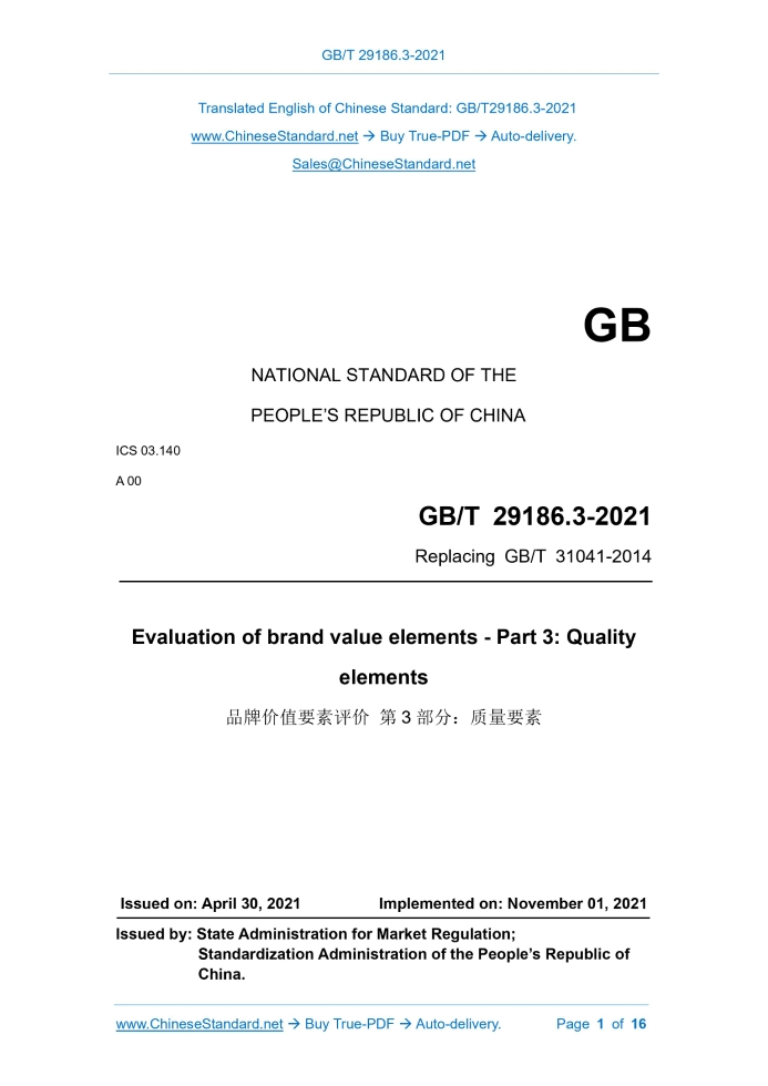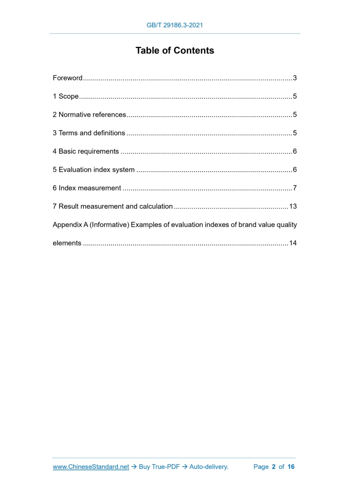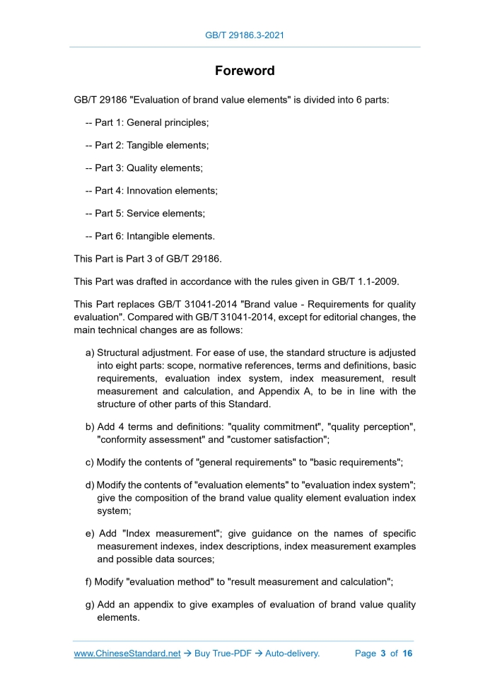 Similar standardsGB/T 29186.3-2021: Evaluation of brand value elements - Part 3: Quality elements---This is an excerpt. Full copy of true-PDF in English version (including equations, symbols, images, flow-chart, tables, and figures etc.), auto-downloaded/delivered in 9 seconds, can be purchased online: https://www.ChineseStandard.net/PDF.aspx/GBT29186.3-2021GB NATIONAL STANDARD OF THE PEOPLE’S REPUBLIC OF CHINA ICS 03.140 A 00 Replacing GB/T 31041-2014 Evaluation of brand value elements - Part 3: Quality elements ISSUED ON: APRIL 30, 2021 IMPLEMENTED ON: NOVEMBER 01, 2021 Issued by: State Administration for Market Regulation; Standardization Administration of the People’s Republic of China. Table of ContentsForeword ... 3 1 Scope ... 5 2 Normative references ... 5 3 Terms and definitions ... 5 4 Basic requirements ... 6 5 Evaluation index system ... 6 6 Index measurement ... 7 7 Result measurement and calculation ... 13 Appendix A (Informative) Examples of evaluation indexes of brand value quality elements ... 14ForewordGB/T 29186 "Evaluation of brand value elements" is divided into 6 parts: -- Part 1: General principles; -- Part 2: Tangible elements; -- Part 3: Quality elements; -- Part 4: Innovation elements; -- Part 5: Service elements; -- Part 6: Intangible elements. This Part is Part 3 of GB/T 29186. This Part was drafted in accordance with the rules given in GB/T 1.1-2009. This Part replaces GB/T 31041-2014 "Brand value - Requirements for quality evaluation". Compared with GB/T 31041-2014, except for editorial changes, the main technical changes are as follows: a) Structural adjustment. For ease of use, the standard structure is adjusted into eight parts: scope, normative references, terms and definitions, basic requirements, evaluation index system, index measurement, result measurement and calculation, and Appendix A, to be in line with the structure of other parts of this Standard. b) Add 4 terms and definitions: "quality commitment", "quality perception", "conformity assessment" and "customer satisfaction"; c) Modify the contents of "general requirements" to "basic requirements"; d) Modify the contents of "evaluation elements" to "evaluation index system"; give the composition of the brand value quality element evaluation index system; e) Add "Index measurement"; give guidance on the names of specific measurement indexes, index descriptions, index measurement examples and possible data sources; f) Modify "evaluation method" to "result measurement and calculation"; g) Add an appendix to give examples of evaluation of brand value quality elements. Evaluation of brand value elements - Part 3: Quality elements1 ScopeThis part of GB/T 29186 specifies the basic requirements, evaluation index system, evaluation index measurement and result measurement and calculation requirements for the evaluation of brand value quality elements. This Part applies to various entities to carry out evaluation of brand value elements, brand evaluation and brand management activities.2 Normative referencesThe following documents are indispensable for the application of this document. For dated references, only the dated version applies to this document. For undated references, the latest edition (including all amendments) applies to this document. GB/T 19000, Quality management systems - Fundamentals and vocabulary GB/T 29185, Brand value - Vocabulary GB/T29186.1, Evaluation of brand value elements - Part 1: General principles ISO 20671:2019 Brand evaluation - Principles and fundamentals3 Terms and definitionsTerms and definitions determined by GB/T 19000, GB/T 29185, ISO 20671:2019 and the following ones are applicable to this document. 3.1 Quality commitment A statement by a brand entity to the extent to which the inherent characteristics of the products or services provided meet the requirements. 3.2 Quality perception Customers’ abstract and subjective evaluation of a product or service according to the use purpose and demand status of the product, by comprehensively analyzing various related information that is obtained through formal or informal channels in the market. 3.3 Conformity assessment Confirmation that the regulatory requirements which are related to products, processes, systems, personnel or institutions have been met. Note: The objects of conformity assessment include specific materials, products, installations, processes, systems, personnel or institutions that are subject to conformity assessment; products include services. [GB/T 27000-2006, definition 2.1] 3.4 Customer satisfaction The customer's perception of how well their expectations have been met. Note 1: Before the delivery of the product or service, the organization may not understand the expectations of the customer, and even the customer is also considering it. In order to achieve high customer satisfaction, it may be necessary to meet expectations that customers neither express nor usually imply or must fulfill. Note 2: Complaint is the most common expression of low satisfaction, but no complaint does not necessarily indicate that the customer is satisfied. Note 3: Even if the specified customer requirements meet the customer's wishes and are satisfied, it does not necessarily ensure that the customer is satisfied. [GB/T 19000-2016, definition 3.9.2]4 Basic requirementsWhen carrying out the evaluation of brand value quality elements, it must be carried out in accordance with the general principles and evaluation procedures that are specified in GB/T 29186.1. When constructing the evaluation index system, obtaining evaluation data, calculating evaluation results, and issuing evaluation reports, it must comply with corresponding requirements of GB/T 29186.1; the personnel implementing the evaluation shall meet the capability requirements which are set out in GB/T 29186.1.5 Evaluation index system5.1 Overview7 Result measurement and calculationThe quality element evaluation value (K) is calculated according to the three 