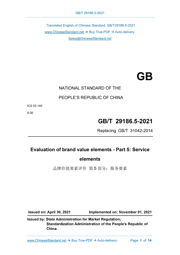 GB/T 29186.5-2021: Evaluation of brand value elements - Part 5: Service elements Delivery: 9 seconds. True-PDF full-copy in English & invoice will be downloaded + auto-delivered via email. See step-by-step procedure Status: Valid