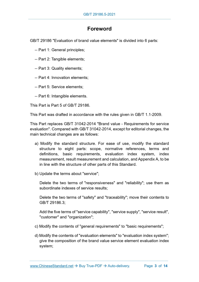 Similar standardsGB/T 29186.5-2021: Evaluation of brand value elements - Part 5: Service elements---This is an excerpt. Full copy of true-PDF in English version (including equations, symbols, images, flow-chart, tables, and figures etc.), auto-downloaded/delivered in 9 seconds, can be purchased online: https://www.ChineseStandard.net/PDF.aspx/GBT29186.5-2021GB NATIONAL STANDARD OF THE PEOPLE’S REPUBLIC OF CHINA ICS 03.140 A 00 Replacing GB/T 31042-2014 Evaluation of brand value elements - Part 5: Service elements ISSUED ON: APRIL 30, 2021 IMPLEMENTED ON: NOVEMBER 01, 2021 Issued by: State Administration for Market Regulation; Standardization Administration of the People’s Republic of China. Table of ContentsForeword ... 3 1 Scope ... 5 2 Normative references ... 5 3 Terms and definitions ... 5 4 Basic requirements ... 7 5 Evaluation index system ... 7 6 Index measurement ... 8 7 Result measurement and calculation ... 11 Appendix A (Informative) Examples of evaluation indexes of brand value service elements ... 13ForewordGB/T 29186 "Evaluation of brand value elements" is divided into 6 parts: -- Part 1: General principles; -- Part 2: Tangible elements; -- Part 3: Quality elements; -- Part 4: Innovation elements; -- Part 5: Service elements; -- Part 6: Intangible elements. This Part is Part 5 of GB/T 29186. This Part was drafted in accordance with the rules given in GB/T 1.1-2009. This Part replaces GB/T 31042-2014 "Brand value - Requirements for service evaluation". Compared with GB/T 31042-2014, except for editorial changes, the main technical changes are as follows: a) Modify the standard structure. For ease of use, modify the standard structure to eight parts: scope, normative references, terms and definitions, basic requirements, evaluation index system, index measurement, result measurement and calculation, and Appendix A, to be in line with the structure of other parts of this Standard. b) Update the terms about "service"; Delete the two terms of "responsiveness" and "reliability"; use them as subordinate indexes of service results; Delete the two terms of "safety" and "traceability"; move their contents to GB/T 29186.3; Add the five terms of "service capability", "service supply", "service result", "customer" and "organization"; c) Modify the contents of "general requirements" to "basic requirements"; d) Modify the contents of "evaluation elements" to "evaluation index system"; give the composition of the brand value service element evaluation index system; Evaluation of brand value elements - Part 5: Service elements1 ScopeThis Part of GB/T 29186 specifies the basic requirements, evaluation index system, index measurement, result measurement and calculation for the evaluation of brand value service elements. This Part applies to various entities to carry out evaluation of brand value elements, brand evaluation and brand management activities.2 Normative referencesThe following documents are indispensable for the application of this document. For dated references, only the dated version applies to this document. For undated references, the latest edition (including all amendments) applies to this document. GB/T 19000-2016, Quality management systems - Fundamentals and vocabulary GB/T 24620-2009, Development of service standards - Recommendations for addressing consumer issues GB/T 28222, General principles for development of service standards GB/T 29185, Brand value - Vocabulary GB/T29186.1, Evaluation of brand value elements - Part 1: General principles GB/T 36733-2018, Evaluation guideline for service quality ISO 20671:2019 Brand evaluation - Principles and fundamentals3 Terms and definitionsTerms and definitions determined by GB/T 19000-2016, GB/T 24620-2009, GB/T 29185, GB/T 29186.1, GB/T 36733-2018, ISO 20671:2019 and the following ones are applicable to this document. For ease of use, some of the terms and definitions in GB/T 19000-2016 are repeated below. Note: Generally, use the SERVQUAL theory to carry out evaluation from five aspects: tangibility, reliability, responsiveness, guarantee and empathy. 3.5 Customer Individuals or organizations (3.6) that can or actually accept the products or services (3.1) provided for them or on request. Examples: consumers, principals, end users, retailers, receivers, beneficiaries, and purchasers of products or services from internal processes. Note: Customers can be internal or external to the organization. [GB/T 19000-2016, definition 3.2.4] 3.6 Organization A person or a group of people whose functions are composed of responsibilities, powers and mutual relations, in order to achieve the goal. Note: The concept of organization includes, but is not limited to, agents, companies, groups, commercial firms, enterprises and public institutions, administrative agencies, joint ventures, associations, charities or research institutions, or parts or combinations of the above organizations, regardless of whether they are legal organizations, public or private. [GB/T 19000-2016, definition 3.2.1]4 Basic requirementsThe evaluation of brand value service elements shall be carried out in accordance with the general principles and evaluation procedures that are specified in GB/T 29186.1. When constructing the evaluation index system, obtaining evaluation data, calculating evaluation results, and issuing evaluation reports, it must comply with corresponding requirements of GB/T 29186.1; the personnel implementing the evaluation shall meet the capacity requirements which are set out in GB/T 29186.1.5 Evaluation index system5.1 Overview When evaluating the brand value service elements, it can be carried out from three aspects: service capacity, service supply and service result. 5.2 Index system composition ......Source: Above contents are excerpted from the full-copy PDF -- translated/reviewed by: www.ChineseStandard.net / Wayne Zheng et al. Tips & Frequently Asked Questions:Question 1: How long will the true-PDF of English version of GB/T 29186.5-