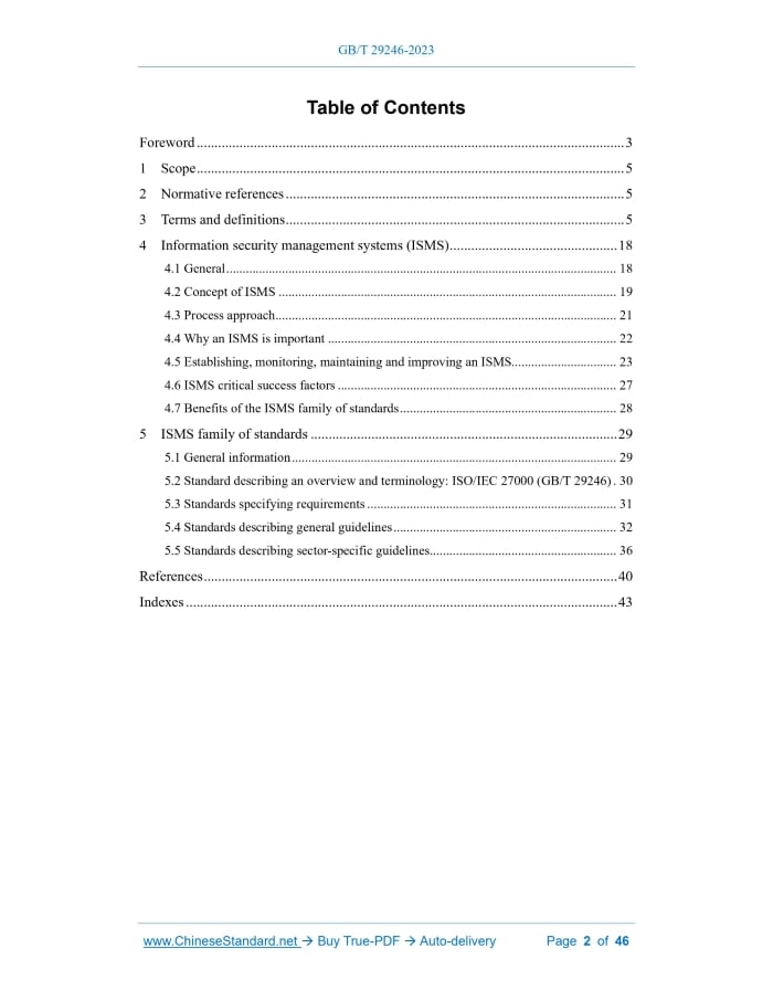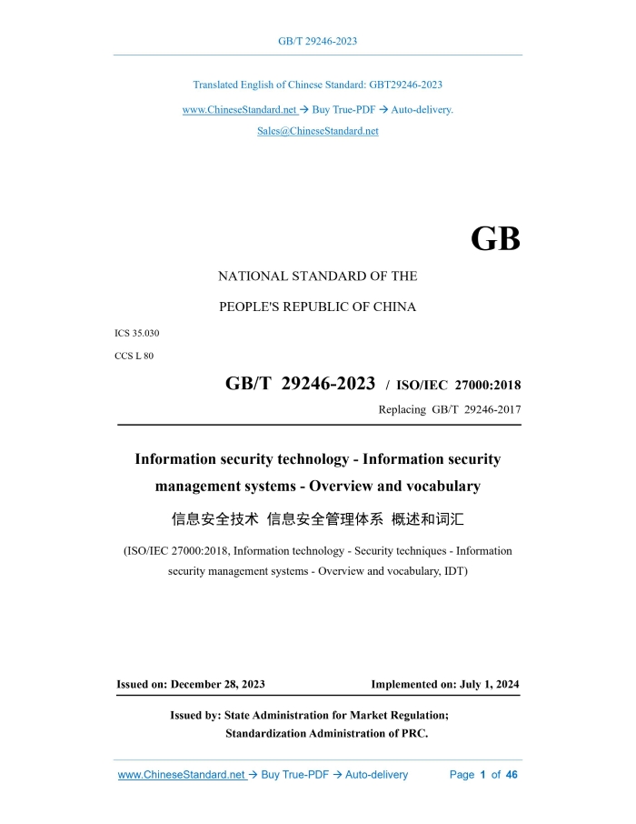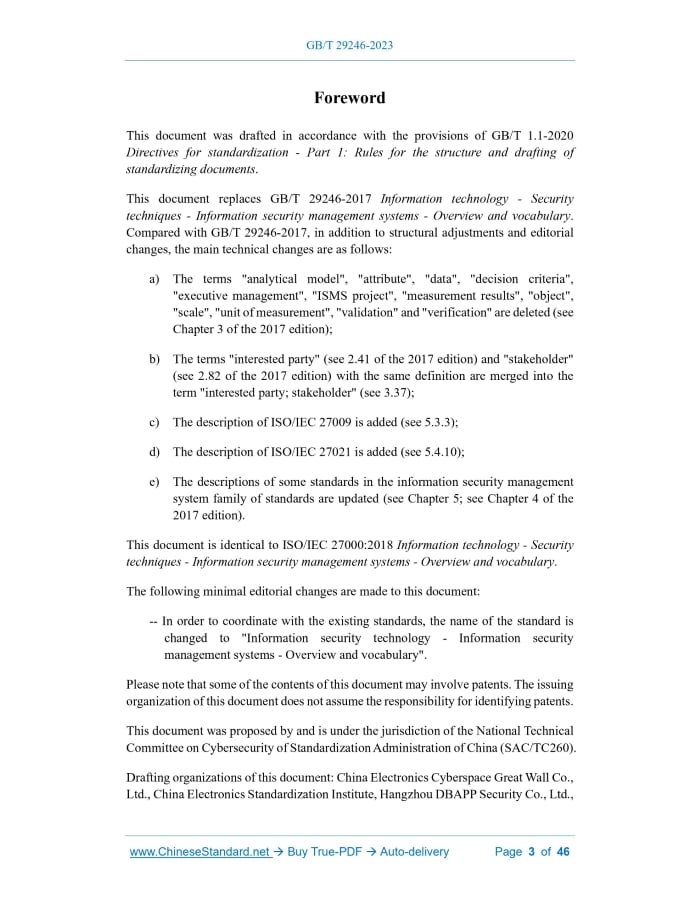 Similar standardsGB/T 29246-2023: Information security technology - Information security management systems - Overview and vocabulary---This is an excerpt. Full copy of true-PDF in English version (including equations, symbols, images, flow-chart, tables, and figures etc.), auto-downloaded/delivered in 9 seconds, can be purchased online: https://www.ChineseStandard.net/PDF.aspx/GBT29246-2023 GB NATIONAL STANDARD OF THE PEOPLE'S REPUBLIC OF CHINA ICS 35.030 CCS L 80 GB/T 29246-2023 / ISO/IEC 27000.2018 Replacing GB/T 29246-2017 Information security technology - Information security management systems - Overview and vocabulary (ISO/IEC 27000.2018, Information technology - Security techniques - Information security management systems - Overview and vocabulary, IDT) Issued on. DECEMBER 28, 2023 Implemented on. JULY 1, 2024 Issued by. State Administration for Market Regulation; Standardization Administration of PRC. Table of ContentsForeword... 3 1 Scope... 5 2 Normative references... 5 3 Terms and definitions... 5 4 Information security management systems (ISMS)... 18 4.1 General... 18 4.2 Concept of ISMS... 19 4.3 Process approach... 21 4.4 Why an ISMS is important... 22 4.5 Establishing, monitoring, maintaining and improving an ISMS... 23 4.6 ISMS critical success factors... 27 4.7 Benefits of the ISMS family of standards... 28 5 ISMS family of standards... 29 5.1 General information... 29 5.2 Standard describing an overview and terminology. ISO/IEC 27000 (GB/T 29246). 30 5.3 Standards specifying requirements... 31 5.4 Standards describing general guidelines... 32 5.5 Standards describing sector-specific guidelines... 36 References... 40 Indexes... 43ForewordThis document was drafted in accordance with the provisions of GB/T 1.1-2020 Directives for standardization - Part 1.Rules for the structure and drafting of standardizing documents. This document replaces GB/T 29246-2017 Information technology - Security techniques - Information security management systems - Overview and vocabulary. Compared with GB/T 29246-2017, in addition to structural adjustments and editorial changes, the main technical changes are as follows. a) The terms "analytical model", "attribute", "data", "decision criteria", "executive management", "ISMS project", "measurement results", "object", "scale", "unit of measurement", "validation" and "verification" are deleted (see Chapter 3 of the 2017 edition); b) The terms "interested party" (see 2.41 of the 2017 edition) and "stakeholder" (see 2.82 of the 2017 edition) with the same definition are merged into the term "interested party; stakeholder" (see 3.37); c) The description of ISO/IEC 27009 is added (see 5.3.3); d) The description of ISO/IEC 27021 is added (see 5.4.10); e) The descriptions of some standards in the information security management system family of standards are updated (see Chapter 5; see Chapter 4 of the 2017 edition). This document is identical to ISO/IEC 27000.2018 Information technology - Security techniques - Information security management systems - Overview and vocabulary. The following minimal editorial changes are made to this document. -- In order to coordinate with the existing standards, the name of the standard is changed to "Information security technology - Information security management systems - Overview and vocabulary". Please note that some of the contents of this document may involve patents. The issuing organization of this document does not assume the responsibility for identifying patents. This document was proposed by and is under the jurisdiction of the National Technical Committee on Cybersecurity of Standardization Administration of China (SAC/TC260). Drafting organizations of this document. China Electronics Cyberspace Great Wall Co., Ltd., China Electronics Standardization Institute, Hangzhou DBAPP Security Co., Ltd., China Software Testing Center, China Academy of Information and Communications Technology, CESI Certification Co., Ltd., China Information Consulting and Designing Institute Co., Ltd., National Computer Network Emergency Response Technical Team/Coordination Center of China, Sangfor Technologies Co., Ltd., Venustech Group Co., Ltd., Changyang Technology (Beijing) Co., Ltd., the Third Research Institute of the Ministry of Public Security, Shenzhen University, Beijing Baidu Netcom Science and Technology Co., Ltd., Beijing Powertime Co., Ltd., China Three Gorges Corporation. Main drafters of this document. Min Jinghua, Wang Huili, Fan Bo, Zhou Yachao, Zuo Ran, Li Xintian, Li Wangwei, Zhao Lihua, Gao Lifen, Wang Wenlei, Liu Chen, Zhu Yuze, Zhao Hua, Wang Ning, Liu Weili, Wang Haitang, Guo Jianling, Pan Wenbo, Tang Jin, Wang Bingzheng. The previous versions of this document and the documents it replaces are as follows. -- First issued in 2012 as GB/T 29246-2012; -- First revised in 2017; -- This is the second revision. Information security technology - Information security management systems - Overview and vocabulary1 ScopeThis document provides the overview of information security management systems (ISMS). It also provides terms and definitions commonly used in the ISMS family of standards.2 Normative referencesThere are no normative references in this document.3 Terms and definitionsThe measure (3.42) defined in terms of an attribute and the method for quantifying it. A person or organization (3.50) that can affect, be affected by, or perceive itself to be affected by a decision or activity.4 Information security management systems (ISMS)Protecting information assets through defining, achieving, maintaining, and improving information security effectively is essential to enable an organization to achieve its objectives, and maintain and enhance its legal compliance and image.5 ISMS family of standardsThe ISMS family of standards consists of inter-related standards, already published or under development, and contains a number of significant structural components. These components are focused on. Information techno