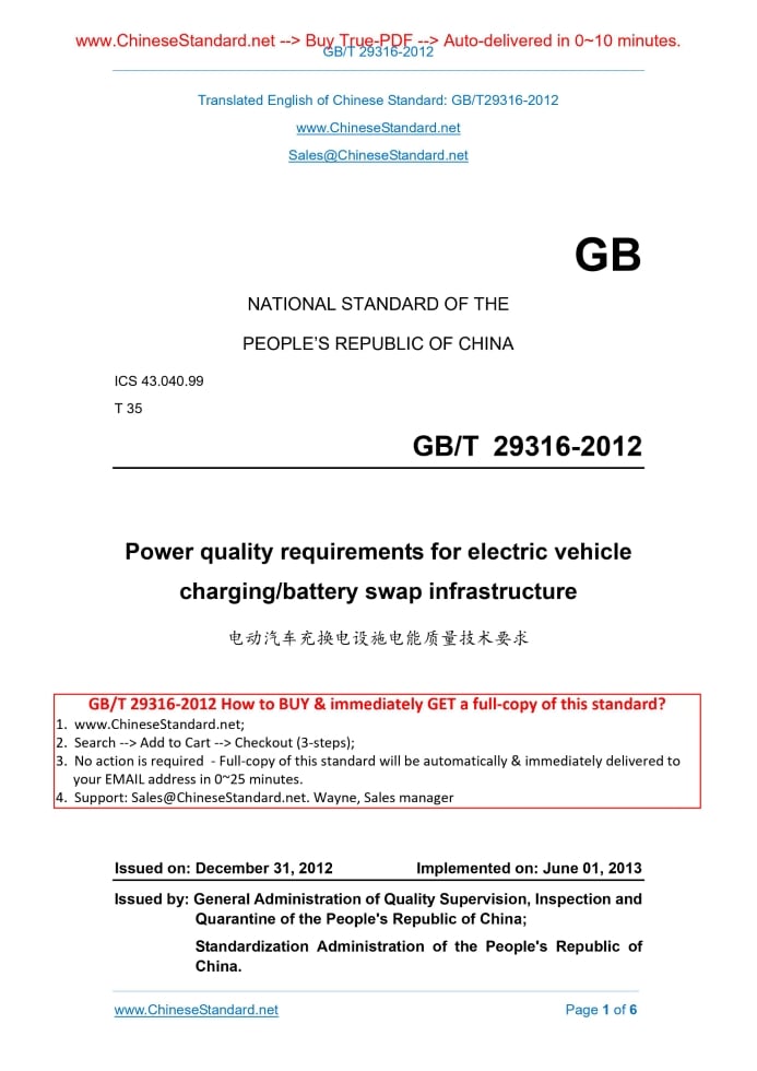 GB/T 29316-2012: Power quality requirements for electric vehicle charging/battery swap infrastructure Delivery: 9 seconds. True-PDF full-copy in English & invoice will be downloaded + auto-delivered via email. See step-by-step procedure Status: Valid