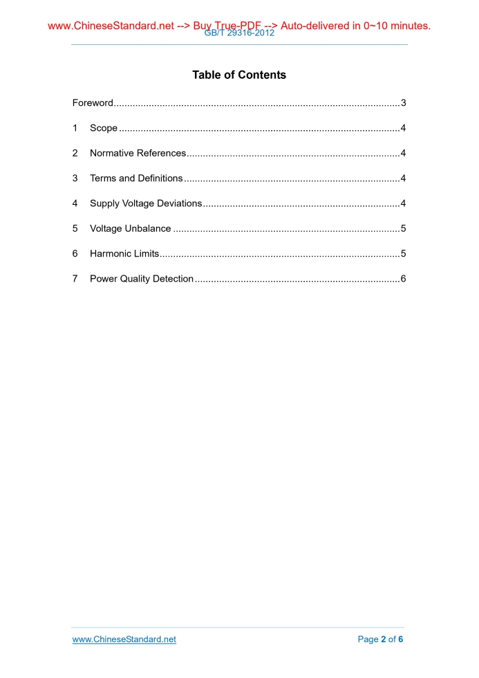Similar standardsGB/T 29316-2012: Power quality requirements for electric vehicle charging/battery swap infrastructure---This is an excerpt. Full copy of true-PDF in English version (including equations, symbols, images, flow-chart, tables, and figures etc.), auto-downloaded/delivered in 9 seconds, can be purchased online: https://www.ChineseStandard.net/PDF.aspx/GBT29316-2012 GB NATIONAL STANDARD OF THE PEOPLE’S REPUBLIC OF CHINA ICS 43.040.99 T 35 Power quality requirements for electric vehicle charging/battery swap infrastructure Issued on. DECEMBER 31, 2012 Implemented on. JUNE 01, 2013 Issued by. General Administration of Quality Supervision, Inspection and Quarantine of the People's Republic of China; Standardization Administration of the People's Republic of China. Table of ContentsForeword... 3 1 Scope... 4 2 Normative References... 4 3 Terms and Definitions... 4 4 Supply Voltage Deviations... 4 5 Voltage Unbalance... 5 6 Harmonic Limits... 5 7 Power Quality Detection... 6ForewordThis Standard is drafted according to the rules stated in GB/T 1.1-2009. This Standard was proposed by and shall be under the jurisdiction of China Electricity Council. Drafting organizations of this Standard. China Southern Power Grid Company, Southern Power Grid Academy of Science, State Grid Academy of Science, China Electric Power Research Institute, Guangdong Power Grid Academy of Science, Guangdong Power Design and Research Institute AND Shenzhen Power Supply Planning and Design Institute Co., Ltd. The main drafters of this Standard. Wang Xiaomao, Jiang Hao, Wu Junyang, Zhu Jinda, Wu Shangjie, Xue Wu, Chen Liangliang, Cui Yu, Yan Hui, Li Tao, Zhao Wei, Chen Hui, Sun Weiming, Yu Nanhua, Zhou Yu, Dong Xuzhu and Hu Yufeng. Power quality requirements for electric vehicle charging/battery swap infrastructure1 ScopeThis Standard specifies the relevant standards and testing requirements of power quality for charging facilities of electric vehicles. This Standard applies to the charging facilities of electric vehicles, including AC charging piles and charging stations.2 Normative ReferencesThe articles contained in the following documents have become part of this Standard when they are quoted herein. For the dated documents so quoted, all the modifications (including all corrections) or revisions made thereafter shall be applicable to this Standard. GB/T 12325 Power quality - Deviation of supply voltage GB/T 14549 Quality of electric energy supply - Harmonics in public supply network GB/T 15543 Power quality - Three-phase voltage unbalance3 Terms and DefinitionsThe terms and definitions defined in GB/T 12325, GB/T 14549, GB/T 15543, GB/T 19862, GB/T 29317 and GB/T 29772 apply to this document.4 Supply Voltage Deviations4.1 The supply voltage deviations for charging facilities of electric vehicles shall meet the requirements in Table 1.5 Voltage Unbalance5.1 When charging facilities of electric vehicles access to public grid and the power grid is under normal operation, the unbalance of negative sequence voltage at the point of common coupling shall not exceed 2%, and shall not exceed 4% in short time.6 Harmonic Limits6.1 The harmonic voltage limits (phase voltage) when charging facilities of electric vehicles access to common coupling point in public grid are required to meet the provisions of GB/T 14549. 6.2 The allowable value for harmonic current when charging facilities of electric vehicles access to common coupling point in public grid shall meet the provisions of GB/T 14549. 6.4 In rated power output of on-board battery charger accessed with AC charging pile, total harmonic distortion of current on AC input side shall be equal or less than 8% with power factor equal or greater than 0.95.7 Power Quality Detection7.1 The power quality detection point of charging facilities should be selected from inlet wire of power supply; monitoring equipment should select Class A equipment that accords with the provisions of GB/T 14549. ......Source: Above contents are excerpted from the full-copy PDF -- translated/reviewed by: www.ChineseStandard.net / Wayne Zheng et al. Tips & Frequently Asked Questions:Question 1: How long will the true-PDF of English version of GB/T 29316-2012 be delivered?Answer: The full copy PDF of English version of GB/T 29316-2012 can be downloaded in 9 seconds, and it will also be emailed to you in 9 seconds (double mechanisms to ensure the delivery reliably), with PDF-invoice.Question 2: Can I share the purchased PDF of GB/T 29316-2012_English with my colleagues?Answer: Yes. The purchased PDF of GB/T 29316-2012_English will be deemed to be sold to your employer/organization who actually paid for it, including your colleagues and your employer's intranet.Question 3: Does the price include tax/VAT?Answer: Yes. Our tax invoice, downloaded/delivered in 9 seconds, includes all tax/VAT and complies with 100+ countries' tax regulations (tax exempted in 100+ countries) -- See Avoidance of Double Taxation Agreements (DTAs): List of DTAs signed between Singapore and 100+ countriesQuestion 4: Do you accept my currency other than USD?Answer: Yes. www.ChineseStandard.us -- GB/T 29316-2012 -- Click this link and select your country/currency to pay, the exact amount in your currency will be printed on the invoice. Full PDF will also be downloaded/emailed in 9 seconds.How to buy and download a true PDF of English version of GB/T 29316-2012?A step-by-step guide to download PDF of GB/T 29316-2012_EnglishStep 1: Visit website https://www.ChineseStandard.net (Pay in USD), or https://www.ChineseStandard.us (Pay in any currencies such as Euro, KRW, JPY, AUD).Step 2: Search keyword "GB/T 29316-2012". Step 3: Click "Add to Cart". If multiple PDFs are required, repeat steps 2 and 3 to add up to 12 PDFs to cart. Step 4: Select payment option (Via payment agents Stripe or PayPal). Step 5: Customize Tax Invoice -- Fill up your email etc. Step 6: Click "Checkout". Step 7: Make payment by credit card, PayPal, Google