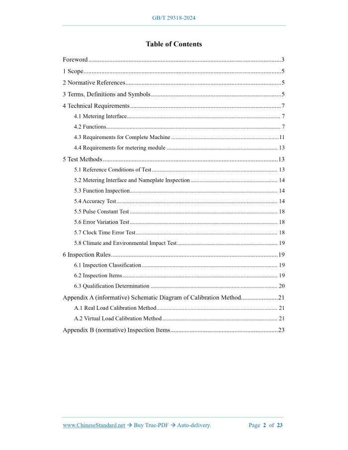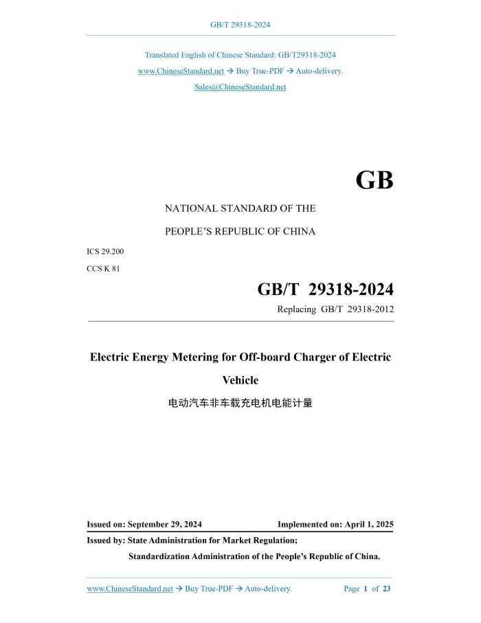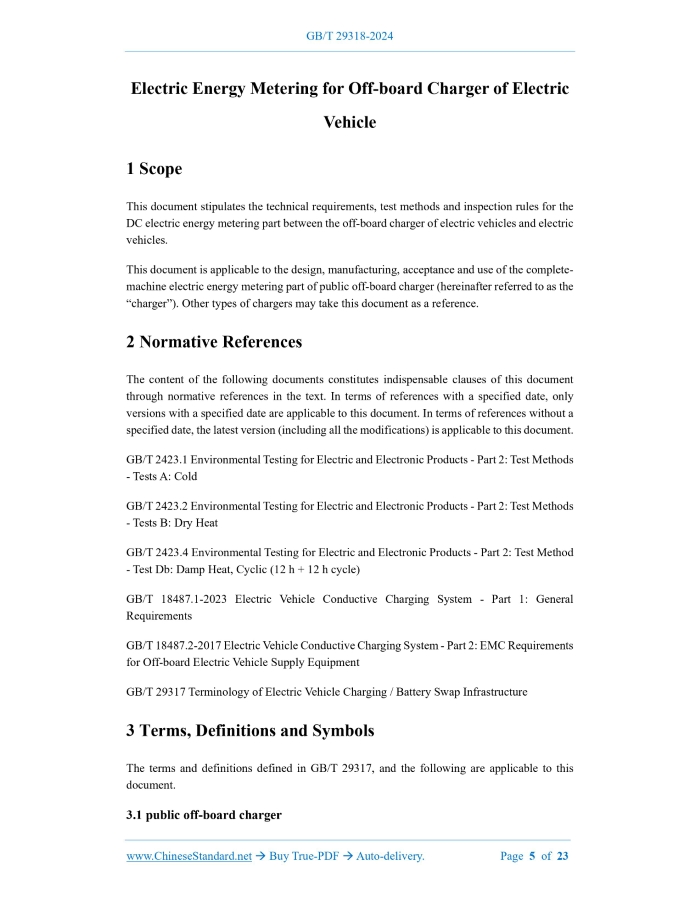 Similar standardsGB/T 29318-2024: Electric energy metering for off-board charger of electric vehicle---This is an excerpt. Full copy of true-PDF in English version (including equations, symbols, images, flow-chart, tables, and figures etc.), auto-downloaded/delivered in 9 seconds, can be purchased online: https://www.ChineseStandard.net/PDF.aspx/GBT29318-2024GB NATIONAL STANDARD OF THE PEOPLE’S REPUBLIC OF CHINA ICS 29.200 CCS K 81 Replacing GB/T 29318-2012 Electric Energy Metering for Off-board Charger of Electric Vehicle Issued on. SEPTEMBER 29, 2024 Implemented on. APRIL 1, 2025 Issued by. State Administration for Market Regulation; Standardization Administration of the People’s Republic of China. Table of ContentsForeword... 3 1 Scope... 5 2 Normative References... 5 3 Terms, Definitions and Symbols... 5 4 Technical Requirements... 7 4.1 Metering Interface... 7 4.2 Functions... 7 4.3 Requirements for Complete Machine... 11 4.4 Requirements for metering module... 13 5 Test Methods... 13 5.1 Reference Conditions of Test... 13 5.2 Metering Interface and Nameplate Inspection... 14 5.3 Function Inspection... 14 5.4 Accuracy Test... 14 5.5 Pulse Constant Test... 18 5.6 Error Variation Test... 18 5.7 Clock Time Error Test... 18 5.8 Climate and Environmental Impact Test... 19 6 Inspection Rules... 19 6.1 Inspection Classification... 19 6.2 Inspection Items... 19 6.3 Qualification Determination... 20 Appendix A (informative) Schematic Diagram of Calibration Method... 21 A.1 Real Load Calibration Method... 21 A.2 Virtual Load Calibration Method... 21 Appendix B (normative) Inspection Items... 231 ScopeThis document stipulates the technical requirements, test methods and inspection rules for the DC electric energy metering part between the off-board charger of electric vehicles and electric vehicles. This document is applicable to the design, manufacturing, acceptance and use of the complete- machine electric energy metering part of public off-board charger (hereinafter referred to as the “charger”). Other types of chargers may take this document as a reference.2 Normative ReferencesThe content of the following documents constitutes indispensable clauses of this document through normative references in the text. In terms of references with a specified date, only versions with a specified date are applicable to this document. In terms of references without a specified date, the latest version (including all the modifications) is applicable to this document. GB/T 2423.1 Environmental Testing for Electric and Electronic Products - Part 2.Test Methods - Tests A. Cold GB/T 2423.2 Environmental Testing for Electric and Electronic Products - Part 2.Test Methods - Tests B. Dry Heat GB/T 2423.4 Environmental Testing for Electric and Electronic Products - Part 2.Test Method - Test Db. Damp Heat, Cyclic (12 h + 12 h cycle) GB/T 18487.1-2023 Electric Vehicle Conductive Charging System - Part 1.General Requirements GB/T 18487.2-2017 Electric Vehicle Conductive Charging System - Part 2.EMC Requirements for Off-board Electric Vehicle Supply Equipment GB/T 29317 Terminology of Electric Vehicle Charging / Battery Swap Infrastructure3 Terms, Definitions and SymbolsThe terms and definitions defined in GB/T 29317, and the following are applicable to this document. 3.1 public off-board charger An off-board charger used to provide public services and carry out electric energy transactions. 3.2 total charging energy The total charging energy recorded by the charger from the first charge when it is in working condition. 3.3 rate amount The amount of electric energy output by the charger during the corresponding period of time when it is, in working condition, multiplied by the rate. 3.4 additional amount Charges in addition to the rate amount recorded when the charger is in working condition. NOTE. for example, parking fees, etc. 3.5 billable amount The sum of the rate amount and the additional amount recorded when the charger is in working condition, which is used for settlement with the user.4 Technical Requirements4.1 Metering Interface The charger’s interface for electric energy metering satisfies the following requirements. 4.2 Functions 4.2.1 Metering function The charger has the following functions. 4.2.2 Billing function The charger shall have the function of calculating the billable amount based on time, electric energy and rate, etc. 4.2.3 Rate period setting function The charger has the following functions. 4.2.4 Time adjustment function The charger shall have a time adjustment function. In addition, it is prohibited to adjust the time during the charging process. 4.2.5 Information recording function 4.2.6 Clear function The charger has the following functions. 4.2.7 Display function 4.2.7.1 Basic requirements The charger shall have a display function that allows display on the machine body or other carriers. 4.2.7.2 Display digits and resolution The display digits and resolution of the charger satisfy the following requirements. 4.2.7.3 Charging display 4.2.8 Charging receipt function The charging receipt function of the charger satisfies the following requirements. 4.2.9 Consistency requirements If the charger has multiple human-machine interaction modes, all information related to metering and billing shall be consistent at the end of charging. 4.2.10 Software protection function 4.2.10.1 Prevention of mis-operation The charger shall have a software protection function that minimizes the possibility of mis- operation. 4.2.11 Other functions During the charging process, if the charger cannot normally perform billing, the current charging, metering and billing shall be immediately stopped, and the metering and billing value shall be stored; after the above-mentioned functions are restored, metering and billing shall be re-started. 4.3 Requirements for Complete Machine 4.3.1 Connection point location The connection point location of the charger satisfies the following requirements. 4.3.2 Nameplate