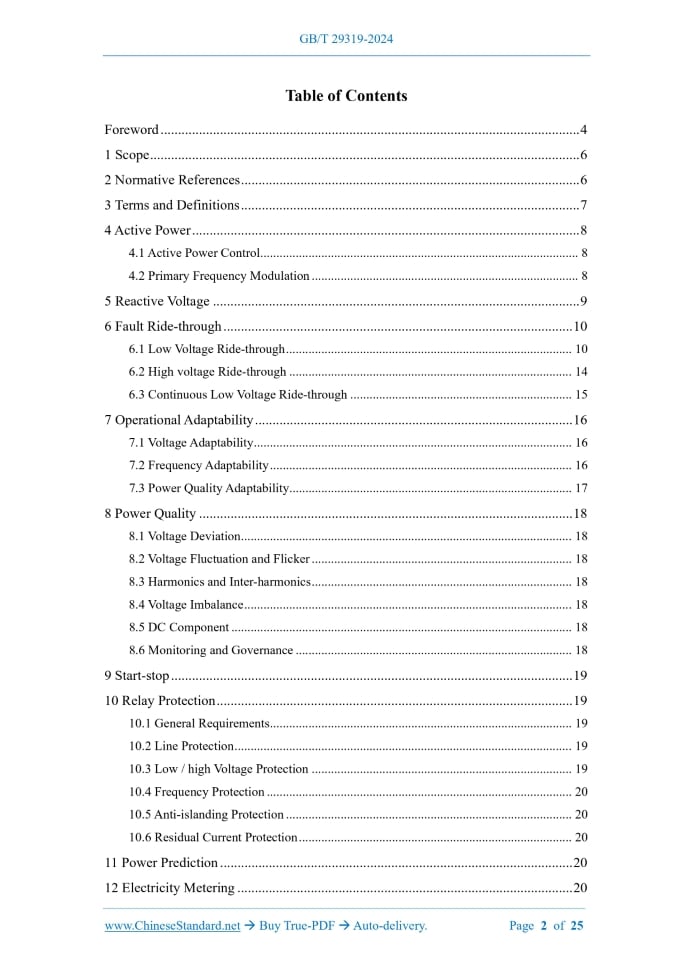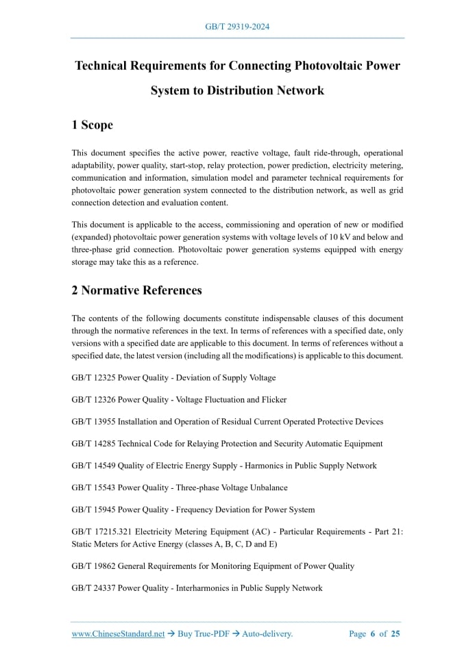 Similar standardsGB/T 29319-2024: Technical requirements for connecting photovoltaic power system to distribution network---This is an excerpt. Full copy of true-PDF in English version (including equations, symbols, images, flow-chart, tables, and figures etc.), auto-downloaded/delivered in 9 seconds, can be purchased online: https://www.ChineseStandard.net/PDF.aspx/GBT29319-2024 GB NATIONAL STANDARD OF THE PEOPLE’S REPUBLIC OF CHINA ICS 27.160 CCS F 12 Replacing GB/T 29319-2012 Technical Requirements for Connecting Photovoltaic Power System to Distribution Network Issued on: MARCH 15, 2024 Implemented on: MARCH 15, 2024 Issued by. State Administration for Market Regulation; Standardization Administration of the People’s Republic of China. Table of ContentsForeword... 4 1 Scope... 6 2 Normative References... 6 3 Terms and Definitions... 7 4 Active Power... 8 4.1 Active Power Control... 8 4.2 Primary Frequency Modulation... 8 5 Reactive Voltage... 9 6 Fault Ride-through... 10 6.1 Low Voltage Ride-through... 10 6.2 High voltage Ride-through... 14 6.3 Continuous Low Voltage Ride-through... 15 7 Operational Adaptability... 16 7.1 Voltage Adaptability... 16 7.2 Frequency Adaptability... 16 7.3 Power Quality Adaptability... 17 8 Power Quality... 18 8.1 Voltage Deviation... 18 8.2 Voltage Fluctuation and Flicker... 18 8.3 Harmonics and Inter-harmonics... 18 8.4 Voltage Imbalance... 18 8.5 DC Component... 18 8.6 Monitoring and Governance... 18 9 Start-stop... 19 10 Relay Protection... 19 10.1 General Requirements... 19 10.2 Line Protection... 19 10.3 Low / high Voltage Protection... 19 10.4 Frequency Protection... 20 10.5 Anti-islanding Protection... 20 10.6 Residual Current Protection... 20 11 Power Prediction... 20 12 Electricity Metering... 20 Technical Requirements for Connecting Photovoltaic Power System to Distribution Network1 ScopeThis document specifies the active power, reactive voltage, fault ride-through, operational adaptability, power quality, start-stop, relay protection, power prediction, electricity metering, communication and information, simulation model and parameter technical requirements for photovoltaic power generation system connected to the distribution network, as well as grid connection detection and evaluation content. This document is applicable to the access, commissioning and operation of new or modified (expanded) photovoltaic power generation systems with voltage levels of 10 kV and below and three-phase grid connection. Photovoltaic power generation systems equipped with energy storage may take this as a reference.2 Normative ReferencesThe contents of the following documents constitute indispensable clauses of this document through the normative references in the text. In terms of references with a specified date, only versions with a specified date are applicable to this document. In terms of references without a specified date, the latest version (including all the modifications) is applicable to this document. GB/T 12325 Power Quality - Deviation of Supply Voltage GB/T 12326 Power Quality - Voltage Fluctuation and Flicker GB/T 13955 Installation and Operation of Residual Current Operated Protective Devices GB/T 14285 Technical Code for Relaying Protection and Security Automatic Equipment GB/T 14549 Quality of Electric Energy Supply - Harmonics in Public Supply Network GB/T 15543 Power Quality - Three-phase Voltage Unbalance GB/T 15945 Power Quality - Frequency Deviation for Power System GB/T 17215.321 Electricity Metering Equipment (AC) - Particular Requirements - Part 21. Static Meters for Active Energy (classes A, B, C, D and E) GB/T 19862 General Requirements for Monitoring Equipment of Power Quality GB/T 24337 Power Quality - Interharmonics in Public Supply Network GB/T 32826 Guide for Modeling Photovoltaic Power System GB/T 32892 Model and Parameter Test Regulation for Photovoltaic Power System GB/T 33982 Technical Specification for Grid Connection Protection of Distributed Resources GB/T 40595 Guide for Technology and Test on Primary Frequency Control of Grid-connected Power Resources DL/T 448 Technical Administrative Code of Electric Energy Metering DL/T 614 Multifunction Electricity Metering Equipment (A.C.) DL/T 634.5101 Telecontrol Equipment and Systems - Part 5.Transmission Protocols - Section 101.Companion Standard for Basic Telecontrol Tasks DL/T 634.5104 Telecontrol Equipment and Systems - Part 5-104.Transmission Protocols - Network Access for IEC 60870-5-101 Using Standard Transport Profiles DL/T 645 Multi-function Watt-hour Meter Communication Protocol DL/T 698.45 Data Acquisition and Management System for Electrical Energy - Part 4-5. Communication Protocol - Object Oriented Data Exchange Protocol3 Terms and DefinitionsThe terms and definitions defined in GB/T 12325 and GB/T 40595 and the following are applicable to this document. 3.1 photovoltaic (PV) power generation system A power generation system that utilizes the photovoltaic effect of solar cells to convert solar radiation energy into electrical energy. 3.2 point of common coupling The point where the photovoltaic power generation system is connected to the public power grid. 3.3 point of connection For a photovoltaic power generation system with a booster station, it is the bus or node on the high-voltage side of the booster station; for a photovoltaic power generation system without a booster station, it is the output aggregation point of the photovoltaic power generation system. NOTE. see Appendix A for an illustration of the point of connection and point of common coupling. 3.4 response time During the control process, the time required from receiving a control command or detecting a change in the state quantity triggering the control operation, until the actual output change of the observed variable reaches 90% of the difference between the control target value and the initial value for the first time. [source. GB/T 40289-2021, 3.13]4 Active Power4.1 Active Power Control 4.1.