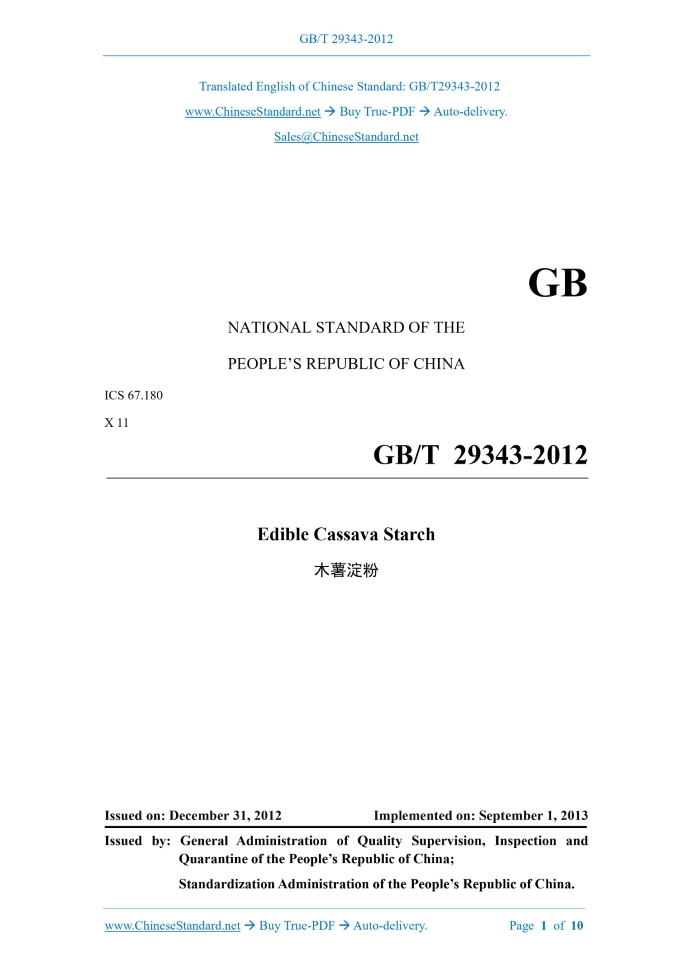 GB/T 29343-2012: Edible cassava starch Delivery: 9 seconds. True-PDF full-copy in English & invoice will be downloaded + auto-delivered via email. See step-by-step procedure Status: Valid