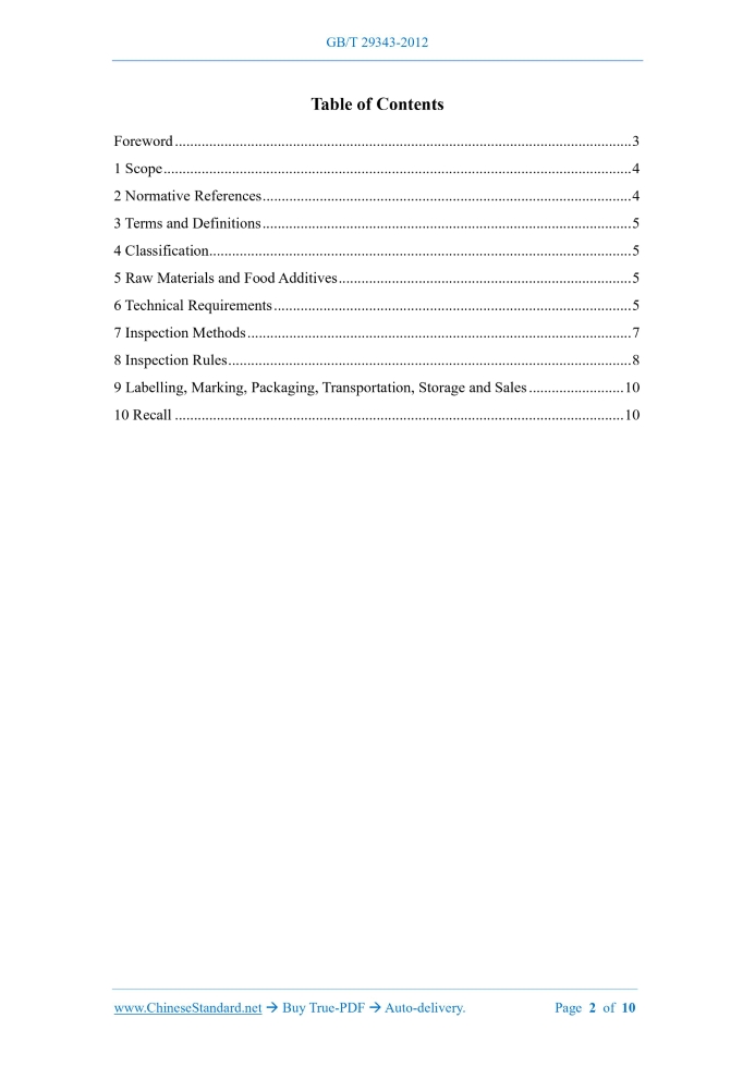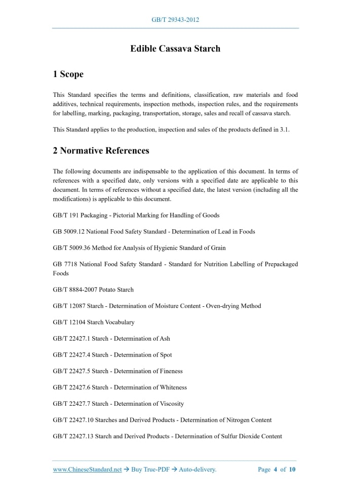 Similar standardsGB/T 29343-2012: Edible cassava starch---This is an excerpt. Full copy of true-PDF in English version (including equations, symbols, images, flow-chart, tables, and figures etc.), auto-downloaded/delivered in 9 seconds, can be purchased online: https://www.ChineseStandard.net/PDF.aspx/GBT29343-2012GB NATIONAL STANDARD OF THE PEOPLE’S REPUBLIC OF CHINA ICS 67.180 X 11 Edible Cassava Starch 木薯淀粉 Issued on: DECEMBER 31, 2012 Implemented on: SEPTEMBER 1, 2013 Issued by. General Administration of Quality Supervision, Inspection and Quarantine of the People’s Republic of China; Standardization Administration of the People’s Republic of China. Table of ContentsForeword... 3 1 Scope... 4 2 Normative References... 4 3 Terms and Definitions... 5 4 Classification... 5 5 Raw Materials and Food Additives... 5 6 Technical Requirements... 5 7 Inspection Methods... 7 8 Inspection Rules... 8 9 Labelling, Marking, Packaging, Transportation, Storage and Sales... 10 10 Recall... 10 Edible Cassava Starch1 ScopeThis Standard specifies the terms and definitions, classification, raw materials and food additives, technical requirements, inspection methods, inspection rules, and the requirements for labelling, marking, packaging, transportation, storage, sales and recall of cassava starch. This Standard applies to the production, inspection and sales of the products defined in 3.1.2 Normative ReferencesThe following documents are indispensable to the application of this document. In terms of references with a specified date, only versions with a specified date are applicable to this document. In terms of references without a specified date, the latest version (including all the modifications) is applicable to this document. GB/T 191 Packaging - Pictorial Marking for Handling of Goods GB 5009.12 National Food Safety Standard - Determination of Lead in Foods GB/T 5009.36 Method for Analysis of Hygienic Standard of Grain GB 7718 National Food Safety Standard - Standard for Nutrition Labelling of Prepackaged Foods GB/T 8884-2007 Potato Starch GB/T 12087 Starch - Determination of Moisture Content - Oven-drying Method GB/T 12104 Starch Vocabulary GB/T 22427.1 Starch - Determination of Ash GB/T 22427.4 Starch - Determination of Spot GB/T 22427.5 Starch - Determination of Fineness GB/T 22427.6 Starch - Determination of Whiteness GB/T 22427.7 Starch - Determination of Viscosity GB/T 22427.10 Starches and Derived Products - Determination of Nitrogen Content GB/T 22427.13 Starch and Derived Products - Determination of Sulfur Dioxide Content JJF 1070 Rules of Metrological Testing for Net Quantity of Products in Prepackages with Fixed Content Measures for the Metrological Supervision and Administration of Quantitatively Packed Commodities (General Administration of Quality Supervision, Inspection and Quarantine, Order No. 75) Regulations on the Recall Management of Foods (General Administration of Quality Supervision, Inspection and Quarantine, Order No. 98)3 Terms and DefinitionsThe terms and definitions defined in GB/T 12104 and the following are applicable to this document. 3.1 cassava starch Starch extracted from cassava root tubers.4 Classification4.1 Edible cassava starch. 4.2 Industrial cassava starch.5 Raw Materials and Food Additives5.1 Raw Materials Cassava shall be free of peculiar smell or odor, shall not be rotten or moldy, and shall comply with relevant national requirements. 5.2 Food Additives They shall comply with the provisions of relevant national standards and industry standards.6 Technical Requirements6.1 Sensory Requirements It shall comply with the provisions of Table 1. 6.3 Safety Indicators of Edible Cassava Starch They shall comply with the provisions of relevant national food safety standards. 6.4 Net Content It shall comply with the provisions of the Measures for the Metrological Supervision and Administration of Quantitatively Packed Commodities.7 Inspection Methods7.1 Sensory Requirements 7.1.1 Take an appropriate amount of sample and place it in a white porcelain dish. Under natural light, observe its color, luster, shape and impurities with the naked eye. In addition, take a small amount of sample and after gelatinization, taste it. 7.1.2 Take 20 g of starch sample and put it into a 100 mL ground-mouth bottle. Add 50 mL of 50 C warm water, cover the bottle, shake it for 30 seconds, pour out the supernatant and smell it. 7.2 Physical and Chemical Indicators 7.2.1 Moisture Determine it in accordance with the method specified in GB/T 12087. 7.2.2 Ash content Determine it in accordance with the method specified in GB/T 22427.1. 7.2.3 Spots Determine it in accordance with the method specified in GB/T 22427.4. 7.2.4 Fineness Determine it in accordance with the method specified in GB/T 22427.5. 7.2.5 Whiteness Determine it in accordance with the method specified in GB/T 22427.6. 7.2.6 Viscosity Determine it in accordance with the method specified in GB/T 22427.7. 7.2.7 Protein moisture, ash content, spots, fineness, viscosity, whiteness and pH. 8.3.2.2 For industrial cassava starch, the exit-factory inspection items include sensory requirements, moisture, ash content, spots, fineness, viscosity and whiteness. 8.4 Type Inspection 8.4.1 Type inspection items include all items specified in Chapter 6 “Technical Requirements”. 8.4.2 Under one of the following circumstances, type inspection shall be carried out. a) When finalizing and appraising new products; b) When there is a major change in the source of raw materials or the production process; c) When production has been suspended for more than 3 months, and then, resumed; d) When the exit-factory inspection result is significantly different from the previous type inspection; e) When the national quality supervision institution or competent authority proposes a requirement for type inspection. 8.5 Determination and Re-inspection Rules 8.5.1 Exit-factory inspection determination and re-inspection 8.5.1.1 If all exit-fac