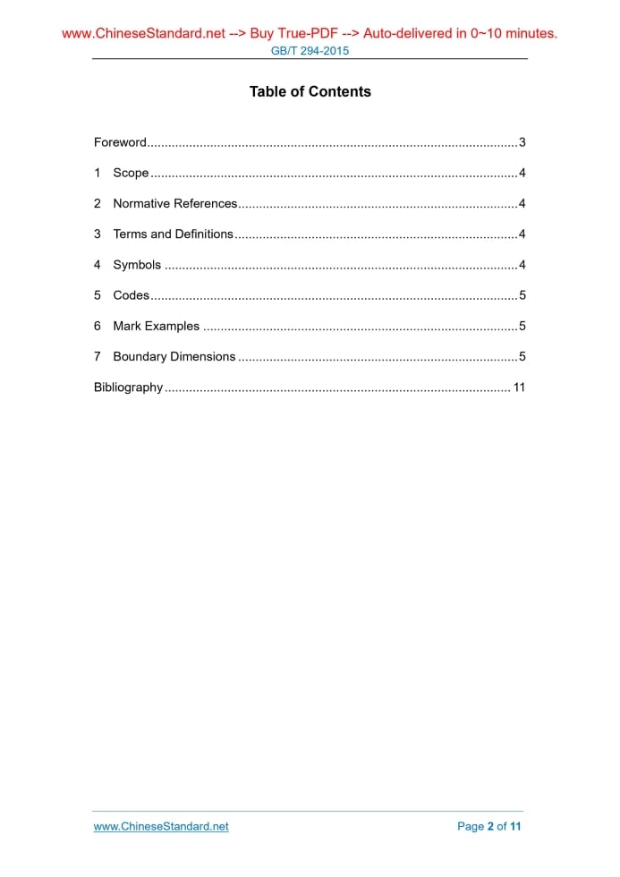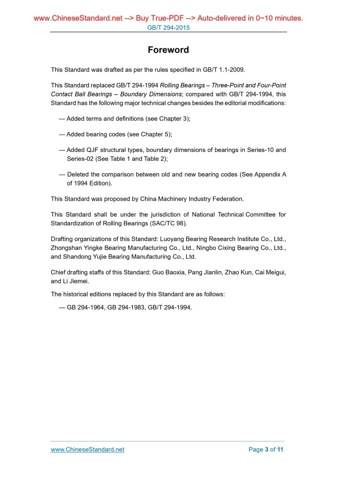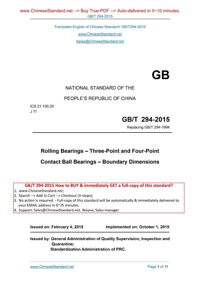 GB/T 294-2015: Rolling Bearings - Three-Point and Four-Point Contact Ball Bearings - Boundary Dimensions---This is an excerpt. Full copy of true-PDF in English version (including equations, symbols, images, flow-chart, tables, and figures etc.), auto-downloaded/delivered in 9 seconds, can be purchased online: https://www.ChineseStandard.net/PDF.aspx/GBT294-2015 GB NATIONAL STANDARD OF THE PEOPLE’S REPUBLIC OF CHINA ICS 21.100.20 J 11 Replacing GB/T 294-1994 Rolling Bearings – Three-Point and Four-Point Contact Ball Bearings – Boundary Dimensions Issued on: FEBRUARY 4, 2015 Implemented on: OCTOBER 1, 2015 Issued by. General Administration of Quality Supervision, Inspection and Quarantine; Standardization Administration of PRC. Table of ContentsForeword ... 3 1 Scope ... 4 2 Normative References ... 4 3 Terms and Definitions ... 4 4 Symbols ... 4 5 Codes ... 5 6 Mark Examples ... 5 7 Boundary Dimensions ... 5 Bibliography ... 11ForewordThis Standard was drafted as per the rules specified in GB/T 1.1-2009. This Standard replaced GB/T 294-1994 Rolling Bearings – Three-Point and Four-Point Contact Ball Bearings – Boundary Dimensions; compared with GB/T 294-1994, this Standard has the following major technical changes besides the editorial modifications. --- Added terms and definitions (see Chapter 3); --- Added bearing codes (see Chapter 5); --- Added QJF structural types, boundary dimensions of bearings in Series-10 and Series-02 (See Table 1 and Table 2); --- Deleted the comparison between old and new bearing codes (See Appendix A of 1994 Edition). This Standard was proposed by China Machinery Industry Federation. This Standard shall be under the jurisdiction of National Technical Committee for Standardization of Rolling Bearings (SAC/TC 98). Drafting organizations of this Standard. Luoyang Bearing Research Institute Co., Ltd., Zhongshan Yingke Bearing Manufacturing Co., Ltd., Ningbo Cixing Bearing Co., Ltd., and Shandong Yujie Bearing Manufacturing Co., Ltd. Chief drafting staffs of this Standard. Guo Baoxia, Pang Jianlin, Zhao Kun, Cai Meigui, and Li Jiemei. The historical editions replaced by this Standard are as follows. --- GB 294-1964, GB 294-1983, GB/T 294-1994. Rolling Bearings – Three-Point and Four-Point Contact Ball Bearings – Boundary Dimensions1 ScopeThis Standard specifies the boundary dimensions of three-point and four-point contact ball bearings (hereinafter referred to as “bearing”) stipulated in GB/T 273.3-2015. This Standard is applicable to the design and type-selection of the bearing.2 Normative ReferencesThe following documents are essential to the application of this document. For the dated documents, only the versions with the dates indicated are applicable to this document; for the undated documents, only the latest version (including all the amendments) are applicable to this document. GB/T 272-1993 Rolling Bearings – Identification Code GB/T 274-2000 Rolling Bearings – Chamfer Dimension – Maximum Values GB/T 6930-2002 Rolling Bearings – Vocabulary JB/T 2974-2004 Rolling Bearings – Identification Code – Supplemental Regulations3 Terms and DefinitionsThe terms and definitions defined in GB/T 6930-2002 are applicable to this document.4 SymbolsThe following symbols are applicable to this document. Unless otherwise is specified, the symbols shown in Figure 1~Figure 3 and values shown in Table 1~Table 3 are nominal dimensions. NOTE. the Figure is only structural example, the bearing doesn’t have to be exactly consistent Bibliography [1] GB/T 273.3-2015 Rolling Bearings – General Plan of Boundary Dimensions – Part 3. Radial Bearings ......Source: Above contents are excerpted from the full-copy PDF -- translated/reviewed by: www.ChineseStandard.net / Wayne Zheng et al. Tips & Frequently Asked Questions:Question 1: How long will the true-PDF of English version of GB/T 294-2015 be delivered?Answer: The full copy PDF of English version of GB/T 294-2015 can be downloaded in 9 seconds, and it will also be emailed to you in 9 seconds (double mechanisms to ensure the delivery reliably), with PDF-invoice.Question 2: Can I share the purchased PDF of GB/T 294-2015_English with my colleagues?Answer: Yes. The purchased PDF of GB/T 294-2015_English will be deemed to be sold to your employer/organization who actually paid for it, including your colleagues and your employer's intranet.Question 3: Does the price include tax/VAT?Answer: Yes. Our tax invoice, downloaded/delivered in 9 seconds, includes all tax/VAT and complies with 100+ countries' tax regulations (tax exempted in 100+ countries) -- See Avoidance of Double Taxation Agreements (DTAs): List of DTAs signed between Singapore and 100+ countriesQuestion 4: Do you accept my currency other than USD?Answer: Yes. www.ChineseStandard.us -- GB/T 294-2015 -- Click this link and select your country/currency to pay, the exact amount in your currency will be printed on the invoice. Full PDF will also be downloaded/emailed in 9 seconds.Question 5: Should I purchase the latest version GB/T 294-2015?Answer: Yes. Unless special scenarios such as technical constraints or academic study, you should always prioritize to purchase the latest version GB/T 294-2015 even if the enforcement date is in future. Complying with the latest version means that, by default, it also complies with all the earlier versions, technically.How to buy and download a true PDF of English version of GB/T 294-2015?A step-by-step guide to download PDF of GB/T 294-2015_EnglishStep 1: Visit website https://www.ChineseStandard.net (Pay in USD), or https://www.ChineseStandard.us (Pay in any currencies such as Euro, KRW, JPY, AUD).Step 2: Search keyword "GB/T 294-2015". Step 3: Click "Add to Cart". If multiple PDFs are required, repeat steps 2 and 3 to add up to 12 PDFs to cart. Step 4: Select payment option (Via payment agents Stripe or PayPal). Step 5: Customize Tax Invoice -- Fill up your email etc. Step 6: Click "Checkout". Step 7: Make p