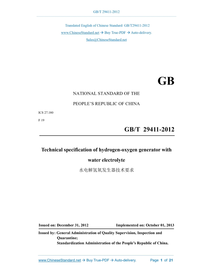 GB/T 29411-2012: Technical specification of hydrogen-oxygen generator with water electrolyte Delivery: 9 seconds. True-PDF full-copy in English & invoice will be downloaded + auto-delivered via email. See step-by-step procedure Status: Valid