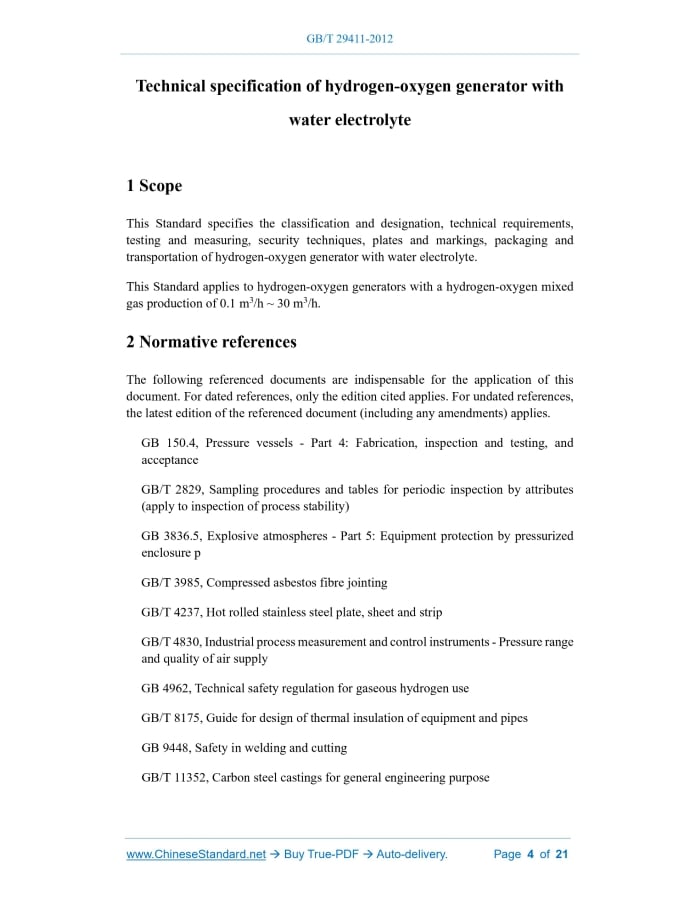 Similar standardsGB/T 29411-2012: Technical specification of hydrogen-oxygen generator with water electrolyte---This is an excerpt. Full copy of true-PDF in English version (including equations, symbols, images, flow-chart, tables, and figures etc.), auto-downloaded/delivered in 9 seconds, can be purchased online: https://www.ChineseStandard.net/PDF.aspx/GBT29411-2012GB NATIONAL STANDARD OF THE PEOPLE’S REPUBLIC OF CHINA ICS 27.180 F 19 Technical specification of hydrogen-oxygen generator with water electrolyte ISSUED ON: DECEMBER 31, 2012 IMPLEMENTED ON: OCTOBER 01, 2013 Issued by: General Administration of Quality Supervision, Inspection and Quarantine; Standardization Administration of the People’s Republic of China. Table of ContentsForeword ... 3 1 Scope ... 4 2 Normative references ... 4 3 Terms and definitions ... 5 4 Classification and designation ... 6 5 Technical requirements ... 6 6 Testing and measuring ... 13 7 Security techniques ... 16 8 Plates and markings ... 17 9 Packaging and transportation ... 18 Appendix A (Normative) Measurement of gas production by volumetric method ... 20 Technical specification of hydrogen-oxygen generator with water electrolyte1 ScopeThis Standard specifies the classification and designation, technical requirements, testing and measuring, security techniques, plates and markings, packaging and transportation of hydrogen-oxygen generator with water electrolyte. This Standard applies to hydrogen-oxygen generators with a hydrogen-oxygen mixed gas production of 0.1 m3/h ~ 30 m3/h.2 Normative referencesThe following referenced documents are indispensable for the application of this document. For dated references, only the edition cited applies. For undated references, the latest edition of the referenced document (including any amendments) applies. GB 150.4, Pressure vessels - Part 4: Fabrication, inspection and testing, and acceptance GB/T 2829, Sampling procedures and tables for periodic inspection by attributes (apply to inspection of process stability) GB 3836.5, Explosive atmospheres - Part 5: Equipment protection by pressurized enclosure p GB/T 3985, Compressed asbestos fibre jointing GB/T 4237, Hot rolled stainless steel plate, sheet and strip GB/T 4830, Industrial process measurement and control instruments - Pressure range and quality of air supply GB 4962, Technical safety regulation for gaseous hydrogen use GB/T 8175, Guide for design of thermal insulation of equipment and pipes GB 9448, Safety in welding and cutting GB/T 11352, Carbon steel castings for general engineering purpose GB/T 12332, Metallic coatings - Electroplated coatings of nickel for engineering purposes GB/T 13306, Plate GB 50058, Code for design of electrical installations in explosive atmospheres GB 50177, Design code for hydrogen station GB 50316, Design code for industrial metallic piping3 Terms and definitionsFor the purposes of this document, the following terms and definitions apply. 3.1 hydrogen-oxygen mixed gas A mixed gas of hydrogen and oxygen, with a ratio of 2:1, produced by a hydrogen- oxygen generator with water electrolyte. 3.2 hydrogen-oxygen generator A device for electrolyzing water to produce a hydrogen-oxygen mixed gas, consisting of a water electrolyzer, a power supply, a water and gas separation device, a flame arrester, etc. 3.3 water electrolyzer A device that generates hydrogen-oxygen mixed gas, consisting of electrodes, spacers, and tanks. The water electrolyzer is the main equipment of the hydrogen-oxygen generator, and its performance parameters will determine the technical performance of water electrolysis to produce hydrogen-oxygen mixed gas. 3.4 fire arrester A device used to prevent external flames from entering the equipment and pipes of the hydrogen-oxygen generator or to prevent the spread of flames between equipment and pipes. 5.3.1 The protective cover or enclosure shall be made of non-combustible materials; the minimum thickness shall be greater than 0.6 mm, and stainless-steel plates or carbon steel plates are generally used. For protective covers with larger areas, strengthening measures or double-layer structures shall be adopted according to strength or rigidity requirements. 5.3.2 When the protective cover or enclosure needs to be equipped with an insulating layer, it shall be designed according to GB/T 8175. The insulation material shall be non- combustible materials, and shall be provided with measures to prevent the materials from spreading and scattering. 5.3.3 The inner surface of the protective cover or enclosure shall be flat and free of accumulation space for hydrogen-oxygen mixed gas, and shall be provided with an exhaust port at the highest point on the top. If there are two or more places with the highest point on the top, an exhaust outlet shall be provided at each highest point. 5.3.4 In order to avoid the accumulation of hydrogen-oxygen mixed gas in the protective cover or enclosure, a ventilator should be installed on the top or upper side. When conditions permit, compressed air or nitrogen can be connected. Inspection openings and maintenance openings shall be provided in locations where the protective cover or enclosure is convenient for inspection and maintenance. Their number and size shall be determined according to the inspection and maintenance objects or functions. Inspection openings and maintenance openings shall be equipped with viewing windows or covers. 5.4 Water electrolyzer 5.4.1 The performance parameters and structure of the water electrolyzer shall be based on the basic requirements of reducing electric energy consumption per unit of gas production, reducing manufacturing costs, and extending service life. The structural type of the water electrolyzer, the structure, coating and material of the electrolysis cell and its electrodes and separators shall be reasonably selected. 5.4.2 The ratio of hydrogen and oxygen mixed gas produced by the water electrolyzer shall be 2:1, and the production cap
