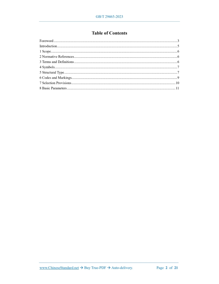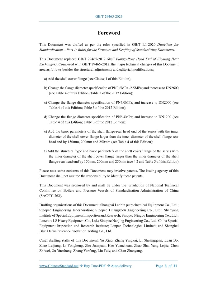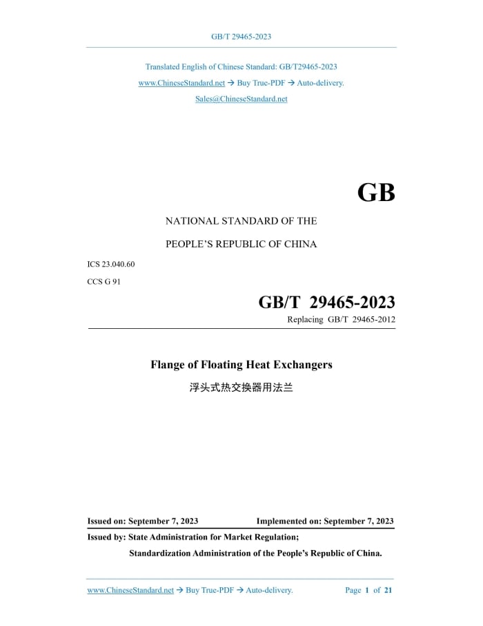 Similar standardsGB/T 29465-2023: Flange of floating heat exchangers---This is an excerpt. Full copy of true-PDF in English version (including equations, symbols, images, flow-chart, tables, and figures etc.), auto-downloaded/delivered in 9 seconds, can be purchased online: https://www.ChineseStandard.net/PDF.aspx/GBT29465-2023GB NATIONAL STANDARD OF THE PEOPLE’S REPUBLIC OF CHINA ICS 23.040.60 CCS G 91 Replacing GB/T 29465-2012 Flange of Floating Heat Exchangers ISSUED ON: SEPTEMBER 7, 2023 IMPLEMENTED ON: SEPTEMBER 7, 2023 Issued by: State Administration for Market Regulation; Standardization Administration of the People’s Republic of China. Table of ContentsForeword ... 3 Introduction ... 5 1 Scope ... 6 2 Normative References ... 6 3 Terms and Definitions ... 6 4 Symbols... 7 5 Structural Type ... 7 6 Codes and Markings... 9 7 Selection Provisions ... 10 8 Basic Parameters ... 11ForewordThis Document was drafted as per the rules specified in GB/T 1.1-2020 Directives for Standardization – Part 1: Rules for the Structure and Drafting of Standardizing Documents. This Document replaced GB/T 29465-2012 Shell Flange-Rear Head End of Floating Heat Exchangers. Compared with GB/T 29465-2012, the major technical changes of this Document area as follows besides the structural adjustments and editorial modifications: a) Add the shell cover flange (see Clause 1 of this Edition); b) Change the flange diameter specification of PN0.6MPa~2.5MPa; and increase to DN2600 (see Table 4 of this Edition; Table 3 of the 2012 Edition); c) Change the flange diameter specification of PN4.0MPa; and increase to DN2000 (see Table 4 of this Edition; Table 3 of the 2012 Edition); d) Change the flange diameter specification of PN6.4MPa; and increase to DN1200 (see Table 4 of this Edition; Table 3 of the 2012 Edition); e) Add the basic parameters of the shell flange-rear head end of the series with the inner diameter of the shell cover flange larger than the inner diameter of the shell flange-rear head end by 150mm, 200mm and 250mm (see Table 4 of this Edition); f) Add the structural type and basic parameters of the shell cover flange of the series with the inner diameter of the shell cover flange larger than the inner diameter of the shell flange-rear head end by 150mm, 200mm and 250mm (see 4.2 and Table 5 of this Edition). Please note some contents of this Document may involve patents. The issuing agency of this Document shall not assume the responsibility to identify these patents. This Document was proposed by and shall be under the jurisdiction of National Technical Committee on Boilers and Pressure Vessels of Standardization Administration of China (SAC/TC 262). Drafting organizations of this Document: Shanghai Lanbin petrochemical Equipment Co., Ltd.; Sinopec Engineering Incorporation; Sinopec Guangzhou Engineering Co., Ltd.; Shenyang Institute of Special Equipment Inspection and Research; Sinopec Ningbo Engineering Co., Ltd.; Lanzhou LS Heavy Equipment Co., Ltd.; Sinopec Nanjing Engineering Co., Ltd.; China Special Equipment Inspection and Research Institute; Lanpec Technologies Limited; and Shanghai Blue Ocean Science-Innovation Testing Co., Ltd. Chief drafting staffs of this Document: Yu Xiao, Zhang Yingkai, Li Shuangquan, Luan Bo, Zhao Leijiang, Li Yonghong, Zhu Juanjuan, Hao Yuanchuan, Zhao Sha, Yang Leijie, Chen Zhiwei, Gu Yuezhang, Zhang Yanfeng, Liu Fulv, and Chen Zhanyang.IntroductionGB/T 29465 Flanges of Floating Heat Exchangers aims to standardize the types and basic parameters of flange of floating heat exchanger for the energy industry; fully considering the development trend of large-scale devices; taking into account the flange standards and construction levels of heat exchangers in China; and clarifying the applicable scope of parameters and their supporting dimensions. This Document is of great significance to the realization of standardization, serialization, generalization and scale of flange of floating heat exchangers in China. For the standardization of flange types and basic parameters of large-volume and wide-ranging flange of floating heat exchangers, it can firstly promote product manufacturing standardization and improve design quality and efficiency; secondly, it can save tools, tooling, material consumption and backlog in manufacturing and use; finally, it is convenient for users to select, replace, repair and interchange products. In recent years, the construction of large-scale refining and chemical integration projects in China has entered a period of rapid development. The use of floating- heat exchangers, which are typical energy-consuming equipment of the installation, has increased significantly. The large-scale installation has pushed the structural size of the heat exchanger to a new height, and the large-scale demand for single equipment has become increasingly prominent. The construction and implementation of a large number of engineering projects have accumulated rich experience in the design, manufacturing and engineering application of flanges of floating heat exchangers. At the same time, GB/T151 Heat Exchanger has also been revised accordingly, forming for the first time a comprehensive product standard that comprehensively covers the typical structure of heat exchangers; and the applicable parameters have been significantly adjusted. For this reason, the flange of the floating heat exchanger needs to be revised to adapt to the development needs of the industry and standards. This Document focuses on the large-scale development needs of flange of floating heat exchangers. Through research and analysis of product design, production, use and standardization, the types and basic parameters of flange of floating heat exchangers are greatly expanded. It promotes the efficient selection, construction, maintenance and exchange of such products; and has positive significance for implementing China's "energy saving and emission reduction" strategy and promoting "green d