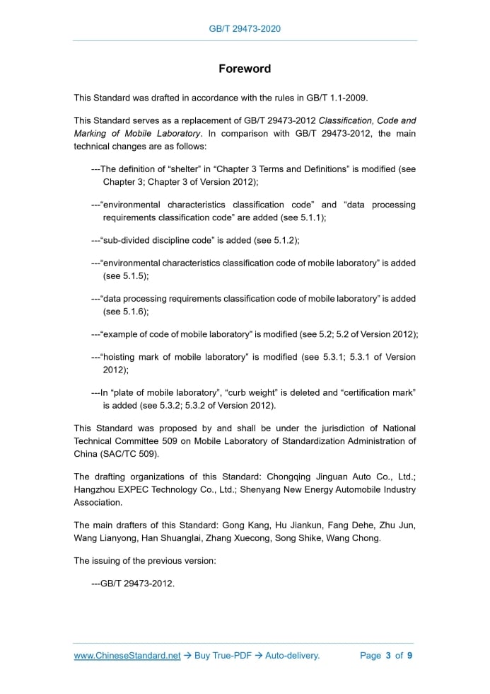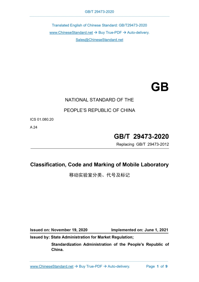 Similar standardsGB/T 29473-2020: Classification, code and marking of mobile laboratory---This is an excerpt. Full copy of true-PDF in English version (including equations, symbols, images, flow-chart, tables, and figures etc.), auto-downloaded/delivered in 9 seconds, can be purchased online: https://www.ChineseStandard.net/PDF.aspx/GBT29473-2020GB NATIONAL STANDARD OF THE PEOPLE’S REPUBLIC OF CHINA ICS 01.080.20 A 24 Replacing GB/T 29473-2012 Classification, Code and Marking of Mobile Laboratory Issued on. NOVEMBER 19, 2020 Implemented on. JUNE 1, 2021 Issued by. State Administration for Market Regulation; Standardization Administration of the People’s Republic of China. Table of ContentsForeword... 3 1 Scope... 4 2 Normative References... 4 3 Terms and Definitions... 4 4 Classification and Naming of Mobile Laboratory... 5 5 Code and Marking of Mobile Laboratory... 5ForewordThis Standard was drafted in accordance with the rules in GB/T 1.1-2009. This Standard serves as a replacement of GB/T 29473-2012 Classification, Code and Marking of Mobile Laboratory. In comparison with GB/T 29473-2012, the main technical changes are as follows. ---The definition of “shelter” in “Chapter 3 Terms and Definitions” is modified (see Chapter 3; Chapter 3 of Version 2012); ---“environmental characteristics classification code” and “data processing requirements classification code” are added (see 5.1.1); ---“sub-divided discipline code” is added (see 5.1.2); ---“environmental characteristics classification code of mobile laboratory” is added (see 5.1.5); ---“data processing requirements classification code of mobile laboratory” is added (see 5.1.6); ---“example of code of mobile laboratory” is modified (see 5.2; 5.2 of Version 2012); ---“hoisting mark of mobile laboratory” is modified (see 5.3.1; 5.3.1 of Version 2012); ---In “plate of mobile laboratory”, “curb weight” is deleted and “certification mark” is added (see 5.3.2; 5.3.2 of Version 2012). This Standard was proposed by and shall be under the jurisdiction of National Technical Committee 509 on Mobile Laboratory of Standardization Administration of China (SAC/TC 509). The drafting organizations of this Standard. Chongqing Jinguan Auto Co., Ltd.; Hangzhou EXPEC Technology Co., Ltd.; Shenyang New Energy Automobile Industry Association. The main drafters of this Standard. Gong Kang, Hu Jiankun, Fang Dehe, Zhu Jun, Wang Lianyong, Han Shuanglai, Zhang Xuecong, Song Shike, Wang Chong. The issuing of the previous version. ---GB/T 29473-2012. Classification, Code and Marking of Mobile Laboratory1 ScopeThis Standard specifies the terms and definitions, classification and naming, code and marking of mobile laboratory. This Standard is applicable to mobile laboratories used on land.2 Normative ReferencesThe following documents are indispensable to the application of this document. In terms of references with a specified date, only versions with a specified date are applicable to this document. In terms of references without a specified date, the latest version (including all the modifications) is applicable to this document. GB/T 191 Packaging - Pictorial Markings for Handling of Goods GB/T 13306 Plate GB/T 29479-2012 General Requirements of Mobile Laboratory3 Terms and DefinitionsWhat is defined in GB/T 29479-2012 and the following terms and definitions are applicable to this document. 3.1 Self-propelled Self-propelled refers to a mode of moving along tracked or trackless channels with its own power and by replying on its own operating mechanism. 3.2 Trailer Trailer refers to a mode of relying on other power for traction and movement, and with a travelling mechanism, but no power system.4 Classification and Naming of Mobile Laboratory4.1 Classification of Mobile Laboratory In accordance with their functions, the mobile laboratories are classified into four types. physical mobile laboratories, chemical mobile laboratories, biological mobile laboratories and comprehensive mobile laboratories.5 Code and Marking of Mobile Laboratory5.1 Code of Mobile Laboratory 5.1.1 Overview The code of the mobile laboratories is composed of seven parts. the first letters (YS) of the Chinese pinyin “yi” and “shi” of mobile laboratory, the function category code, model, delivery mode code, environmental characteristics code, data processing requirements code and product sequence number (the product sequence number ranges from 0000 to 9999) of mobile laboratory. The arrangement sequence is shown in Figure 1. 5.1.3 Model of mobile laboratory In accordance with the actual usable area inside the mobile laboratory, the model of the mobile laboratories is divided into four types. small, medium, large and special. See the code in Table 3. 5.2 Example of Code of Mobile Laboratory See an example of the code of the mobile laboratories in Table 6. 5.3 Marking and Plate of Mobile Laboratory 5.3.1 Hoisting mark of mobile laboratory During transportation, the mobile laboratory products shall get on and off the vehicle (ship) by themselves or through the mode of dragging. ......Source: Above contents are excerpted from the full-copy PDF -- translated/reviewed by: www.ChineseStandard.net / Wayne Zheng et al. Tips & Frequently Asked Questions:Question 1: How long will the true-PDF of English version of GB/T 29473-2020 be delivered?Answer: The full copy PDF of English version of GB/T 29473-2020 can be downloaded in 9 seconds, and it will also be emailed to you in 9 seconds (double mechanisms to ensure the delivery reliably), with PDF-invoice.Question 2: Can I share the purchased PDF of GB/T 29473-2020_English with my colleagues?Answer: Yes. The purchased PDF of GB/T 29473-2020_English will be deemed to be sold to your employer/organization who actually paid for it, including your colleagues and your employer's intranet.Question 3: Does the price include tax/VAT?Answer: Yes. Our tax invoice, downloaded/delivered in 9 seconds, includes all 