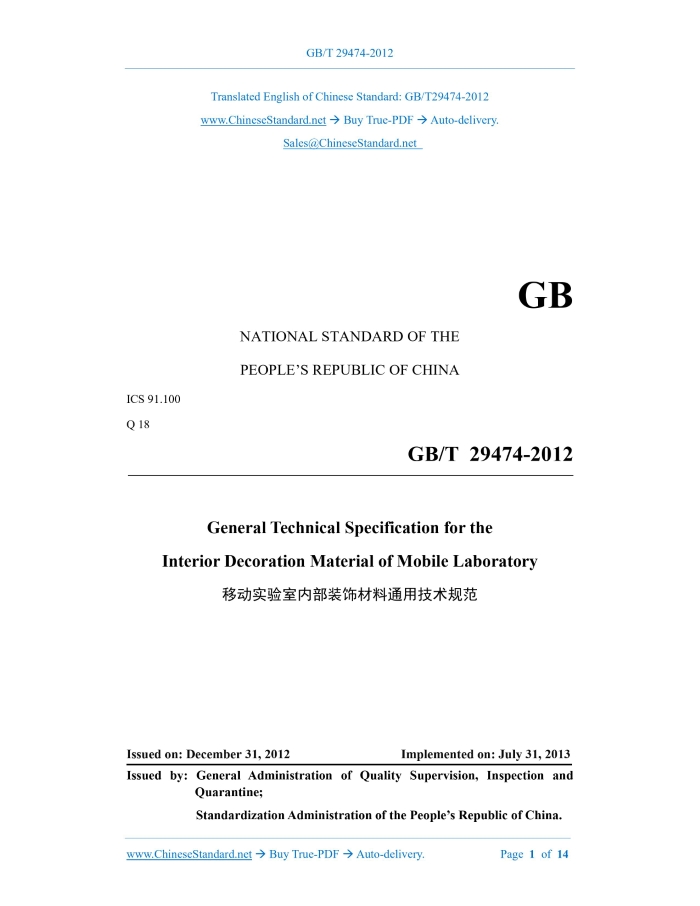 GB/T 29474-2012: General technical specification for the interior decoration material of mobile laboratory Delivery: 9 seconds. True-PDF full-copy in English & invoice will be downloaded + auto-delivered via email. See step-by-step procedure Status: Valid