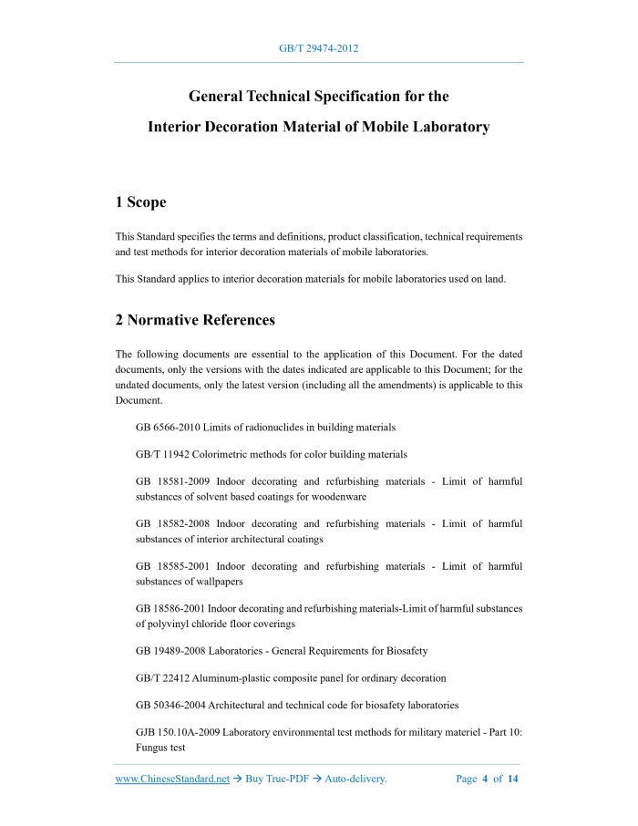 Similar standardsGB/T 29474-2012: General technical specification for the interior decoration material of mobile laboratory---This is an excerpt. Full copy of true-PDF in English version (including equations, symbols, images, flow-chart, tables, and figures etc.), auto-downloaded/delivered in 9 seconds, can be purchased online: https://www.ChineseStandard.net/PDF.aspx/GBT29474-2012 GB NATIONAL STANDARD OF THE PEOPLE’S REPUBLIC OF CHINA ICS 91.100 Q 18 General Technical Specification for the Interior Decoration Material of Mobile Laboratory ISSUED ON: DECEMBER 31, 2012 IMPLEMENTED ON: JULY 31, 2013 Issued by: General Administration of Quality Supervision, Inspection and Quarantine; Standardization Administration of the People’s Republic of China. Table of ContentsForeword ... 3 1 Scope ... 4 2 Normative References ... 4 3 Terms and Definitions ... 5 4 Product Classification ... 5 5 Technical Requirements ... 6 6 Test Methods ... 11 General Technical Specification for the Interior Decoration Material of Mobile Laboratory1 ScopeThis Standard specifies the terms and definitions, product classification, technical requirements and test methods for interior decoration materials of mobile laboratories. This Standard applies to interior decoration materials for mobile laboratories used on land.2 Normative ReferencesThe following documents are essential to the application of this Document. For the dated documents, only the versions with the dates indicated are applicable to this Document; for the undated documents, only the latest version (including all the amendments) is applicable to this Document. GB 6566-2010 Limits of radionuclides in building materials GB/T 11942 Colorimetric methods for color building materials GB 18581-2009 Indoor decorating and refurbishing materials - Limit of harmful substances of solvent based coatings for woodenware GB 18582-2008 Indoor decorating and refurbishing materials - Limit of harmful substances of interior architectural coatings GB 18585-2001 Indoor decorating and refurbishing materials - Limit of harmful substances of wallpapers GB 18586-2001 Indoor decorating and refurbishing materials-Limit of harmful substances of polyvinyl chloride floor coverings GB 19489-2008 Laboratories - General Requirements for Biosafety GB/T 22412 Aluminum-plastic composite panel for ordinary decoration GB 50346-2004 Architectural and technical code for biosafety laboratories GJB 150.10A-2009 Laboratory environmental test methods for military materiel - Part 10: Fungus test GJB 150.11A-2009 Laboratory environmental test methods for military materiel - Part 11: Salt fog test SJ/T 11294 General specification of floor coating for electrostatic protection3 Terms and DefinitionsFor the purposes of this Document, the following terms and definitions apply. 3.1 Interior decoration material Decorative materials that are used for interior decoration of shed panels, wall panels, and floors in mobile laboratories. 3.2 Wave The wavy texture or concavity on the decorative surface. 3.3 Spot Local defects in coating of decorative surface. 3.4 Bubble The local bulges on the decorative surfaces and floors made of non-metallic materials. 3.5 Scratch Line-like marks that are caused by scratches on the surface of a material by some sharp object. 3.6 Crease The material cannot return to its original flat state after excessive bending, leaving color marks.4 Product Classification4.1 Classification by type of mobile laboratory According to different types of mobile laboratories, they are divided into four categories: decoration materials for physical mobile laboratories, decoration materials for chemical mobile laboratories, decoration materials for biological mobile laboratories and decoration materials for comprehensive mobile laboratories. 4.2 Classification by decorative parts 4.2.1 Shed panel The shed panel refers to the ceiling area inside the laboratory, which provides top protection space and environmental space for the staff, experimental equipment, and test objects in the internal working area. Its decoration can be completed at the same time as the top wall of the mobile laboratory cabin, or it can be decorated separately. 4.2.2 Side wall panel The side wall panel refers to the wall part inside the laboratory, which provides side protection space, isolation space, environmental space and equipment fixed support for the staff, experimental equipment, and test objects in the internal working area. Its decoration can be completed at the same time as the side wall of the mobile laboratory cabin, or it can be decorated separately. 4.2.3 Floor The floor refers to the ground area inside the laboratory, which provides bottom load-bearing space, equipment fixation space, and personnel activity space for the staff, experimental equipment, and test objects in the internal working area. 4.3 Classification by material properties 4.3.1 Metal materials Various types of metal or metal alloy sheets and profiles that meet the performance requirements of laboratory interior decoration materials. 4.3.2 Non-metallic materials Various types of polymer sheets, Boeing films, wallpapers, liquid materials and other materials that meet the performance requirements of laboratory interior decoration materials. 4.3.3 Composite materials Various metal and non-metal hybrid plates and profiles with laboratory interior decoration material properties.5 Technical Requirements5.1 Specifications 5.1.1 metal composite materials sheets and profiles shall meet the following requirements: a) Material dimensions comply with technical drawings; b) Sheet with adhesive layer on the back, the thickness of the adhesive layer is 0.055mm ± 0.01mm; Material hazardous substance limits: a) Painted materials: volatile organic compounds (VOCs) content ≤ 200g/L, free formaldehyde content ≤ 0.1g/kg; b) Wallpaper, Boeing film materials: free formaldehyde release ≤0.12mg/m3; c) Floor leather: it shall comply with the provisions of GB 18581-
