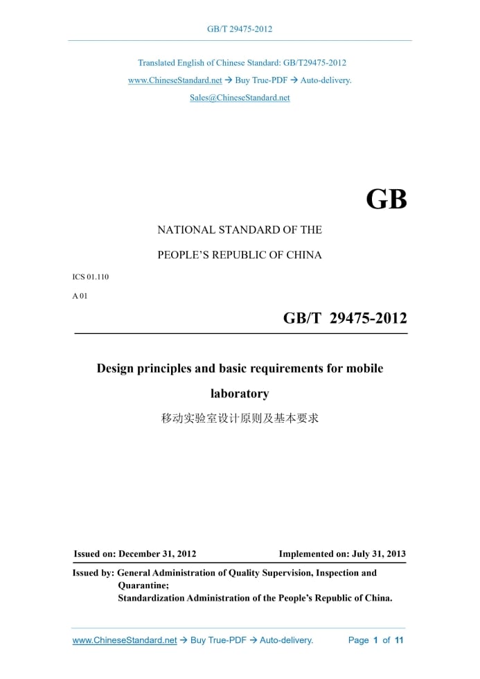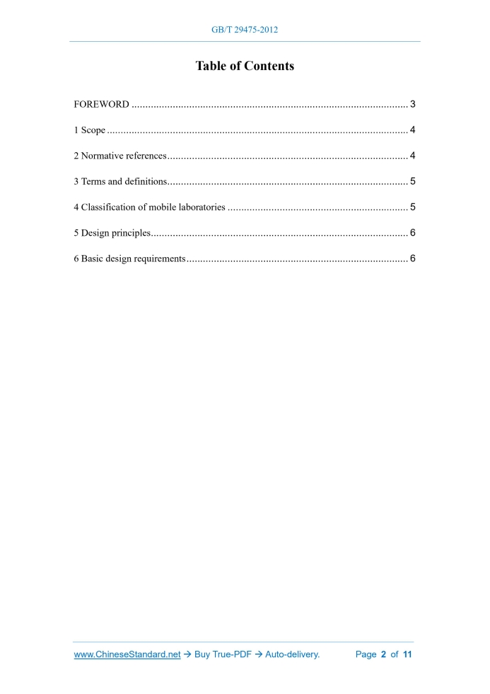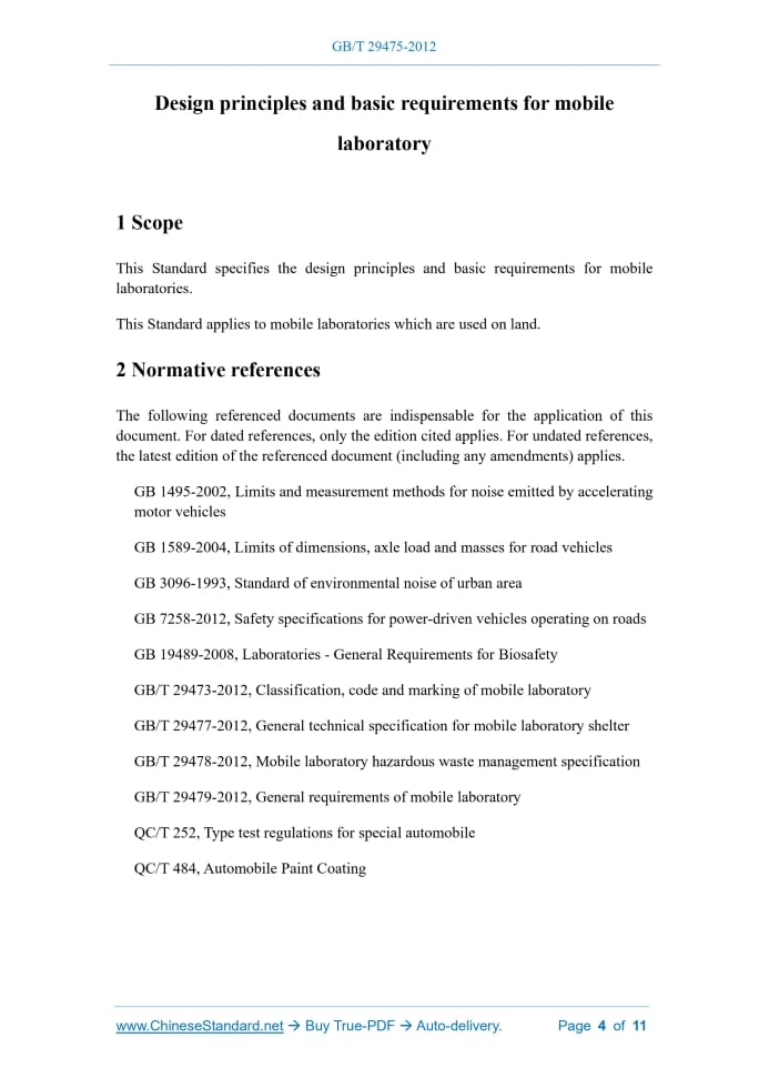 Similar standardsGB/T 29475-2012: Design principles and basic requirements for mobile laboratory---This is an excerpt. Full copy of true-PDF in English version (including equations, symbols, images, flow-chart, tables, and figures etc.), auto-downloaded/delivered in 9 seconds, can be purchased online: https://www.ChineseStandard.net/PDF.aspx/GBT29475-2012NATIONAL STANDARD OF THE PEOPLE’S REPUBLIC OF CHINA ICS 01.110 A 01 Design principles and basic requirements for mobile laboratory Issued on. DECEMBER 31, 2012 Implemented on. JULY 31, 2013 Issued by. General Administration of Quality Supervision, Inspection and Quarantine; Standardization Administration of the People’s Republic of China. Table of ContentsFOREWORD... 3 1 Scope... 4 2 Normative references... 4 3 Terms and definitions... 5 4 Classification of mobile laboratories... 5 5 Design principles... 6 6 Basic design requirements... 6FOREWORDThis Standard was drafted in accordance with the rules given in GB/T 1.1-2009. This Standard shall be under the jurisdiction of National Technical Committee on Mobile Laboratory of Standardization Administration of China (SAC/TC 509). The drafting organizations of this Standard. Centechsv Special Vehicle Co., Ltd., Shenyang Product Quality Supervision and Inspection Institute, Luping Tieling Special Purpose Vehicle Co., Ltd., Hanyang SPV Research Institute. The drafters of this Standard. Duan Liancheng, Wang Guohai, Dong Weimin, Li Mei, Li Nan, Wang Dongyan, Xu Xiangguang, Guo Jiang, Tang Ke, Duan Jihong. Design principles and basic requirements for mobile laboratory1 ScopeThis Standard specifies the design principles and basic requirements for mobile laboratories. This Standard applies to mobile laboratories which are used on land.2 Normative referencesThe following referenced documents are indispensable for the application of this document. For dated references, only the edition cited applies. For undated references, the latest edition of the referenced document (including any amendments) applies. GB 1495-2002, Limits and measurement methods for noise emitted by accelerating motor vehicles GB 1589-2004, Limits of dimensions, axle load and masses for road vehicles GB 3096-1993, Standard of environmental noise of urban area GB 7258-2012, Safety specifications for power-driven vehicles operating on roads GB 19489-2008, Laboratories - General Requirements for Biosafety GB/T 29473-2012, Classification, code and marking of mobile laboratory GB/T 29477-2012, General technical specification for mobile laboratory shelter GB/T 29478-2012, Mobile laboratory hazardous waste management specification GB/T 29479-2012, General requirements of mobile laboratory QC/T 252, Type test regulations for special automobile QC/T 484, Automobile Paint Coating3 Terms and definitionsTerms and definitions determined by GB/T 29479-2012, GB/T 29473-2012 and the following ones are applicable to this document. For ease of use, some of the terms and definitions in GB/T 29473-2012 are repeated below. 3.1 Self-propelled A self-powered method that relies on its own operating mechanism to move. [GB/T 29473-2012, definition 3.1] 3.2 Trailer The method of non-powered system with walking mechanism to rely on other power traction to move. [GB/T 29473-2012, definition 3.2]4 Classification of mobile laboratories4.1 By movement, divided into. 4.2 By discipline, divided into.5 Design principles5.1 Safety When designing the mobile laboratory, the unsafe factors in the process of use, movement and storage shall be fully identified and effectively controlled. 5.2 Environmental protection When designing the mobile laboratory, the environmental protection requirements in the process of production and use shall be fully considered. 5.4 Maintainability The design scheme of the mobile laboratory and the parts, assemblies and equipment of the mobile laboratory shall be maintainable, and the wearing parts shall be easy to maintain and replace. 5.5 Modularity Modular design shall be adopted in the mobile laboratory, to maximize laboratory functions, minimize space and minimize production costs.6 Basic design requirements6.1 Environmental adaptability 6.1.1 Fully identify the climatic environmental conditions (such as temperature, humidity, air pressure, wind speed) in the area where the mobile laboratory is used, so as to ensure the normal operation of the mobile laboratory. 6.2 Mobile compliance 6.2.1 The self-propelled mobile laboratory shall meet the requirements of relevant standards such as GB 7258-2012 and GB 1589-2004. 6.2.4 The carrier of the mobile laboratory shall be complete vehicle, class-2 chassis, semi-trailer and trailer which are listed in the National Automobile Product Bulletin. 6.3 Laboratory shelter 6.3.1 The design of the laboratory shelter shall conform to ergonomics. 6.3.2 The floor and side walls of the laboratory shelter shall be provided with pretreatment measures for the installation of instruments and facilities. 6.3.6 The tightness of the laboratory shelter shall meet the requirements of 5.5 in GB/T 29477-2012. 6.3.7 The carrying capacity of the laboratory shelter shall meet the requirements of 5.7.5, 5.7.6 and 5.7.7 in GB/T 29477-2012. 6.3.8 The laboratory shelter shall be installed with a door lock as required, which shall be easy to open quickly inside. 6.3.9 The laboratory shelter shall be provided with escape facilities. 6.3.10 The laboratory shelter can be designed with positive and negative pressure cabins according to the requirements of use. 6.3.15 The facilities in the laboratory shelter, and the on and off of doors and drawers of the laboratory cabinet shall have a locking function. 6.4 Facilities 6.4.1 The mobile laboratory shall use vehicle-mounted laboratory apparatus which shall be installed and fixed reliably, and shall be provided with a shock absorption device of corresponding level if necessary. 6.4.2 When necessary, the laboratory apparatus and equipment shall be selected to have the characteristics