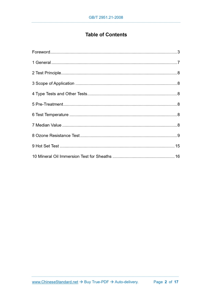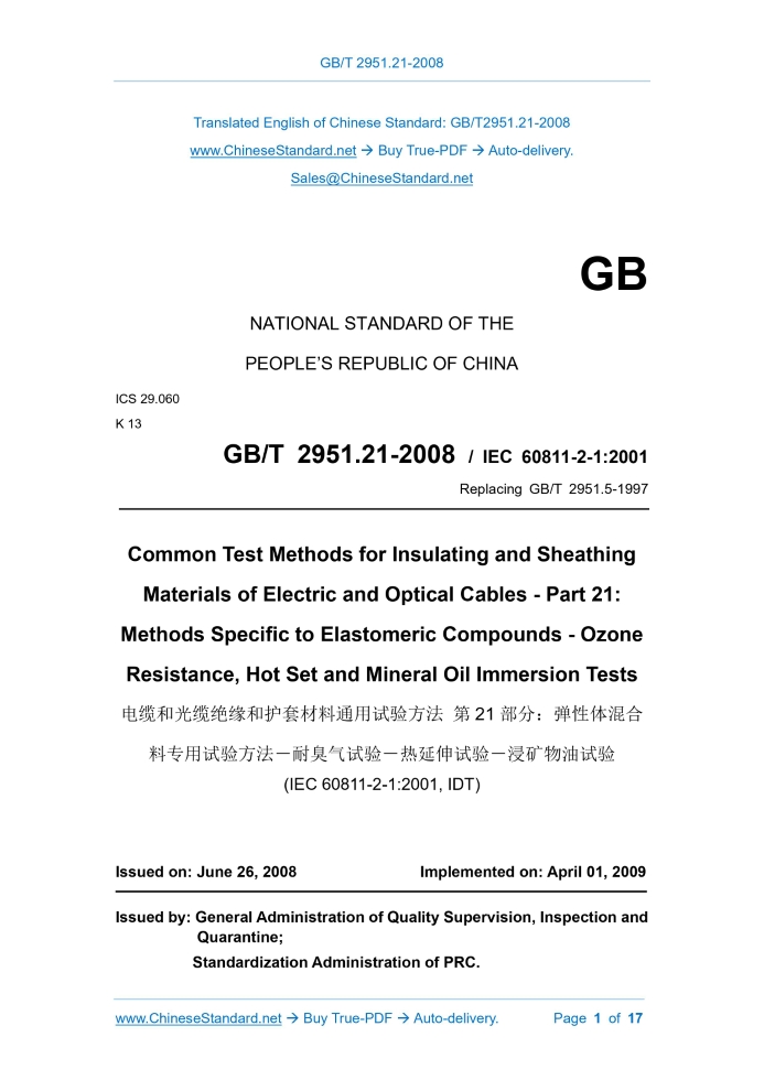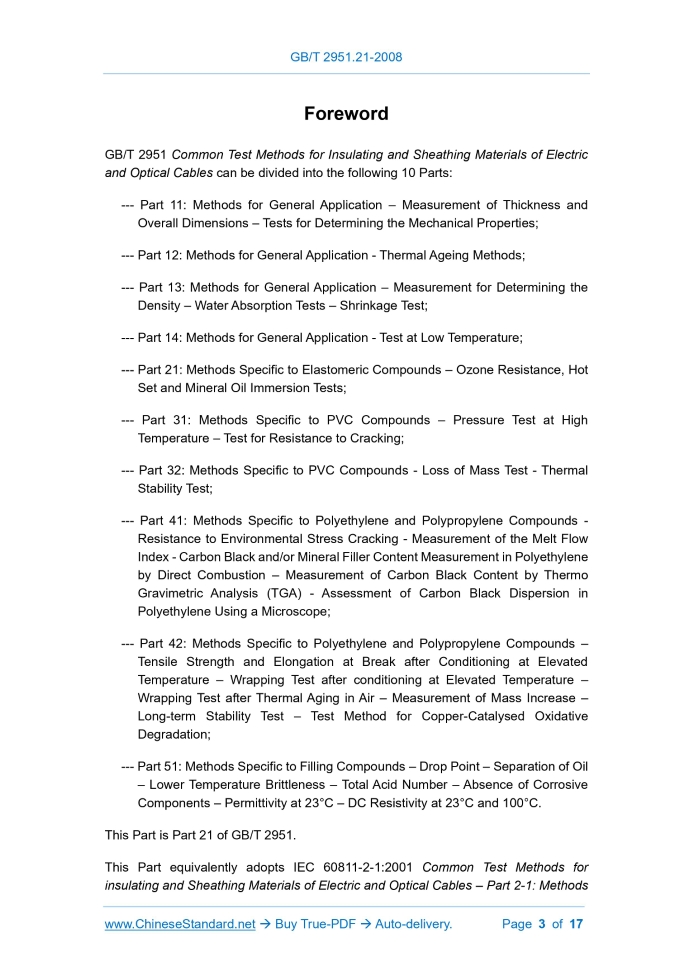 Similar standardsGB/T 2951.21-2008: Common test methods for insulating and sheathing materials of electric and optical cables -- Part 21: Methods specific to elastomeric compounds -- Ozone resistance, hot set and mineral oil immersion tests---This is an excerpt. Full copy of true-PDF in English version (including equations, symbols, images, flow-chart, tables, and figures etc.), auto-downloaded/delivered in 9 seconds, can be purchased online: https://www.ChineseStandard.net/PDF.aspx/GBT2951.21-2008 GB NATIONAL STANDARD OF THE PEOPLE’S REPUBLIC OF CHINA ICS 29.060 K 13 GB/T 2951.21-2008 / IEC 60811-2-1.2001 Replacing GB/T 2951.5-1997 Common Test Methods for Insulating and Sheathing Materials of Electric and Optical Cables - Part 21. Methods Specific to Elastomeric Compounds - Ozone Resistance, Hot Set and Mineral Oil Immersion Tests (IEC 60811-2-1.2001, IDT) Issued on: JUNE 26, 2008 Implemented on: APRIL 01, 2009 Issued by. General Administration of Quality Supervision, Inspection and Quarantine; Standardization Administration of PRC. Table of ContentsForeword... 3 1 General... 7 2 Test Principle... 8 3 Scope of Application... 8 4 Type Tests and Other Tests... 8 5 Pre-Treatment... 8 6 Test Temperature... 8 7 Median Value... 8 8 Ozone Resistance Test... 9 9 Hot Set Test... 15 10 Mineral Oil Immersion Test for Sheaths... 16ForewordGB/T 2951 Common Test Methods for Insulating and Sheathing Materials of Electric and Optical Cables can be divided into the following 10 Parts. --- Part 11.Methods for General Application – Measurement of Thickness and Overall Dimensions – Tests for Determining the Mechanical Properties; --- Part 12.Methods for General Application - Thermal Ageing Methods; --- Part 13.Methods for General Application – Measurement for Determining the Density – Water Absorption Tests – Shrinkage Test; --- Part 14.Methods for General Application - Test at Low Temperature; --- Part 21.Methods Specific to Elastomeric Compounds – Ozone Resistance, Hot Set and Mineral Oil Immersion Tests; --- Part 31.Methods Specific to PVC Compounds – Pressure Test at High Temperature – Test for Resistance to Cracking; --- Part 32.Methods Specific to PVC Compounds - Loss of Mass Test - Thermal Stability Test; --- Part 41.Methods Specific to Polyethylene and Polypropylene Compounds - Resistance to Environmental Stress Cracking - Measurement of the Melt Flow Index - Carbon Black and/or Mineral Filler Content Measurement in Polyethylene by Direct Combustion – Measurement of Carbon Black Content by Thermo Gravimetric Analysis (TGA) - Assessment of Carbon Black Dispersion in Polyethylene Using a Microscope; --- Part 42.Methods Specific to Polyethylene and Polypropylene Compounds – Tensile Strength and Elongation at Break after Conditioning at Elevated Temperature – Wrapping Test after conditioning at Elevated Temperature – Wrapping Test after Thermal Aging in Air – Measurement of Mass Increase – Long-term Stability Test – Test Method for Copper-Catalysed Oxidative Degradation; --- Part 51.Methods Specific to Filling Compounds – Drop Point – Separation of Oil – Lower Temperature Brittleness – Total Acid Number – Absence of Corrosive Components – Permittivity at 23°C – DC Resistivity at 23°C and 100°C. This Part is Part 21 of GB/T 2951. This Part equivalently adopts IEC 60811-2-1.2001 Common Test Methods for insulating and Sheathing Materials of Electric and Optical Cables – Part 2-1.Methods Specific to Elastomeric Compounds – Ozone Resistance, Hot Set and Mineral Oil Immersion Tests (English Version). For the benefit of use, this Part made the following editorial modifications. --- Use “Part 21” to replace “Part 2-1”; --- Use the decimal point “.” to replace the comma “,” that is used as decimal point; --- Delete the Foreword of the international standard; --- Article 1.1 of this Part refers to Chinese standards that adopt international standards instead of international standards; --- This Part adds "optical cable" in the place where Clause 3 of the original text of IEC 60811-2-1 is not compatible with the addition of "and optical cable" in the standard name of IEC 60811-2-1. In view of the actual situation in China, compared with the original text of IEC 60811- 2-1, this Part also makes a technical supplement. add the NOTE “Universal axle oils complying with the provisions of SH/T 0139-1995 are allowed to be used in non- arbitration tests” under the 10.3 “Test oil” in Clause 10 "The sheathing immersion mineral oil test". This Part replaces GB/T 2951.5-1997 Common Test Methods for Insulating and Sheathing Materials of Electric Cables - Part 2.Methods Specific to Elastomeric Compounds - Section One. Ozone Resistance Test - Hot Set Test - Mineral Oil Immersion Test. Compared with GB/T 2951.5-1997, the main changes of this Part are as follows. --- Change the standard name into Common Test Methods for Insulating and Sheathing Materials of Electric and Optical Cables – Part 21.Methods Specific to Elastomeric Compounds – Ozone Resistance, Hot Set and Mineral Oil Immersion Tests. --- Change the English Name of the Standard correspondingly into Common Test Methods for Insulating and Sheathing Materials of Electric and Optical Cables – Part 21.Methods Specific to Elastomeric Compounds – Ozone Resistance, Hot Set and Mineral Oil Immersion Tests. --- Change the Clause 1 "Power Distribution Cables and Communication Cables, Including Ship Cables" into "Power Distribution, Communication Cables and Optical Cables, Including Ship and Offshore Cables and Optical Cables" (Clause 1 of 1997 Edition; Clause 1 of this Edition); --- Add “optical cables” to the Clause 3 “Scope of Application” (Clause 3 of 1997 Edition; Clause 3 of this Edition); --- Add “d), e), f)” to 8.1.1 (8.1.1 of 1997 Edition; 8.1.1 of this Edition); --- Change 8.1.2 into “8.1.2.1 Sampling of insulation” and “8.1.2.2 sampling of sheath” (8.1.2 of 1997 Editi