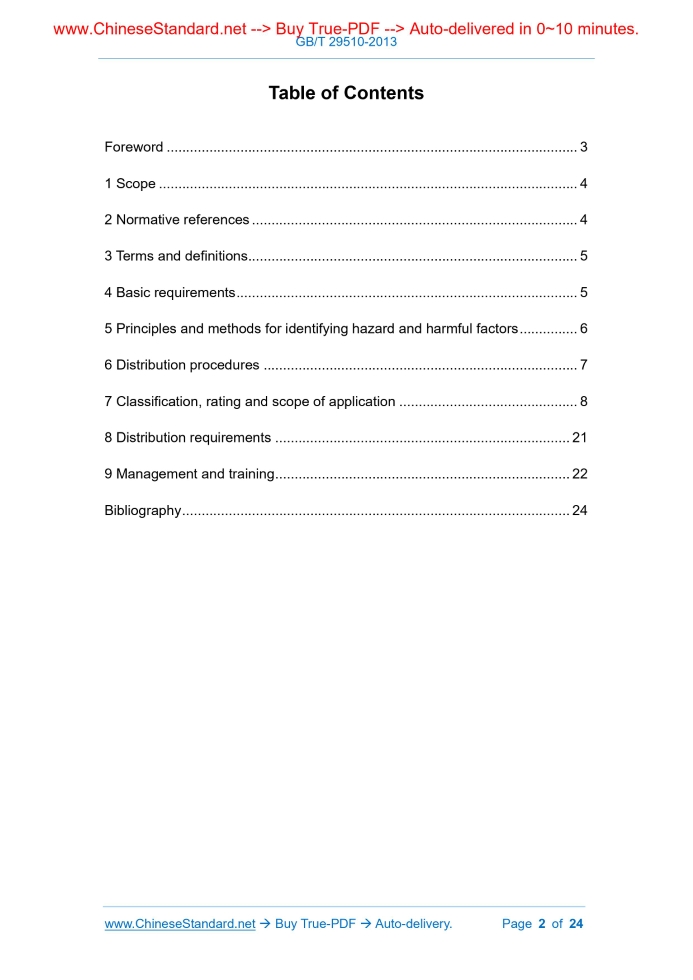 Similar standardsGB/T 29510-2013: General requirements for the distribution of personal protection equipment---This is an excerpt. Full copy of true-PDF in English version (including equations, symbols, images, flow-chart, tables, and figures etc.), auto-downloaded/delivered in 9 seconds, can be purchased online: https://www.ChineseStandard.net/PDF.aspx/GBT29510-2013NATIONAL STANDARD OF THE PEOPLE’S REPUBLIC OF CHINA ICS 13.340.01 C 73 General requirements for the distribution of personal protection equipment ISSUED ON: MAY 09, 2013 IMPLEMENTED ON: FEBRUARY 01, 2014 Issued by: General Administration of Quality Supervision, Inspection and Quarantine; Standardization Administration of the People's Republic of China. Table of ContentsForeword ... 3 1 Scope ... 4 2 Normative references ... 4 3 Terms and definitions ... 5 4 Basic requirements ... 5 5 Principles and methods for identifying hazard and harmful factors ... 6 6 Distribution procedures ... 7 7 Classification, rating and scope of application ... 8 8 Distribution requirements ... 21 9 Management and training ... 22 Bibliography ... 24 General requirements for the distribution of personal protection equipment1 ScopeThis Standard specifies basic requirements, identification principles and methods of dangerous and harmful factors, equipment procedures, classification, rating and scope of application, equipment requirements, management and training for distribution of personal protection equipment. This Standard is applicable to selection, distribution, use, maintenance and scrap management for personal protection equipment of production and business operation entity.2 Normative referencesThe following referenced documents are indispensable for the application of this document. For dated references, only the edition cited applies. For undated references, the latest edition of the referenced document (including any amendments) applies. GB 2890-2009, Respiratory protection - Non-powered air-purifying respirators GB/T 6441, The classification for casualty accidents of enterprise staff and workers GB/T 11651-2009, Code of practice for selection of personal protective equipment GB/T 12903, Personal protective equipment terminology GB/T 14366, Acoustics - Estimation of noise-induced hearing loss GB/T 18664-2002, Selection, use and maintenance of respiratory protective equipment GB/T 23466-2009, Guideline for selection of hearing protectors GB/T 23468-2009, Code of practice for safety use of fall protection equipment 4.5 When multiple protection equipment is required at the same time, the use compatibility and functional substitution shall be considered to avoid protection failure.5 Principles and methods for identifying hazard andharmful factors 5.1 Identification principle 5.1.1 Identify hazard and harmful factors based on scientific, systematic and comprehensive basic principles. 5.1.2 According to safety science theory, national laws, regulations, standards and professional knowledge, according to the characteristics of different workplaces, production processes and operating environments, identify possible hazard and harmful factors. 5.1.3 Systematically analyze hazard and harmful factors in all links of production and operation activities. Determine the location of the hazard and harmful factors, the hazards, the ways and consequences of the accident. 5.1.4 Identify in terms of personnel, equipment and facilities, environmental conditions, management systems. It shall not only analyze hazard and harmful factors existing in normal production operations, but also possible hazard and harmful factors in the case of changes in technology, materials, processes, equipment damage or failure, and personnel operation errors. 5.2 Identification method 5.2.1 The production and business operation entity shall, according to the accident categories specified in GB 6441, the hazard factors in the "Category of Occupational Disease Hazard Factors" published by the Ministry of Health and other occupational health regulations, identify hazard and harmful factors. 5.2.2 Professionals shall analyze the hazard and harmful factors in the working environment by means of on-site investigation, measurement, inspection of relevant records, safety checklists, inquiry and communication. Determine hazard and harmful factors, types of injuries, likelihood, extent and consequences of harm to humans. 5.2.3 When identifying hazard and harmful factors, it shall analyze mainly from the following aspects: - Normal working condition; Table 1 -- Classification, rating and scope of application of personal protection equipment Protection classification Name of protection equipment Features Rating Grade indicator Reference scope of application Head protection Ordinary hard hat Made of plastic, rubber, fiberglass and other materials. Resist damage from falling objects -- -- Places where there is a danger of falling objects or a possible collision with the head Flame retardant hard hat Add flame retardant function on the basis of ordinary hard hat to resist the injury caused by open flame burning -- -- Places where there is a danger of falling objects or a collision with the head, open flames or flammable substances Anti-static hard hat Eliminate the accumulation of charge on the hat body based on the ordinary hard hat -- -- Places where there is a danger of falling objects or a collision with the head and no discharge is allowed. Mostly used in precision instrument processing, petrochemical, coal mining and other industries Electrically insulated hard hat Prevent current from passing on the basis of the ordinary hard hat to prevent accidental electric shock -- -- Work places where there is a danger of falling objects or a collision with the head and live working, such as power and water conservancy industry Compression resistant hard hat It has lateral rigidity on the basis of ordinary hard hat to prevent the head from being crushed -- -- Work places where there is a danger of fa