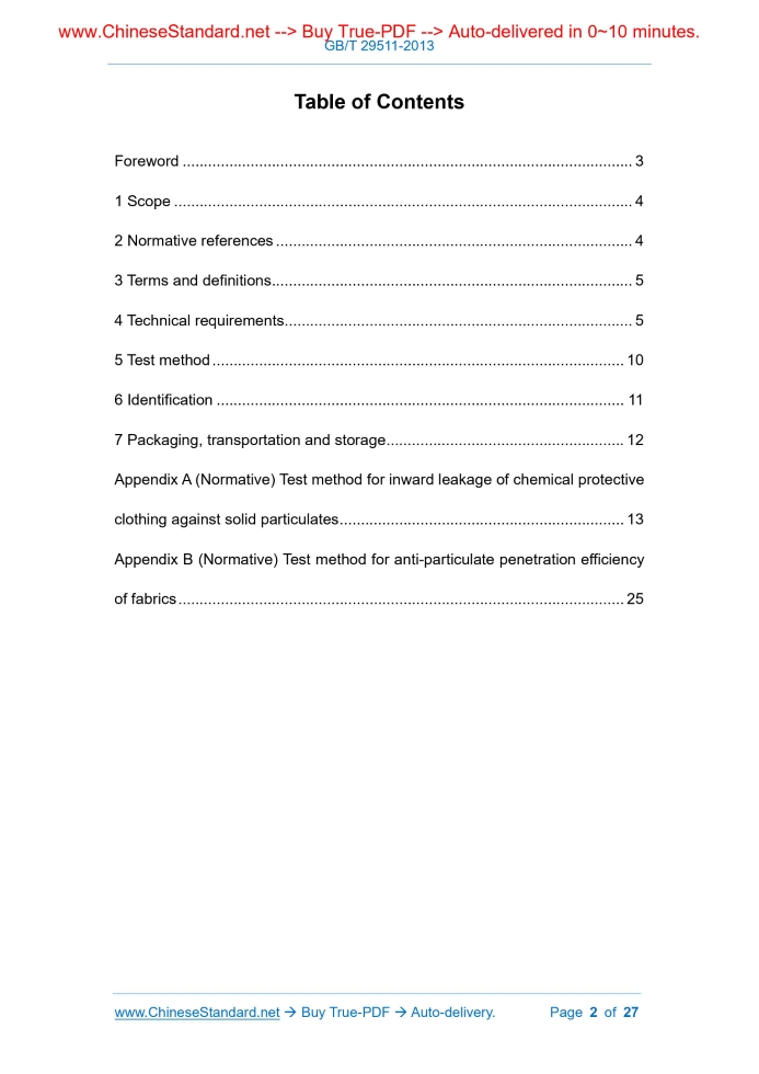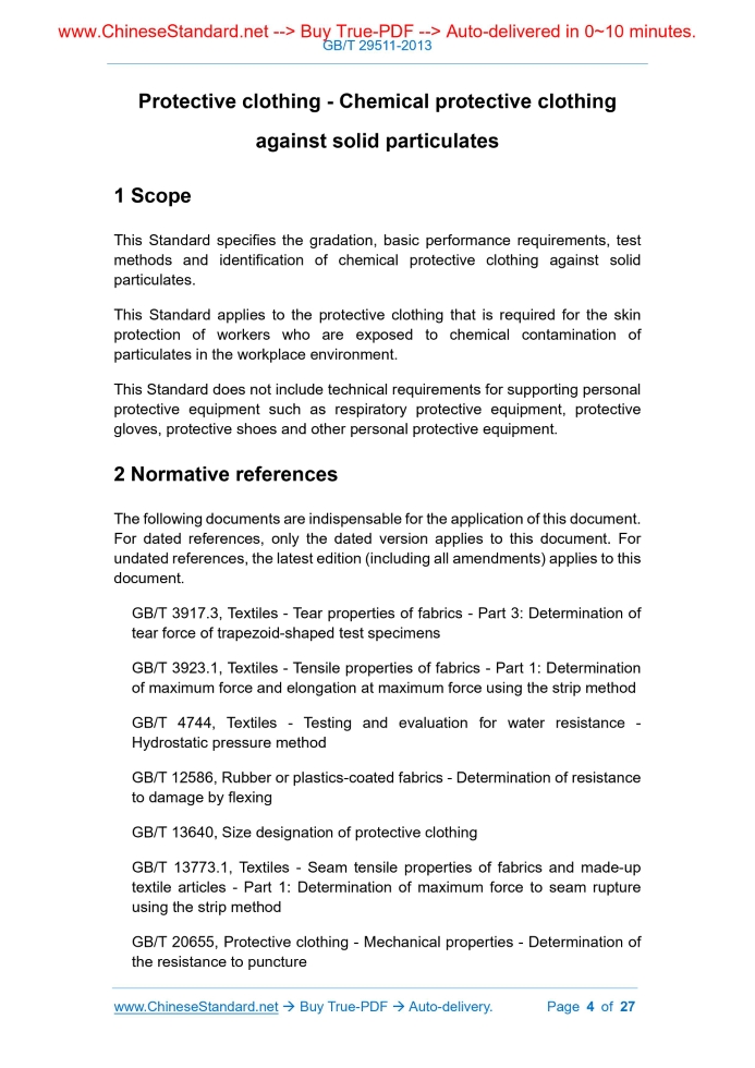 Similar standardsGB/T 29511-2013: Protective clothing -- Chemical protective clothing against solid particulates---This is an excerpt. Full copy of true-PDF in English version (including equations, symbols, images, flow-chart, tables, and figures etc.), auto-downloaded/delivered in 9 seconds, can be purchased online: https://www.ChineseStandard.net/PDF.aspx/GBT29511-2013NATIONAL STANDARD OF THE PEOPLE’S REPUBLIC OF CHINA ICS 12.340.10 C 73 Protective clothing - Chemical protective clothing against solid particulates ISSUED ON: MAY 09, 2013 IMPLEMENTED ON: FEBRUARY 01, 2014 Issued by: General Administration of Quality Supervision, Inspection and Quarantine; Standardization Administration of the People’s Republic of China. Table of ContentsForeword ... 3 1 Scope ... 4 2 Normative references ... 4 3 Terms and definitions ... 5 4 Technical requirements ... 5 5 Test method ... 10 6 Identification ... 11 7 Packaging, transportation and storage ... 12 Appendix A (Normative) Test method for inward leakage of chemical protective clothing against solid particulates ... 13 Appendix B (Normative) Test method for anti-particulate penetration efficiency of fabrics ... 25ForewordThis Standard was drafted in accordance with the rules given in GB/T 1.1-2009. This Standard refers to ISO 13982.1: 2004 "Protective clothing for use against solid particulates - Part 1: Performance requirements for chemical protective clothing providing protection to the full body against airborne solid particulates (type 5 clothing)", ISO 13982.2: 2004 “Protective clothing for use against solid particulates - Part 2: Test method of determination of inward leakage of aerosols of fine particles into suits”. This Standard converts the contents of ISO 13982.2: 2004 into Appendix A of this Standard. This Standard was proposed by the State Administration of Work Safety. This Standard shall be under the jurisdiction of National Technical Committee 112 on Personal Protective Equipment of Standardization Administration of China (SAC/TC 112). The drafting organizations of this Standard: China Academy of Safety Science and Technology, People's Liberation Army Institute of Chemical Defense, Du Pont China Holding Co., Ltd., Beijing Yingtelai Technology Co., Ltd., the Second Artillery Equipment Academy of Chinese People's Liberation Army. The drafters of this Standard: Zhao Yang, Ding Songtao, Jin Junchao, He Qingfang, Li Shuanghui, Li Hubin, Ding Zhixin, Yang Peiying. Protective clothing - Chemical protective clothing against solid particulates1 ScopeThis Standard specifies the gradation, basic performance requirements, test methods and identification of chemical protective clothing against solid particulates. This Standard applies to the protective clothing that is required for the skin protection of workers who are exposed to chemical contamination of particulates in the workplace environment. This Standard does not include technical requirements for supporting personal protective equipment such as respiratory protective equipment, protective gloves, protective shoes and other personal protective equipment.2 Normative referencesThe following documents are indispensable for the application of this document. For dated references, only the dated version applies to this document. For undated references, the latest edition (including all amendments) applies to this document. GB/T 3917.3, Textiles - Tear properties of fabrics - Part 3: Determination of tear force of trapezoid-shaped test specimens GB/T 3923.1, Textiles - Tensile properties of fabrics - Part 1: Determination of maximum force and elongation at maximum force using the strip method GB/T 4744, Textiles - Testing and evaluation for water resistance - Hydrostatic pressure method GB/T 12586, Rubber or plastics-coated fabrics - Determination of resistance to damage by flexing GB/T 13640, Size designation of protective clothing GB/T 13773.1, Textiles - Seam tensile properties of fabrics and made-up textile articles - Part 1: Determination of maximum force to seam rupture using the strip method GB/T 20655, Protective clothing - Mechanical properties - Determination of the resistance to puncture GB/T 21196.2, Textiles - Determination of the abrasion resistance of fabrics by the Martindale method - Part 2: Determination of specimen breakdown GB 24539-2009, Protective clothing - Performance requirements of chemical protective clothing3 Terms and definitionsThe following terms and definitions are applicable to this document. 3.1 Particle Solid suspended matters or solid particles in the gas medium, of which the landing speed can be ignored. Note 1: It does not include volatile or permeable toxic particles. Note 2: "The landing speed can be ignored" usually refers to the landing speed lower than 0.25 m/s. 3.2 Inward leakage The ratio OF the concentration of pollutants that leak into clothing from various parts of protective clothing, including fabrics and connections TO the concentration of pollutants in the environment. Note: The inward leakage is expressed in percentages. 3.3 Penetration efficiency The percentage of particle that penetrates the protective clothing fabric.4 Technical requirements4.1 General 4.1.1 The fabrics and accessories that are used in chemical protective clothing against solid particulates (hereinafter referred to as protective clothing) shall be non-irritating to the skin and harmless to health. 4.1.2 For protective clothing, under the premise of ensuring the protection, the comfort of the protective clothing shall be fully considered. The comfort of the fabric shall be evaluated on the basis of full consideration and assessment of the material's air permeability, moisture and heat resistance. On the premise of ensuring the strength of the material and the protective performance of the protective clothing, try to use materials of small mass per unit area. 4.1.3 The protective clothing shall be compatible with other relevant personal protective equipment as mu