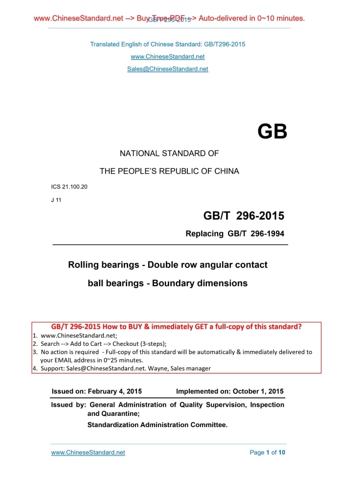 GB/T 296-2015: Rolling bearings - Double row angular contact ball bearings - Boundary dimensions Delivery: 9 seconds. True-PDF full-copy in English & invoice will be downloaded + auto-delivered via email. See step-by-step procedure Status: Valid GB/T 296: Historical versions