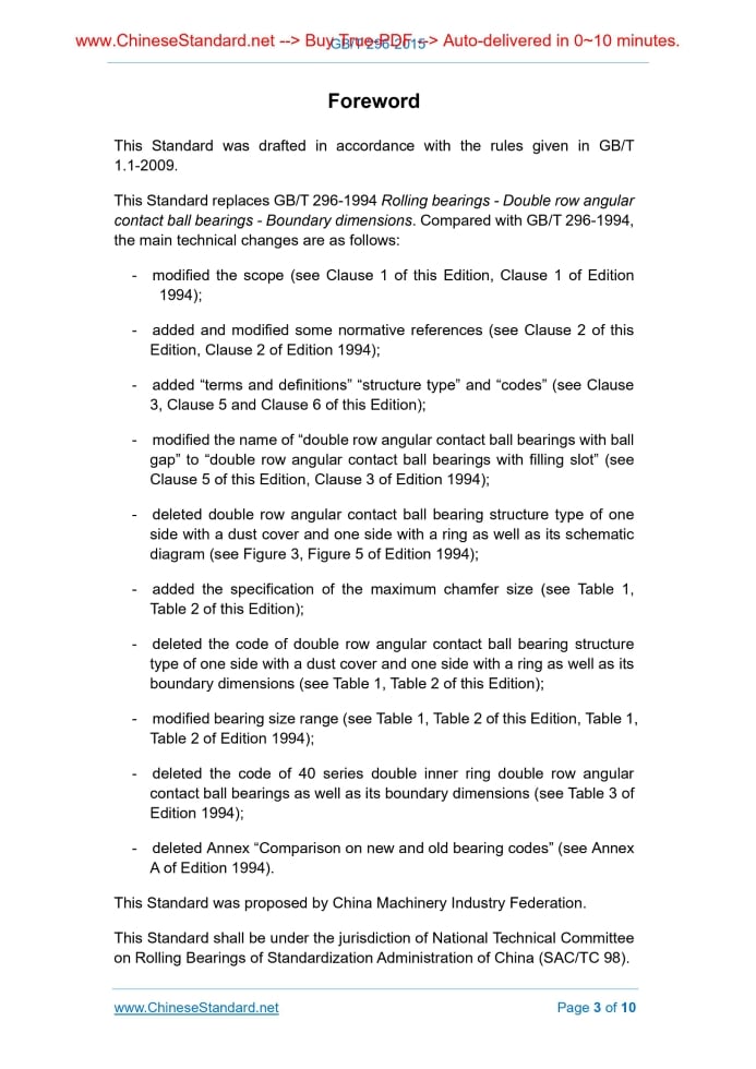 GB/T 296-2015: Rolling bearings - Double row angular contact ball bearings - Boundary dimensions---This is an excerpt. Full copy of true-PDF in English version (including equations, symbols, images, flow-chart, tables, and figures etc.), auto-downloaded/delivered in 9 seconds, can be purchased online: https://www.ChineseStandard.net/PDF.aspx/GBT296-2015 GB NATIONAL STANDARD OF THE PEOPLE’S REPUBLIC OF CHINA ICS 21.100.20 J 11 Replacing GB/T 296-1994 Rolling bearings - Double row angular contact ball bearings - Boundary dimensions 滚动轴承 双列角接触球轴承外形尺寸 Issued on: FEBRUARY 4, 2015 Implemented on: OCTOBER 1, 2015 Issued by. General Administration of Quality Supervision, Inspection and Quarantine; Standardization Administration Committee. Table of ContentsForeword ... 3 1 Scope ... 5 2 Normative references ... 5 3 Terms and definitions ... 5 4 Symbols... 5 5 Structure types ... 6 6 Codes ... 8 7 Marking example ... 8 8 Boundary dimensions ... 8 Bibliography ... 10ForewordThis Standard was drafted in accordance with the rules given in GB/T 1.1-2009. This Standard replaces GB/T 296-1994 Rolling bearings - Double row angular contact ball bearings - Boundary dimensions. Compared with GB/T 296-1994, the main technical changes are as follows. - modified the scope (see Clause 1 of this Edition, Clause 1 of Edition 1994); - added and modified some normative references (see Clause 2 of this Edition, Clause 2 of Edition 1994); - added “terms and definitions” “structure type” and “codes” (see Clause 3, Clause 5 and Clause 6 of this Edition); - modified the name of “double row angular contact ball bearings with ball gap” to “double row angular contact ball bearings with filling slot” (see Clause 5 of this Edition, Clause 3 of Edition 1994); - deleted double row angular contact ball bearing structure type of one side with a dust cover and one side with a ring as well as its schematic diagram (see Figure 3, Figure 5 of Edition 1994); - added the specification of the maximum chamfer size (see Table 1, Table 2 of this Edition); - deleted the code of double row angular contact ball bearing structure type of one side with a dust cover and one side with a ring as well as its boundary dimensions (see Table 1, Table 2 of this Edition); - modified bearing size range (see Table 1, Table 2 of this Edition, Table 1, Table 2 of Edition 1994); - deleted the code of 40 series double inner ring double row angular contact ball bearings as well as its boundary dimensions (see Table 3 of Edition 1994); - deleted Annex “Comparison on new and old bearing codes” (see Annex A of Edition 1994). This Standard was proposed by China Machinery Industry Federation. This Standard shall be under the jurisdiction of National Technical Committee on Rolling Bearings of Standardization Administration of China (SAC/TC 98). Rolling bearings - Double row angular contact ball bearings - Boundary dimensions1 ScopeThis Standard specifies the boundary dimensions of double row angular contact ball bearings, double row angular contact ball bearings with filling slot, double row angular contact ball bearings with dust covers at both sides, double row angular contact ball bearings with seal rings at both sides, double inner ring double row angular contact ball bearings (hereinafter referred to as “bearings”) which are in accordance with GB/T 273.3-2015. This Standard is applicable to bearing design and selection.2 Normative referencesThe following referenced documents are indispensable for the application of this document. For dated references, only the edition cited applies. For undated references, the latest edition of the referenced document (including any amendments) applies. GB/T 272-1993, Rolling bearing - Identification code GB/T 274-2000, Rolling bearings - Chamfer dimension - Maximum values GB/T 6930-2002, Rolling bearings - Vocabulary GB/T 7811-2007, Rolling bearings - Symbols for quantities JB/T 2974-2004, Rolling bearings - Identification code - Supplemental regulations3 Terms and definitionsThe terms and definitions specified in GB/T 6930-2002 apply to this Standard.4 SymbolsThe symbols given in GB/T 7811-2007 as well as the following ones apply to this document. ......Source: Above contents are excerpted from the full-copy PDF -- translated/reviewed by: www.ChineseStandard.net / Wayne Zheng et al. Tips & Frequently Asked Questions:Question 1: How long will the true-PDF of English version of GB/T 296-2015 be delivered?Answer: The full copy PDF of English version of GB/T 296-2015 can be downloaded in 9 seconds, and it will also be emailed to you in 9 seconds (double mechanisms to ensure the delivery reliably), with PDF-invoice.Question 2: Can I share the purchased PDF of GB/T 296-2015_English with my colleagues?Answer: Yes. The purchased PDF of GB/T 296-2015_English will be deemed to be sold to your employer/organization who actually paid for it, including your colleagues and your employer's intranet.Question 3: Does the price include tax/VAT?Answer: Yes. Our tax invoice, downloaded/delivered in 9 seconds, includes all tax/VAT and complies with 100+ countries' tax regulations (tax exempted in 100+ countries) -- See Avoidance of Double Taxation Agreements (DTAs): List of DTAs signed between Singapore and 100+ countriesQuestion 4: Do you accept my currency other than USD?Answer: Yes. www.ChineseStandard.us -- GB/T 296-2015 -- Click this link and select your country/currency to pay, the exact amount in your currency will be printed on the invoice. Full PDF will also be downloaded/emailed in 9 seconds.Question 5: Should I purchase the latest version GB/T 296-2015?Answer: Yes. Unless special scenarios such as technical constraints or academic study, you should always prioritize to purchase the latest version GB/T 296-2015 even if the enforcement date is in future. Complying with the latest version means that, by default, it also complies with all the earlier versions, technically.How t