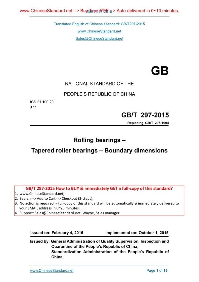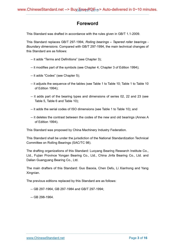 GB/T 297-2015: Rolling bearings - Tapered roller bearings - Boundary dimensions---This is an excerpt. Full copy of true-PDF in English version (including equations, symbols, images, flow-chart, tables, and figures etc.), auto-downloaded/delivered in 9 seconds, can be purchased online: https://www.ChineseStandard.net/PDF.aspx/GBT297-2015GB NATIONAL STANDARD OF THE PEOPLE’S REPUBLIC OF CHINA ICS 21.100.20 J 11 Replacing GB/T 297-1994 Rolling bearings – Tapered roller bearings – Boundary dimensions 滚动轴承 圆锥滚子轴承 外形尺寸 Issued on: FEBRUARY 4, 2015 Implemented on: OCTOBER 1, 2015 Issued by. General Administration of Quality Supervision, Inspection and Quarantine of the People's Republic of China; Standardization Administration of the People's Republic of China. Table of ContentsForeword ... 3 1 Scope ... 4 2 Normative references ... 4 3 Terms and definitions ... 4 4 Symbols ... 4 5 Codes ... 6 6 Designation example ... 6 7 Dimensions... 6ForewordThis Standard was drafted in accordance with the rules given in GB/T 1.1-2009. This Standard replaces GB/T 297-1994, Rolling bearings – Tapered roller bearings - Boundary dimensions. Compared with GB/T 297-1994, the main technical changes of this Standard are as follows. -- it adds “Terms and Definitions” (see Chapter 3); -- it modifies part of the symbols (see Chapter 4; Chapter 3 of Edition 1994); -- it adds “Codes” (see Chapter 5); -- it adjusts the sequence of the tables (see Table 1 to Table 10; Table 1 to Table 10 of Edition 1994); -- it adds part of the bearing types and dimensions of series 02, 22 and 23 (see Table 5, Table 6 and Table 10); -- it adds the serial codes of ISO dimensions (see Table 1 to Table 10); and -- it deletes the contrast between the codes of the new and old bearings (Annex A of Edition 1994). This Standard was proposed by China Machinery Industry Federation. This Standard shall be under the jurisdiction of the National Standardization Technical Committee on Rolling Bearings (SAC/TC 98). The drafting organizations of this Standard. Luoyang Bearing Research Institute Co., Ltd., Fujian Province Yongan Bearing Co., Ltd., China Jinfa Bearing Co., Ltd. and Dalian Guangyang Bearing Co., Ltd. The main drafters of this Standard. Guo Baoxia, Chen Defu, Li Xianhong and Yang Xingnian. The previous editions replaced by this Standard are as follows. -- GB 297-1964, GB 297-1984 and GB/T 297-1994; -- GB 298-1964. Rolling bearings – Tapered roller bearings – Boundary dimensions1 ScopeThis Standard specifies the boundary dimensions of single-row tapered roller bearings in accordance with GB/T 273.1-2011 (hereinafter referred to as bearings). This Standard applies to the design and selection of bearings.2 Normative referencesThe following referenced documents are indispensable for the application of this document. For dated references, only the edition dated applies to this document. For undated references, the latest edition of the referenced documents (including all amendments) applies to this Standard. GB/T 272-1993, Rolling bearing – Identification code GB/T 273.1-2011, Rolling bearings – Boundary dimensions general plan – Part 1. Tapered roller bearings GB/T 274-2000, Rolling bearings – Chamfer dimension – Maximum values GB/T 6930-2002, Rolling bearings – Vocabulary JB/T 2974-2004, Rolling bearings – Identification code – Supplemental regulations3 Terms and definitionsFor the purpose of this document, the terms and definitions defined in GB/T 6930-2002 shall apply.4 SymbolsThe following symbols apply to this document. Unless specified otherwise, the symbols in Figure 1 and the numerical values in Table 1 to Table 10 are all nominal dimensions. NOTE The figures are only structural examples; the bearings are not necessary to be identical to the structures in the figures, but they shall meet the dimensions specified. B. innder ring width. C. outer ring width. D. bearing outer diameter. d. bearing inner diameter. E. outer ring back inner diameter. r. inner ring back chamfer dimension. rsmin. inner ring back minimum single chamfer dimension. r1. outer ring back chamfer dimension. r1smin. outer ring back minimum single chamfer dimension. r2. front chamfer dimensions of outer ring and inner ring. T. bearing width. α. contact angle. ......Source: Above contents are excerpted from the full-copy PDF -- translated/reviewed by: www.ChineseStandard.net / Wayne Zheng et al. Tips & Frequently Asked Questions:Question 1: How long will the true-PDF of English version of GB/T 297-2015 be delivered?Answer: The full copy PDF of English version of GB/T 297-2015 can be downloaded in 9 seconds, and it will also be emailed to you in 9 seconds (double mechanisms to ensure the delivery reliably), with PDF-invoice.Question 2: Can I share the purchased PDF of GB/T 297-2015_English with my colleagues?Answer: Yes. The purchased PDF of GB/T 297-2015_English will be deemed to be sold to your employer/organization who actually paid for it, including your colleagues and your employer's intranet.Question 3: Does the price include tax/VAT?Answer: Yes. Our tax invoice, downloaded/delivered in 9 seconds, includes all tax/VAT and complies with 100+ countries' tax regulations (tax exempted in 100+ countries) -- See Avoidance of Double Taxation Agreements (DTAs): List of DTAs signed between Singapore and 100+ countriesQuestion 4: Do you accept my currency other than USD?Answer: Yes. www.ChineseStandard.us -- GB/T 297-2015 -- Click this link and select your country/currency to pay, the exact amount in your currency will be printed on the invoice. Full PDF will also be downloaded/emailed in 9 seconds.Question 5: Should I purchase the latest version GB/T 297-2015?Answer: Yes. Unless special scenarios such as technical constraints or academic study, you should always prioritize to purchase the latest version GB/T 297-2015 even if the enforcement date is in future. Complying with the latest version means that, by default