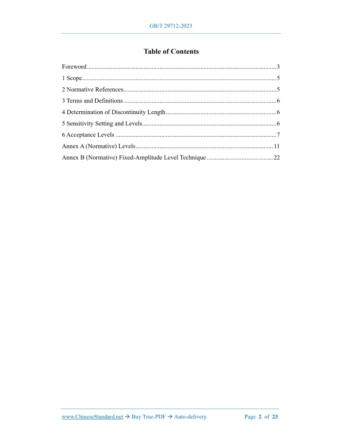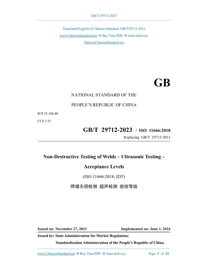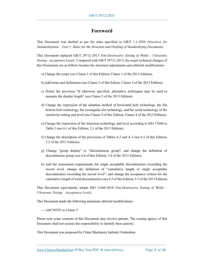 Similar standardsGB/T 29712-2023: Non-destructive testing of welds - Ultrasonic testing - Acceptance levels---This is an excerpt. Full copy of true-PDF in English version (including equations, symbols, images, flow-chart, tables, and figures etc.), auto-downloaded/delivered in 9 seconds, can be purchased online: https://www.ChineseStandard.net/PDF.aspx/GBT29712-2023GB NATIONAL STANDARD OF THE PEOPLE’S REPUBLIC OF CHINA ICS 25.160.40 CCS J 33 GB/T 29712-2023 / ISO 11666.2018 Replacing GB/T 29712-2013 Non-Destructive Testing of Welds – Ultrasonic Testing – Acceptance Levels (ISO 11666.2018, IDT) Issued on. NOVEMBER 27, 2023 Implemented on. JUNE 1, 2024 Issued by. State Administration for Market Regulation; Standardization Administration of the People’s Republic of China. Table of ContentsForeword... 3 1 Scope... 5 2 Normative References... 5 3 Terms and Definitions... 6 4 Determination of Discontinuity Length... 6 5 Sensitivity Setting and Levels... 6 6 Acceptance Levels... 7 Annex A (Normative) Levels... 11 Annex B (Normative) Fixed-Amplitude Level Technique... 22ForewordThis Document was drafted as per the rules specified in GB/T 1.1-2020 Directives for Standardization – Part 1.Rules for the Structure and Drafting of Standardizing Documents. This Document replaced GB/T 29712-2013 Non-Destructive Testing of Welds - Ultrasonic Testing - Acceptance Levels. Compared with GB/T 29712-2013, the major technical changes of this Documents are as follows besides the structural adjustments and editorial modifications. a) Change the scope (see Clause 1 of this Edition; Clause 1 of the 2013 Edition); b) Add terms and definitions (see Clause 3 of this Editon; Clause 3 of the 2013 Edition); c) Delete the provision "If otherwise specified, alternative techniques may be used to measure the display length" (see Clause 3 of the 2013 Edition); d) Change the expression of the adoption method of horizontal hole technology, the flat bottom hole technology, the rectangular slot technology, and the serial technology of the sensitivity setting and level (see Clause 5 of this Edition; Clause 4 of the 2013 Edition); e) Change the expression of the detection technology and level according to ISO 17640 in Table 1 (see 6.1 of this Edition; 5.1 of the 2013 Edition); f) Change the description of the provisions of Tables A.2 and A.3 (see 6.2 of this Edition; 5.2 of the 2013 Edition); g) Change "group display" to "discontinuous group"; and change the definition of discontinuous group (see 6.4 of this Edition; 5.4 of the 2013 Edition); h) Add the assessment requirements for single acceptable discontinuities exceeding the record level; change the definition of “cumulative length of single acceptable discontinuities exceeding the record level”; and change the acceptance criteria for the cumulative length of weld discontinuities (see 6.5 of this Edition; 5.5 of the 2013 Edition). This Document equivalently adopts ISO 11666.2018 Non-Destructive Testing of Welds – Ultrasonic Testing – Acceptance Levels. This Document made the following minimum editorial modifications. --- Add NOTE to Clause 5. Please note some contents of this Document may involve patents. The issuing agency of this Document shall not assume the responsibility to identify these patents. This Document was proposed by China Machinery Industry Federation. This Document shall be under the jurisdiction of National Technical Committee on Welding of Standardization Administration of China (SAC/TC 55). Drafting organizations of this Document. Shanghai Research Institute of Materials; China Special Equipment Inspection & Research Institute; Jiangsu Frontier Electric Technology Co., Ltd.; State Grid Zhejiang Electric Power Co., Ltd. Electric Power Research Institute; Shanghai Investigation, Design & Research Institute Co., Ltd.; Shandong Ruixiang Mould Co., Ltd.; Wuhan University; Jiangsu Province Special Equipment Safety Supervision and Inspection Institute; Harbin Welding Research Institute Co., Ltd.; and ZMD Co., Ltd. Chief drafting staffs of this Document. Sun Dan, Zheng Hui, Pan Zhixin, Zhao Zhoufeng, Liu Dongkun, Wei Zhongrui, Jiang Jiansheng, Ma Junpeng, Zhang Jun, Ma Xiangdong, Yang Qi, Wang Jiang, Zhang Xixi, Song Fei, Ma Jun, Xue Feng, Ding Jie, Wang Bing, Su Jinhua, and Zhang Zhaorui. This Document was first-time published in 2013; and it was first-time revised hereby. Non-Destructive Testing of Welds – Ultrasonic Testing – Acceptance Levels1 ScopeThis Document specifies two ultrasonic acceptance levels known as acceptance level 2 (AL 2) and acceptance level 3 (AL 3) for full penetration welded joints in ferritic steels, which correspond to ISO 5817.2014, quality levels B and C. An acceptance level corresponding to ISO 5817.2014, quality level D is not included in this document, as ultrasonic testing is generally not requested for this weld quality.2 Normative ReferencesThe provisions in following documents become the essential provisions of this Document through reference in this Document. For the dated documents, only the versions with the dates indicated are applicable to this Document; for the undated documents, only the latest version (including all the amendments) is applicable to this Document. ISO 5577 Non-destructive testing – Ultrasonic testing – Vocabulary3 Terms and DefinitionsFor the purposes of this Document, the terms and definitions given in ISO 5577 apply.4 Determination of Discontinuity LengthThe length of a discontinuity shall be determined by measuring the distance along the length over which the echo amplitude is above the evaluation level, using the fixed-amplitude level technique specified in Annex B.5 Sensitivity Setting and LevelsThe sensitivity setting shall be performed by one of the following techniques. For sensitivity setting and the subsequent testing, the same technique shall be used.6 Acceptance LevelsWhen detection of transverse discontinuities is specified, the acceptance levels stated in 6.2 apply. T