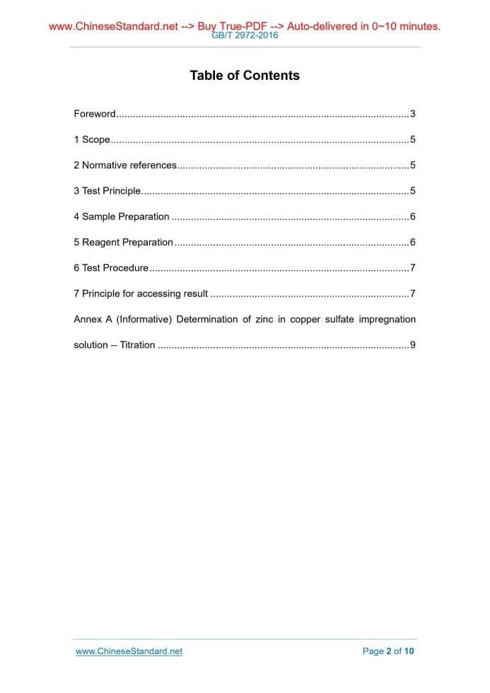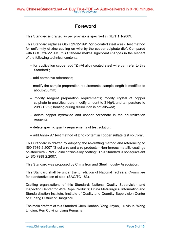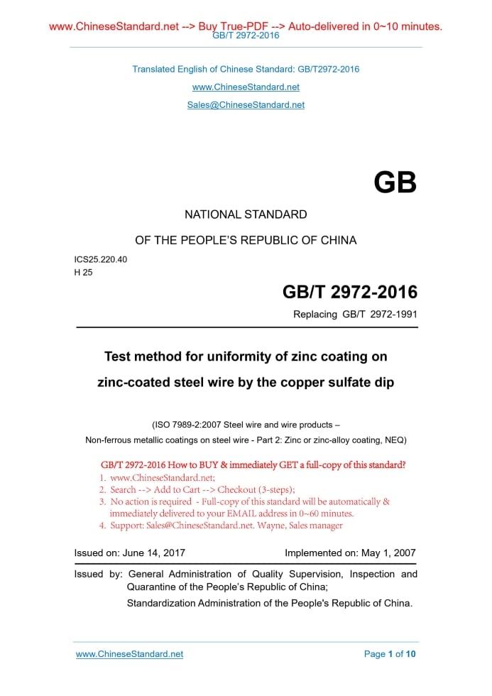 Similar standardsGB/T 2972-2016: Test method for uniformity of zinc coating on zinc-coated steel wire by the copper sulphate dip---This is an excerpt. Full copy of true-PDF in English version (including equations, symbols, images, flow-chart, tables, and figures etc.), auto-downloaded/delivered in 9 seconds, can be purchased online: https://www.ChineseStandard.net/PDF.aspx/GBT2972-2016 GB NATIONAL STANDARD OF THE PEOPLE’S REPUBLIC OF CHINA ICS25.220.40 H 25 Replacing GB/T 2972-1991 Test method for uniformity of zinc coating on zinc-coated steel wire by the copper sulfate dip (ISO 7989-2.2007 Steel wire and wire products – Non-ferrous metallic coatings on steel wire - Part 2. Zinc or zinc-alloy coating, NEQ) Issued on: JUNE 14, 2017 Implemented on: MAY 1, 2007 Issued by. General Administration of Quality Supervision, Inspection and Quarantine of the People’s Republic of China; Standardization Administration of the People's Republic of China. 3. No action is required - Full-copy of this standard will be automatically & immediately delivered to your EMAIL address in 0~60 minutes. Table of ContentsForeword ... 3 1 Scope ... 5 2 Normative references ... 5 3 Test Principle ... 5 4 Sample Preparation ... 6 5 Reagent Preparation ... 6 6 Test Procedure ... 7 7 Principle for accessing result ... 7 Annex A (Informative) Determination of zinc in copper sulfate impregnation solution -- Titration ... 9ForewordThis Standard is drafted as per provisions specified in GB/T 1.1-2009. This Standard replaces GB/T 2972-1991 “Zinc-coated steel wire - Test method for uniformity of zinc coating on wire by the copper sulphate dip”. Compared with GB/T 2972-1991, this Standard makes significant changes in the respect of the following technical contents. -- for application scope, add “Zn-Al alloy coated steel wire can refer to this Standard”; -- add normative references; -- modify the sample preparation requirements; sample length is modified to about-250mm; -- modify reagent preparation requirements; modify crystal of copper sulphate to analytical pure; modify amount to 314g/L and temperature to 20°C ± 2°C; heating during dissolution is not allowed; -- delete copper hydroxide and copper carbonate in the neutralization reagents; -- delete specific gravity requirements of test solution; -- add Annex A “Test method of zinc content in copper sulfate test solution”. This Standard is drafted by adopting the re-drafting method and referencing to ISO 7989-2.2007 “Steel wire and wire products - Non-ferrous metallic coatings on steel wire - Part 2. Zinc or zinc-alloy coating”. This Standard is not equivalent to ISO 7989-2.2007. This Standard was proposed by China Iron and Steel Industry Association. This Standard shall be under the jurisdiction of National Technical Committee for standardization of steel (SAC/TC 183). Drafting organizations of this Standard. National Quality Supervision and Inspection Center for Wire Rope Products; China Metallurgical Information and Standardization Institute; Institute of Quality and Quantity Supervision Center of Yuhang District of Hangzhou. The main drafters of this Standard Chen Jianhao, Yang Jinyan, Liu Aihua, Wang Lingjun, Ren Cuiying, Liang Pengshan. Test method for uniformity of zinc coating on zinc-coated steel wire by the copper sulfate dip1 ScopeThis Standard specifies the testing principle, sample preparation, reagent preparation, testing procedure and judgment principle for test method for uniformity of zinc coating on zinc-coated steel wire by the copper sulfate dip. This Standard is applicable to the uniformity test of zinc coating of hot-dip zinc- coated steel wire. For zinc-aluminum alloy coated steel wire and zinc- electroplated steel wire, it can also refer to this Standard.2 Normative referencesThe provisions of the following documents, through reference of this document, constitute the provisions of this document. For dated documents, only the dated editions are applicable to this document. For undated documents, the latest editions (including all amendments) are applicable to this document. GB/T 603 Chemical reagent - Preparations of reagent solutions for use in test methods GB/T 665 Chemical reagent - Copper (II) sulfate pentahydrate GB/T 674 Chemical reagent - Copper (II) oxide powder3 Test PrincipleDuring the pre-determined time, the zinc-coated steel wire sample is dipped into the copper sulphate solution once or several times, for carrying out the replacement reaction; the zinc coating is gradually dissolved. And finally, defects are revealed on the surface; judge the uniformity of the zinc coating. Note. This test is to reflect that the coating thickness may exist non-uniformity, therefore, even if the coating on unit area complies with relevant requirements, defects on coating surface can also be revealed.6 Test Procedure6.1 The samples after cleaning shall be immersed vertically in the center of the stationary test solution; the test solution must not be stirred. The samples must not be in contact with each other and shall not be in contact with the vessel wall. After immersion as per the time specified in steel wire product standard (30s or 60s), take out the sample smoothly; wash it in water immediately; use absorbent cotton, cloth or brush to remove the copper and its compounds that are attached to, but not yet firmly adhered, the surface of the zinc coating. During the test, the temperature is maintained at 20°C ± 2°C; record the actual temperature. 6.2 Repeat the immersion test in accordance with the above procedure, until metal copper which are firmly adhered to the surface of the sample is first-time appeared, or until reaching the immersion times as specified in wire product standard. After the last immersion test, the sample shall be washed under running water; use absorbent cotton and clean-soft cloth to clean-dry. 6.3 After multiple tests, when concentration of the dissolved zinc in solution exceeds 5g/L, the solution shall