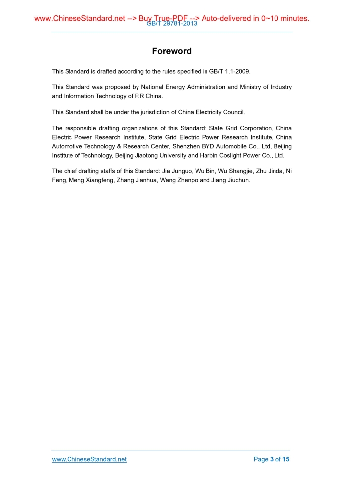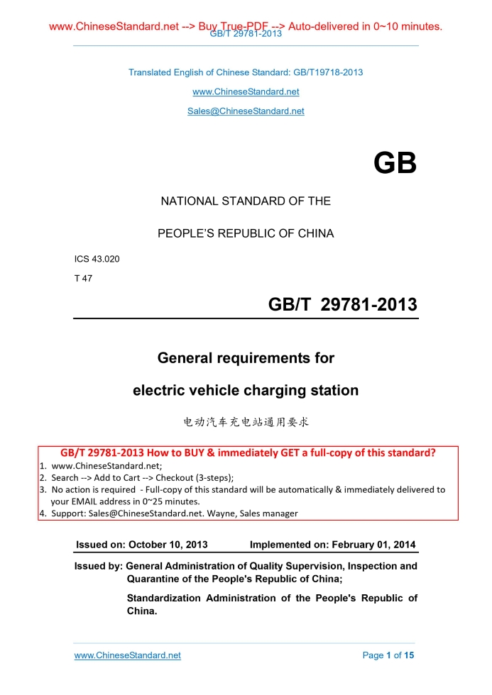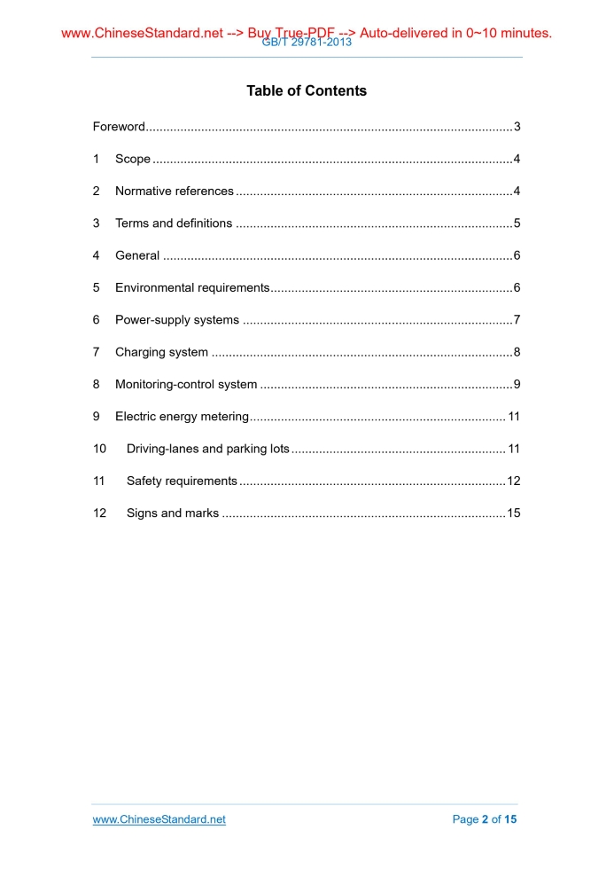Similar standardsGB/T 29781-2013: General requirements for electric vehicle charging station---This is an excerpt. Full copy of true-PDF in English version (including equations, symbols, images, flow-chart, tables, and figures etc.), auto-downloaded/delivered in 9 seconds, can be purchased online: https://www.ChineseStandard.net/PDF.aspx/GBT29781-2013GB NATIONAL STANDARD OF THE PEOPLE’S REPUBLIC OF CHINA ICS 43.020 T 47 General requirements for electric vehicle charging station Issued on. OCTOBER 10, 2013 Implemented on. FEBRUARY 01, 2014 Issued by. General Administration of Quality Supervision, Inspection and Quarantine of the People's Republic of China; Standardization Administration of the People's Republic of China. Table of ContentsForeword... 3 1 Scope... 4 2 Normative references... 4 3 Terms and definitions... 5 4 General... 6 5 Environmental requirements... 6 6 Power-supply systems... 7 7 Charging system... 8 8 Monitoring-control system... 9 9 Electric energy metering... 11 10 Driving-lanes and parking lots... 11 11 Safety requirements... 12 12 Signs and marks... 15ForewordThis Standard is drafted according to the rules specified in GB/T 1.1-2009. This Standard was proposed by National Energy Administration and Ministry of Industry and Information Technology of P.R China. This Standard shall be under the jurisdiction of China Electricity Council. The responsible drafting organizations of this Standard. State Grid Corporation, China Electric Power Research Institute, State Grid Electric Power Research Institute, China Automotive Technology & Research Center, Shenzhen BYD Automobile Co., Ltd, Beijing Institute of Technology, Beijing Jiaotong University and Harbin Coslight Power Co., Ltd. The chief drafting staffs of this Standard. Jia Junguo, Wu Bin, Wu Shangjie, Zhu Jinda, Ni Feng, Meng Xiangfeng, Zhang Jianhua, Wang Zhenpo and Jiang Jiuchun. General requirements for electric vehicle charging station1 ScopeThis Standard specifies the site-selection principles, power-supply system, charging system, monitoring-control system, electric energy metering, driving-lane, parking lot, safety requirements, signs and marks for electric vehicle charging station (hereinafter referred to as the charging station). This Standard applies to the charging station which adopts the whole-vehicle charging mode to perform the conductive charging mode to the power storage battery of electric vehicle.2 Normative referencesThe articles contained in the following documents have become part of this Standard when they are quoted herein. For the dated documents so quoted, all the modifications (including all corrections) or revisions made thereafter shall be applicable to this Standard. GB/T 14549-1993 Quality of electric energy supply - Harmonics in public supply network GB/T 18487.1 Electric vehicle conductive charging system - Part 1.General requirements GB 50016-2006 Code of design on building fire protection and prevention GB 50052 Code for design electric power supply systems GB 50053 Code for design of 20kV and below substation GB 50054 Code for design of low voltage electrical installations GB 50057 Design code for protection of structures against lightning GB 50058 Electrical installations design code for explosive atmospheres and fire hazard3 Terms and definitionsThe terms and definitions defined in GB/T 18487.1 AND the followings apply to this document. 3.1 AC charging spot AC power supply unit The special device which provides AC electric energy for the electric vehicle with vehicle-mounted charger by using conductive mode. 3.2 Off-board charger The special device which is fixedly mounted on the ground, converts the grid AC to DC, and charges the power storage battery for electric vehicle by using conductive mode. 3.3 Charging equipment The special equipment providing electric energy for the storage battery of electric vehicle, including AC charging spot, off-board charger and so on. 3.4 EV charging station The place where three or more EV chargers (with at least one off-board charger) are available and can carry out condition monitoring of the chargers during charging the electric vehicle.4 General4.1 The charging station shall provide a safe place for charging the power storage battery for electric vehicle, and monitor the charging equipment and the power storage batteries charged during the charging process, so as to ensure that the electric energy can be securely transmitted to the power storage battery.5 Environmental requirements5.1 The master planning of the charging station shall be coordinated with the local master planning and urban-rural planning, and shall comply with the requirements of environmental protection and fire safety. 5.3 The charging station within the urban area shall be close to the urban roads, but shall not be in the vicinity of the intersection of urban arterial roads and heavy traffic roads. 5.4 A reasonably safe distance between the charging station and important or personnel-intensive public buildings such as party and government office buildings, primary and secondary schools, kindergartens, outpatient building and inpatient buildings of hospitals, large libraries, cultural relics and historic sites, museums, large stadiums, movie theaters and so on. 5.5 The charging station shall be kept away from the place with potential hazards, and shall comply with relevant provisions of GB 50058 in the case of adjoining buildings with explosion or fire hazards. 5.9 The charging area shall be well ventilated. 5.10 For some areas where severe wet weather may occur, equipment and tools for monitoring and treatment of air humidity shall be available.6 Power-supply systems6.1 Layout requirements Following factors shall be considered for layout of transformer room, power distribution room and power distribution box within the charging station. 6.2 Technical requirements 6.2.1 Different power supply modes can be selected depending on the size, capacity and importance of charging st