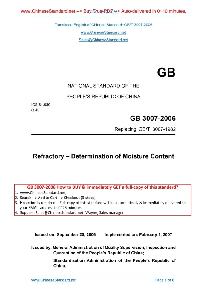 GB/T 3007-2006: Refractories -- Determination of moisture content Delivery: 9 seconds. True-PDF full-copy in English & invoice will be downloaded + auto-delivered via email. See step-by-step procedure Status: Obsolete GB/T 3007: Historical versions