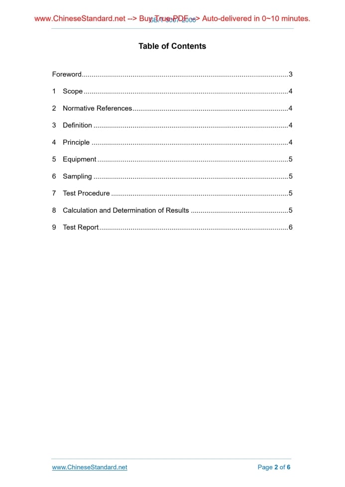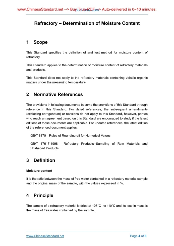 GB/T 3007-2006: Refractories -- Determination of moisture content---This is an excerpt. Full copy of true-PDF in English version (including equations, symbols, images, flow-chart, tables, and figures etc.), auto-downloaded/delivered in 9 seconds, can be purchased online: https://www.ChineseStandard.net/PDF.aspx/GBT3007-2006GB NATIONAL STANDARD OF THE PEOPLE’S REPUBLIC OF CHINA ICS 81.080 Q 40 GB 3007-2006 Replacing GB/T 3007-1982 Refractory – Determination of Moisture Content Issued on: SEPTEMBER 20, 2006 Implemented on: FEBRUARY 1, 2007 Issued by. General Administration of Quality Supervision, Inspection and Quarantine of the People's Republic of China; Standardization Administration of the People's Republic of China. Table of ContentsForeword... 3 1 Scope... 4 2 Normative References... 4 3 Definition... 4 4 Principle... 4 5 Equipment... 5 6 Sampling... 5 7 Test Procedure... 5 8 Calculation and Determination of Results... 5 9 Test Report... 6 Refractory – Determination of Moisture Content1 ScopeThis Standard specifies the definition of and test method for moisture content of refractory. This Standard applies to the determination of moisture content of refractory materials and products. This Standard does not apply to the refractory materials containing volatile organic matters under the measuring temperature.2 Normative ReferencesThe provisions in following documents become the provisions of this Standard through reference in this Standard. For dated references, the subsequent amendments (excluding corrigendum) or revisions do not apply to this Standard, however, parties who reach an agreement based on this Standard are encouraged to study if the latest editions of these documents are applicable. For undated references, the latest edition of the referenced document applies. GB/T 8170 Rules of Rounding off for Numerical Values GB/T 17617-1998 Refractory Products--Sampling of Raw Materials and Unshaped Products3 DefinitionMoisture content It is the ratio between the mass of free water contained in a refractory material sample and the original mass of the sample, with the values expressed in %.4 PrincipleThe sample of a refractory material is dried at 105°C to 110°C and its loss in mass is the mass of free water contained by the sample. ......Source: Above contents are excerpted from the full-copy PDF -- translated/reviewed by: www.ChineseStandard.net / Wayne Zheng et al. |