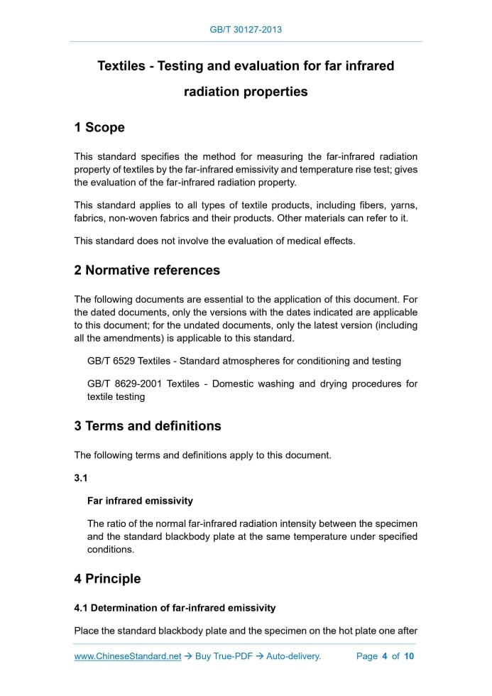Similar standardsGB/T 30127-2013: Textiles - Testing and evaluation for far infrared radiation properties---This is an excerpt. Full copy of true-PDF in English version (including equations, symbols, images, flow-chart, tables, and figures etc.), auto-downloaded/delivered in 9 seconds, can be purchased online: https://www.ChineseStandard.net/PDF.aspx/GBT30127-2013GB NATIONAL STANDARD OF THE PEOPLE’S REPUBLIC OF CHINA ICS 59.080.01 W 04 Textiles - Testing and evaluation for far infrared radiation properties Issued on. DECEMBER 17, 2013 Implemented on. DECEMBER 01, 2014 Issued by. General Administration of Quality Supervision, Inspection and Quarantine; Standardization Administration of PRC. Table of ContentsForeword... 3 1 Scope... 4 2 Normative references... 4 3 Terms and definitions... 4 4 Principle... 4 5 Instruments and tools... 5 6 Test environment and preparation... 7 7 Test procedure... 8 8 Result calculation and evaluation... 9 9 Test report... 10ForewordThis standard was drafted in accordance with the rules given in GB/T 1.1-2009. This standard was proposed by the China National Textile and Apparel Council. This standard shall be under the jurisdiction of the Basic Standards Subcommittee of the National Textile Standardization Technical Committee (SAC/TC 209/SC 1). Drafting organizations of this standard. National Textile Products Quality Supervision and Inspection Center, Taicang Jinhui Chemical Fiber Industrial Co., Ltd., Zhuhai Zhaotian Trading Co., Ltd. The main drafters of this standard. Yan Chunhong, Wu Jianchun, Wang Baojun, Shang Ling, Tan Hui, Xi Bin. Textiles - Testing and evaluation for far infrared radiation properties1 ScopeThis standard specifies the method for measuring the far-infrared radiation property of textiles by the far-infrared emissivity and temperature rise test; gives the evaluation of the far-infrared radiation property. This standard applies to all types of textile products, including fibers, yarns, fabrics, non-woven fabrics and their products. Other materials can refer to it. This standard does not involve the evaluation of medical effects.2 Normative referencesThe following documents are essential to the application of this document. For the dated documents, only the versions with the dates indicated are applicable to this document; for the undated documents, only the latest version (including all the amendments) is applicable to this standard. GB/T 6529 Textiles - Standard atmospheres for conditioning and testing GB/T 8629-2001 Textiles - Domestic washing and drying procedures for textile testing3 Terms and definitionsThe following terms and definitions apply to this document. 3.1 Far infrared emissivity The ratio of the normal far-infrared radiation intensity between the specimen and the standard blackbody plate at the same temperature under specified conditions.4 Principle4.1 Determination of far-infrared emissivity Place the standard blackbody plate and the specimen on the hot plate one after the other; adjust the surface temperature of the hot plate to the specified temperature in turn. 4.2 Determination of temperature rise After the far-infrared radiation source irradiates the specimen at a constant radiation intensity for a certain period of time, measure the temperature rise value of the test surface of the specimen.5 Instruments and tools5.1 Far-infrared emissivity test device. The schematic diagram of the textile far- infrared emissivity tester is as shown in Figure 1.The main parameters shall meet the following conditions. 5.2 Far-infrared radiation temperature rise detection device. All components are installed on a stable frame. The schematic diagram of the structure is as shown in Figure 2.The main parameters shall meet the following conditions. 5.3 An open cylindrical metal container which has a diameter of 60 mm and a height of 30 mm. 5.4 For the yarn specimen frame, the effective test size shall not be less than the size of test hot plate.6 Test environment and preparation6.1 Specimen humidity conditioning and environmental requirements The humidity shall be conditioned in accordance with the standard atmospheric temperature and humidity environment and procedures as specified in GB/T 6529; there shall be no other heat radiation sources affecting it. 6.2 Pretreatment 6.3 Preparation of specimen 6.3.1 Fiber When measuring the far-infrared emissivity, open the fiber specimen into a fluffy state; take 0.5 g of fiber and fill it into an open cylindrical metal container which has a diameter of 60 mm and a height of 30 mm. The fiber is completely filled in the container; take at least 3 specimens from each set of sample. When determining the temperature rise, comb the fibers into a fluffy state; evenly spread it to a uniform cylindrical flocculus which has a thickness of about 30 mm and a diameter of more than 60 mm. Take at least 3 specimens from each set of samples. 6.3.3 Sheet samples such as fabrics Cut at least 3 specimens for emissivity and temperature rise from each sample. The size of the specimen is not less than 60 mm in diameter. The specimen shall be flat and representative when sampling.7 Test procedure7.1 Determination of far-infrared emissivity 7.1.1 Heat the test hot plate to 34 °C 7.1.2 Place the standard blackbody plate on the test hot plate; record the far- infrared radiation intensity of the standard blackbody I0 after the test value is stable. 7.1.4 Test the remaining specimens according to the steps in 7.1.3. 7.2 Test of far-infrared radiation temperature rise 7.2.1 Adjust the distance between the specimen holder and the radiation source, so that the distance between the specimen surface and the radiation source is 500 mm. 7.2.2 Clamp the test surface of the humidity-conditioned specimen in the specimen holder facing the infrared radiation source. Fix the contact of the thermometer sensor at the center of the surface of the irradiated area of the specimen. 7.2.3 Record the initial temperature of the sample surfac