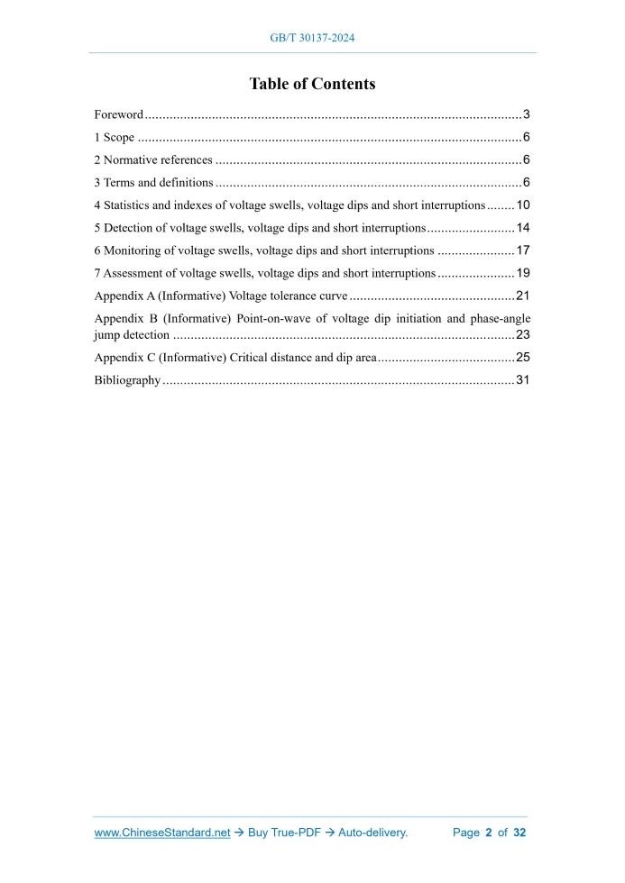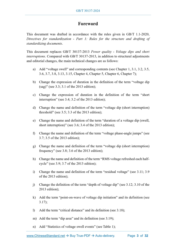 Similar standardsGB/T 30137-2024: Power quality - Voltage swell, voltage dips and short interruptions---This is an excerpt. Full copy of true-PDF in English version (including equations, symbols, images, flow-chart, tables, and figures etc.), auto-downloaded/delivered in 9 seconds, can be purchased online: https://www.ChineseStandard.net/PDF.aspx/GBT30137-2024GB NATIONAL STANDARD OF THE PEOPLE’S REPUBLIC OF CHINA ICS 29.020 CCS K 04 Replacing GB/T 30137-2013 Power quality - Voltage swell, voltage dips and short interruptions Issued on. DECEMBER 31, 2024 Implemented on. APRIL 01, 2025 Issued by. State Administration for Market Regulation; Standardization Administration of the People’s Republic of China. Table of ContentsForeword... 3 1 Scope... 6 2 Normative references... 6 3 Terms and definitions... 6 4 Statistics and indexes of voltage swells, voltage dips and short interruptions... 10 5 Detection of voltage swells, voltage dips and short interruptions... 14 6 Monitoring of voltage swells, voltage dips and short interruptions... 17 7 Assessment of voltage swells, voltage dips and short interruptions... 19 Appendix A (Informative) Voltage tolerance curve... 21 Appendix B (Informative) Point-on-wave of voltage dip initiation and phase-angle jump detection... 23 Appendix C (Informative) Critical distance and dip area... 25 Bibliography... 311 ScopeThis document specifies the indexes and statistical, test, monitoring and assessment methods for voltage swell, voltage dip and short interruption in the electric power system. This document is applicable to 50 Hz AC power systems.2 Normative referencesThe following documents, in whole or in part, are normatively referenced in this document and are indispensable for its application. For dated references, only the edition cited applies. For undated references, the latest edition of the referenced document (including any amendments) applies. GB/T 19862, General requirements for monitoring equipments of power quality GB/T 17626.30, Electromagnetic compatibility - Testing and measurement techniques - Part 30.Power quality measurement methods3 Terms and definitionsFor the purposes of this document, the following terms and definitions apply. 3.1 voltage swell A phenomenon that the r.m.s. voltage at a certain point in the power system suddenly rises to 1.1 p.u. ~ 1.8 p.u. and returns to normal after a short period of 10 ms ~ 1 min. 3.2 magnitude of voltage swell The maximum value of the r.m.s. voltage during a voltage swell. 3.3 voltage dip; voltage sag A phenomenon that the r.m.s. voltage at a certain point in the power system suddenly drops to 0.1 p.u ~ 0.9 p.u. and returns to normal after a short period of 10 ms ~ 1 min. 3.4 short interruption A phenomenon that the r.m.s. voltage at a certain point in the power system suddenly drops to below 0.1 p.u. and returns to normal after a short period of 10 ms ~ 1 min. 3.5 threshold The voltage threshold value used to determine the start and end of a voltage swell, voltage dip or short interruption. 3.6 duration The time taken from the start to the end of a voltage swell, voltage dip or short interruption event. 3.7 phase-angle jump The sudden change in the relative position of the voltage and/or current waveform on the time axis before and after a voltage swell or voltage dip event occurs, expressed in degrees or radians. 3.8 frequency; occurrence frequency The number of voltage swells, voltage dips, or short interruptions that occur within a specified period of time. 3.9 r.m.s. voltage refreshed each half-cycle Urms(1/2) The measured value of r.m.s. voltage whose measurement data window is one cycle, starting from the zero crossing point of the fundamental wave and updated every half cycle. 3.10 r.m.s. voltage refreshed each cycle Urms(1) The measured value of r.m.s. voltage whose measurement data window is one cycle, which is updated once every cycle. 3.11 residual voltage Ures The minimum value of the r.m.s. voltage during a voltage dip or short interruption. 3.12 depth of voltage dip The difference between the reference voltage and the residual voltage. Note. Reference voltage usually refers to nominal voltage or sliding reference voltage, the former of which generally refers to the nominal voltage of the system. If, according to the agreement between the supplier and the customer, the voltage applied to the terminal is different from the nominal voltage, this voltage is the nominal supply voltage. 3.13 system average r.m.s. frequency index SARFI index The average number of voltage swell, voltage dip or short interruption events in a system or a single measuring point, which is the main quantitative index used to reflect the frequency of voltage swells, voltage dips or short interruptions in a system or a single measuring point within a specific time. 3.14 declared input voltage Udin The voltage value determined by dividing the system nominal voltage by the voltage transformer ratio. 3.15 sliding reference voltage Usr The average voltage magnitude within a specific time period, which is used to indicate the voltage before a voltage change event (such as voltage dip, voltage swell, and rapid voltage change). [Source. GB/T 17626.30-2023, 3.29, modified] 3.16 hysteresis voltage The difference between the start voltage threshold and the end voltage threshold. Note 1.The definition of hysteresis in this document is related to power quality measurement parameters. This definition is different from the definition in IEC 60050, which is related to the core saturation. Note 2.The purpose of introducing the hysteresis term in power quality measurement is to avoid multiple counting of events when the magnitude of the parameter oscillates around the threshold range.4 Statistics and indexes of voltage swells, voltage dips andshort interruptions 4.1 Statistics of voltage swells, voltage dips and short interruptions The voltage swell, voltage dip and short interruption statistics table, which can intuitively reflec
