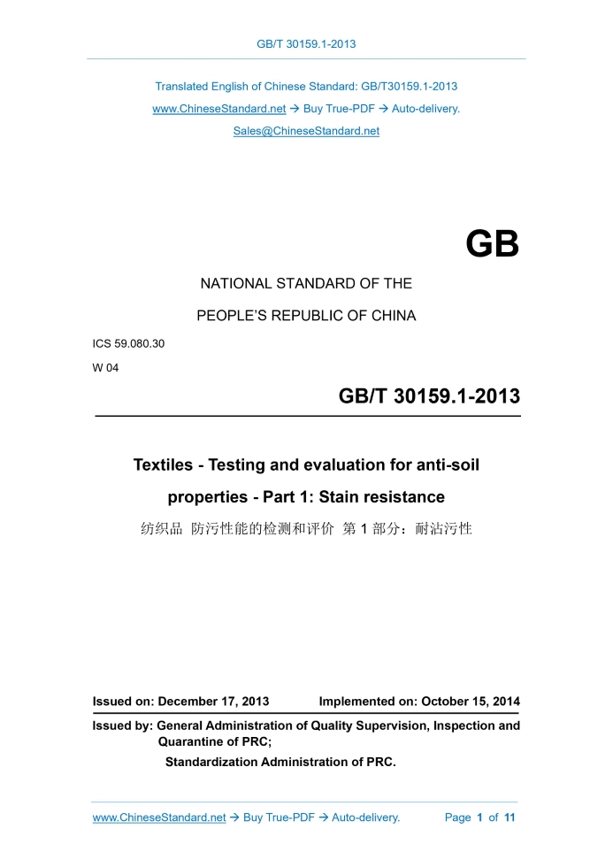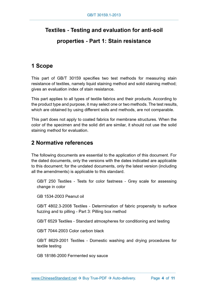 GB/T 30159.1-2013: Textiles - Testing and evaluation for anti-soil properties - Part 1: Stain resistance Delivery: 9 seconds. True-PDF full-copy in English & invoice will be downloaded + auto-delivered via email. See step-by-step procedure Status: Valid
