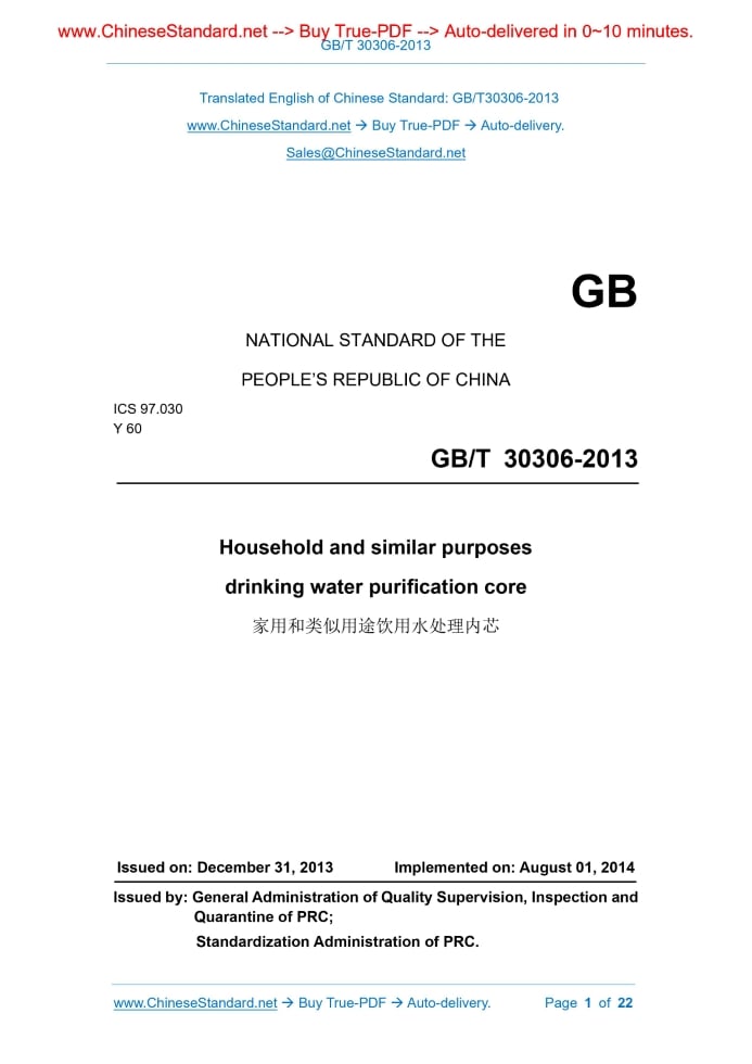 GB/T 30306-2013: Household and similar purposes drinking water purification core Delivery: 9 seconds. True-PDF full-copy in English & invoice will be downloaded + auto-delivered via email. See step-by-step procedure Status: Valid GB/T 30306: Historical versions