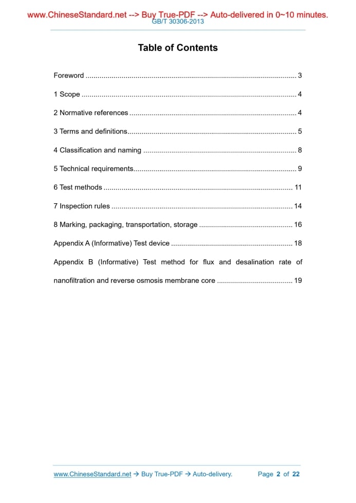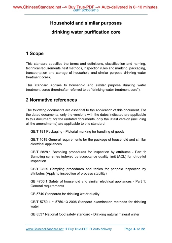 Similar standardsGB/T 30306-2013: Household and similar purposes drinking water purification core---This is an excerpt. Full copy of true-PDF in English version (including equations, symbols, images, flow-chart, tables, and figures etc.), auto-downloaded/delivered in 9 seconds, can be purchased online: https://www.ChineseStandard.net/PDF.aspx/GBT30306-2013NATIONAL STANDARD OF THE PEOPLE’S REPUBLIC OF CHINA ICS 97.030 Y 60 Household and similar purposes drinking water purification core Issued on: DECEMBER 31, 2013 Implemented on: AUGUST 01, 2014 Issued by. General Administration of Quality Supervision, Inspection and Quarantine of PRC; Standardization Administration of PRC. Table of ContentsForeword... 3 1 Scope... 4 2 Normative references... 4 3 Terms and definitions... 5 4 Classification and naming... 8 5 Technical requirements... 9 6 Test methods... 11 7 Inspection rules... 14 8 Marking, packaging, transportation, storage... 16 Appendix A (Informative) Test device... 18 Appendix B (Informative) Test method for flux and desalination rate of nanofiltration and reverse osmosis membrane core... 19 Household and similar purposes drinking water purification core1 ScopeThis standard specifies the terms and definitions, classification and naming, technical requirements, test methods, inspection rules and marking, packaging, transportation and storage of household and similar purpose drinking water treatment cores. This standard applies to household and similar purpose drinking water treatment cores (hereinafter referred to as “drinking water treatment core”).2 Normative referencesThe following documents are essential to the application of this document. For the dated documents, only the versions with the dates indicated are applicable to this document; for the undated documents, only the latest version (including all the amendments) are applicable to this standard. GB/T 191 Packaging - Pictorial marking for handling of goods GB/T 1019 General requirements for the package of household and similar electrical appliances GB/T 2828.1 Sampling procedures for inspection by attributes - Part 1. Sampling schemes indexed by acceptance quality limit (AQL) for lot-by-lot inspection GB/T 2829 Sampling procedures and tables for periodic inspection by attributes (Apply to inspection of process stability) GB 4706.1 Safety of household and similar electrical appliances - Part 1. General requirements GB 5749 Standards for drinking water quality GB/T 5750.1 ~ 5750.13-2006 Standard examination methods for drinking water GB 8537 National food safety standard - Drinking natural mineral water 3.5 Microfiltration The process of using pressure as a driving force to separate particles within 0.1 μm ~ 1 μm, abbreviated as MF. 3.6 Ultrafiltration The physical screening process of using the pressure difference as a driving force to separate a molecular weight which ranges from several hundred to several millions at a membrane pore size of about 0.001 μm ~ 0.2 μm, abbreviated as UF. 3.7 Nanofiltration The membrane separation process of using pressure as the driving force to remove the divalent or higher polyvalent ions as well as the organic matter which has a molecular weight of 200 or more, abbreviated as NF. 3.8 Reverse osmosis The process of applying an external pressure higher than the osmotic pressure of the solution to the water inlet side of the membrane, which only allows the water and some components in the solution to selectively permeate, whilst the other substances are not permeable and are trapped on the surface of the membrane, abbreviated as RO. 3.9 Rate of rejection The mass ratio of the specific component as retained by the core of membrane to the total mass of this component in the solution. 3.10 Mineralization The process of adding one or several mineral components beneficial to the human body to the water. 3.11 3.18 Purified water flow rate Under the specified operating conditions, the amount of water produced per nominal unit time of the manufacturer, expressed in liters per hour (L/h). 3.19 Total production capacity Under the specified operating conditions, when the effluent quality of the drinking water treatment device meets the requirements and the purified water flow rate is not less than the nominal purified water flow rate, the accumulated water production when any of the purification units are regenerated or replaced, in liters (L).4 Classification and naming4.1 Classification It is classified as follows according to the principle of water treatment. a) Coarse filter core (CX). The core with coarse filter function, including the core which uses quartz sand, anthracite, natural manganese sand, ceramic, PP cotton, etc. as the filter material. b) Membrane core (MX). The core mainly composed of membrane elements, including microfiltration (MF) core, ultrafiltration (UF) core, nanofiltration (NF) core, reverse osmosis (RO) core, etc. c) Adsorption core (XX). The core with adsorption function, including the core which uses granular activated carbon (GAC), solid activated carbon (SAC), fiber activated carbon (FAC), adsorption resin, ceramic particles and the like as the filter materials. d) Mineralized core (KX). The core with mineralization function, mainly including the core which uses the mineralized ball (MB), medical stone (MS) and the like as the filter materials. e) Ion exchange core (LX). The core capable of reversible exchange with ions in water, including the core which uses anion exchange resin or cation exchange resin as the filter materials. f) Composite core (FX). The core which has two or more functions. g) Other cores (QX). Cores other than the above functions, including cores 5.3.2 The materials and components of drinking water treatment core which are exposed to water shall comply with the requirements of GB/T 17219. 5.3.3 The hygiene safety of the core shall meet the relevant requirements of the national health management department. 5.4 Electrical safety The safety of th